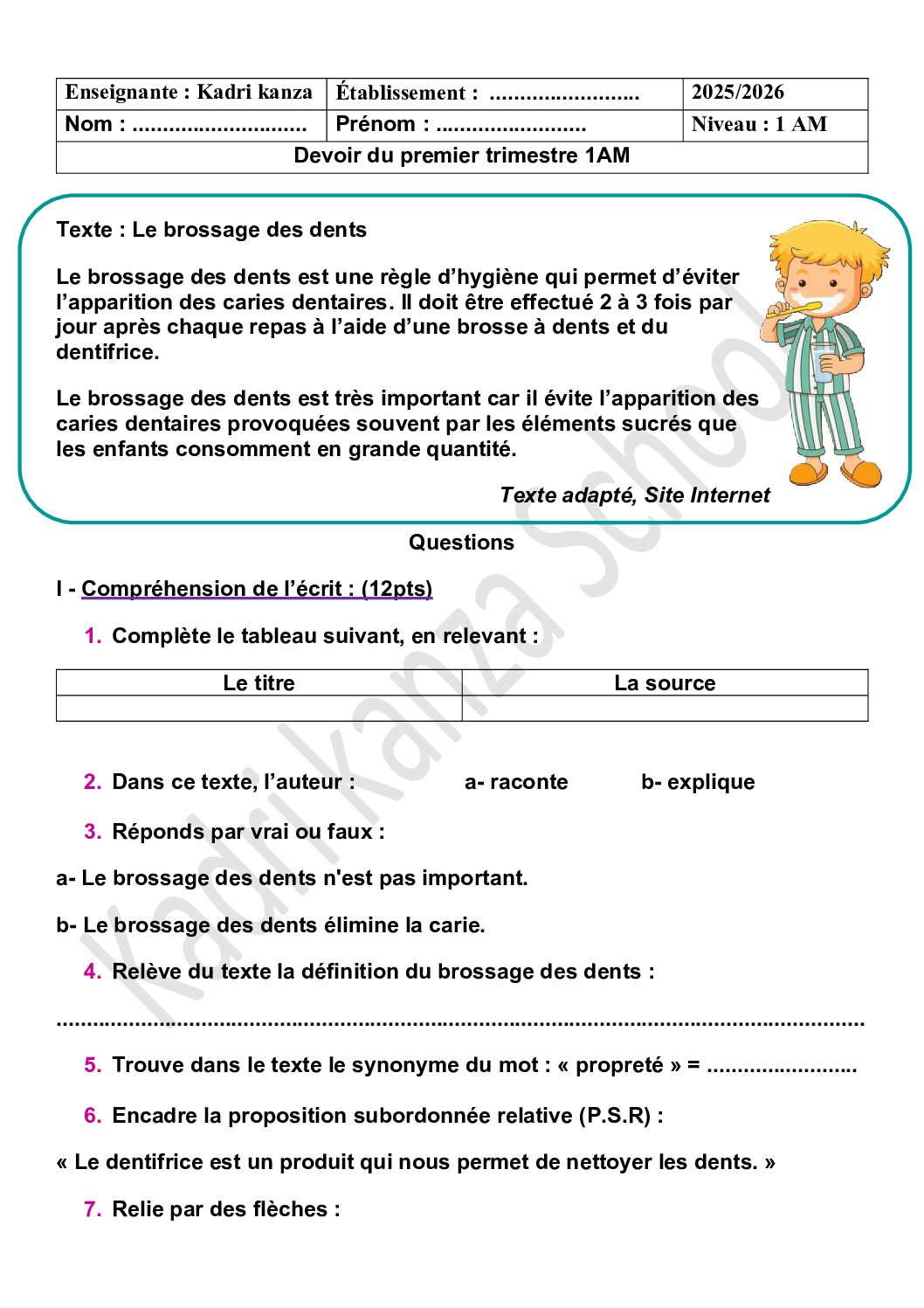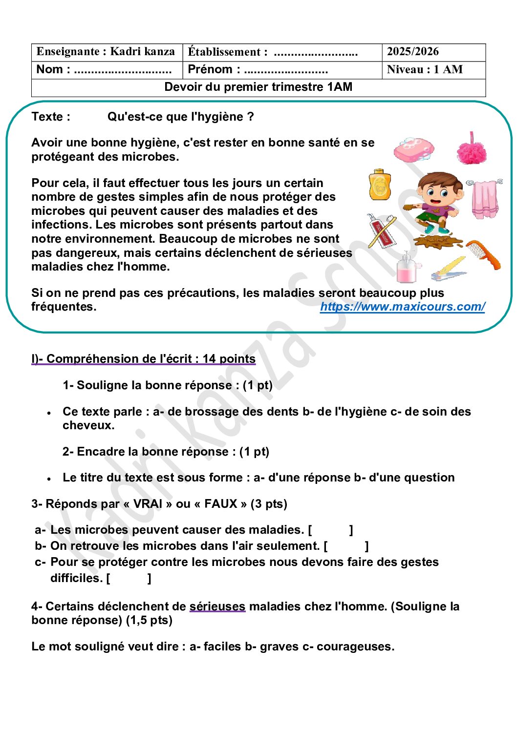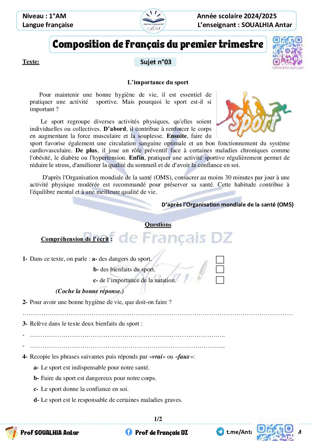 فرض في اللغة الفرنسية الفصل الأول السنة الأولى متوسط رقم 71 مع التصحيح