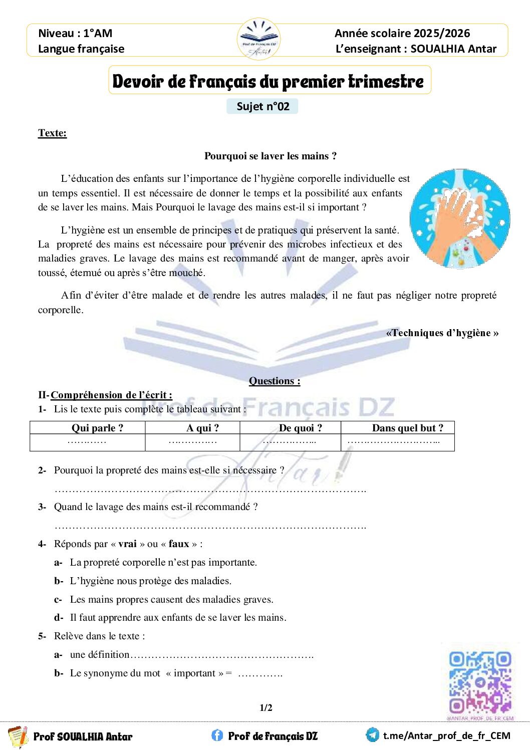 أكمل القراءة »فرض في اللغة الفرنسية الفصل الأول السنة الأولى متوسط رقم 70 مع التصحيح