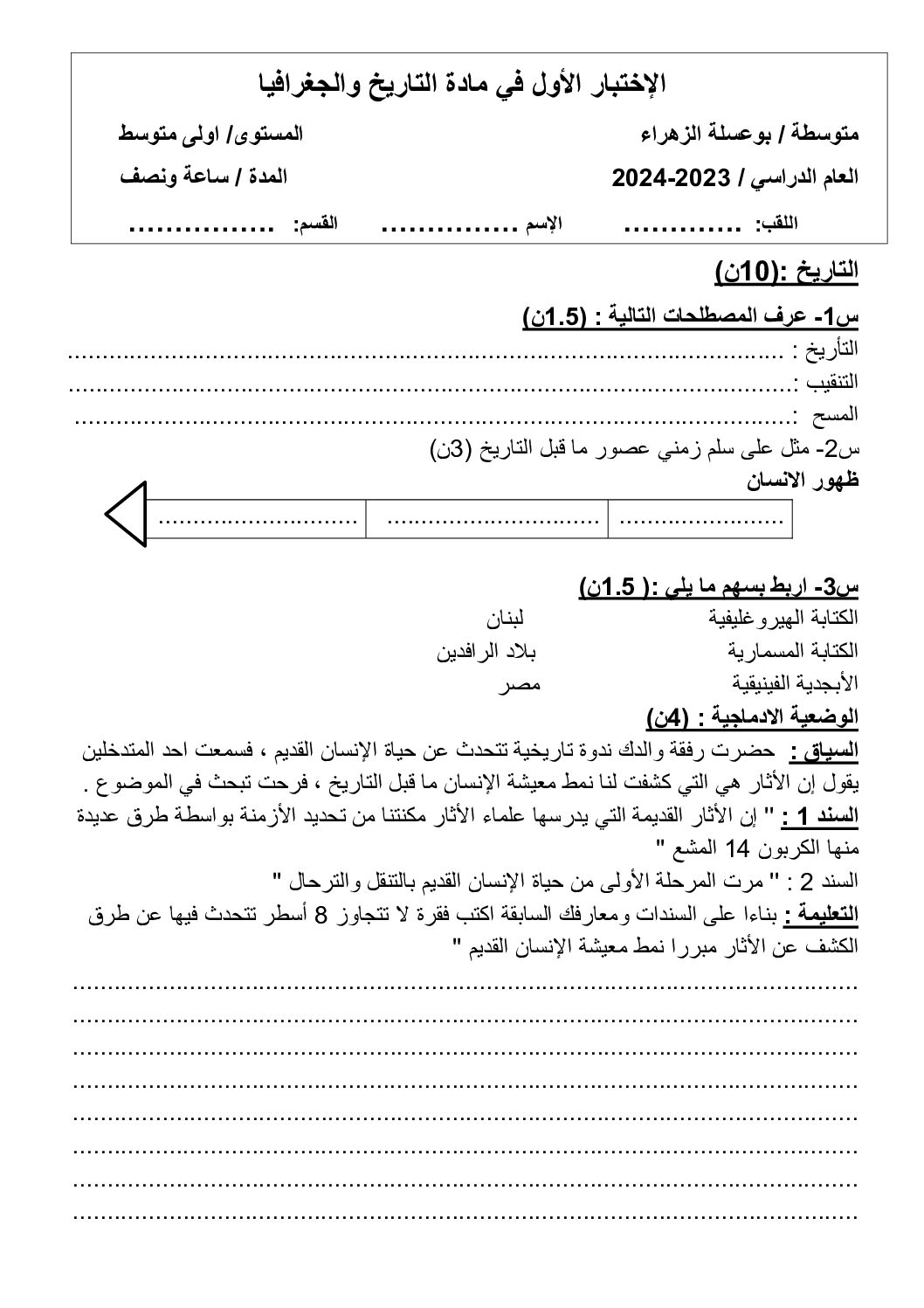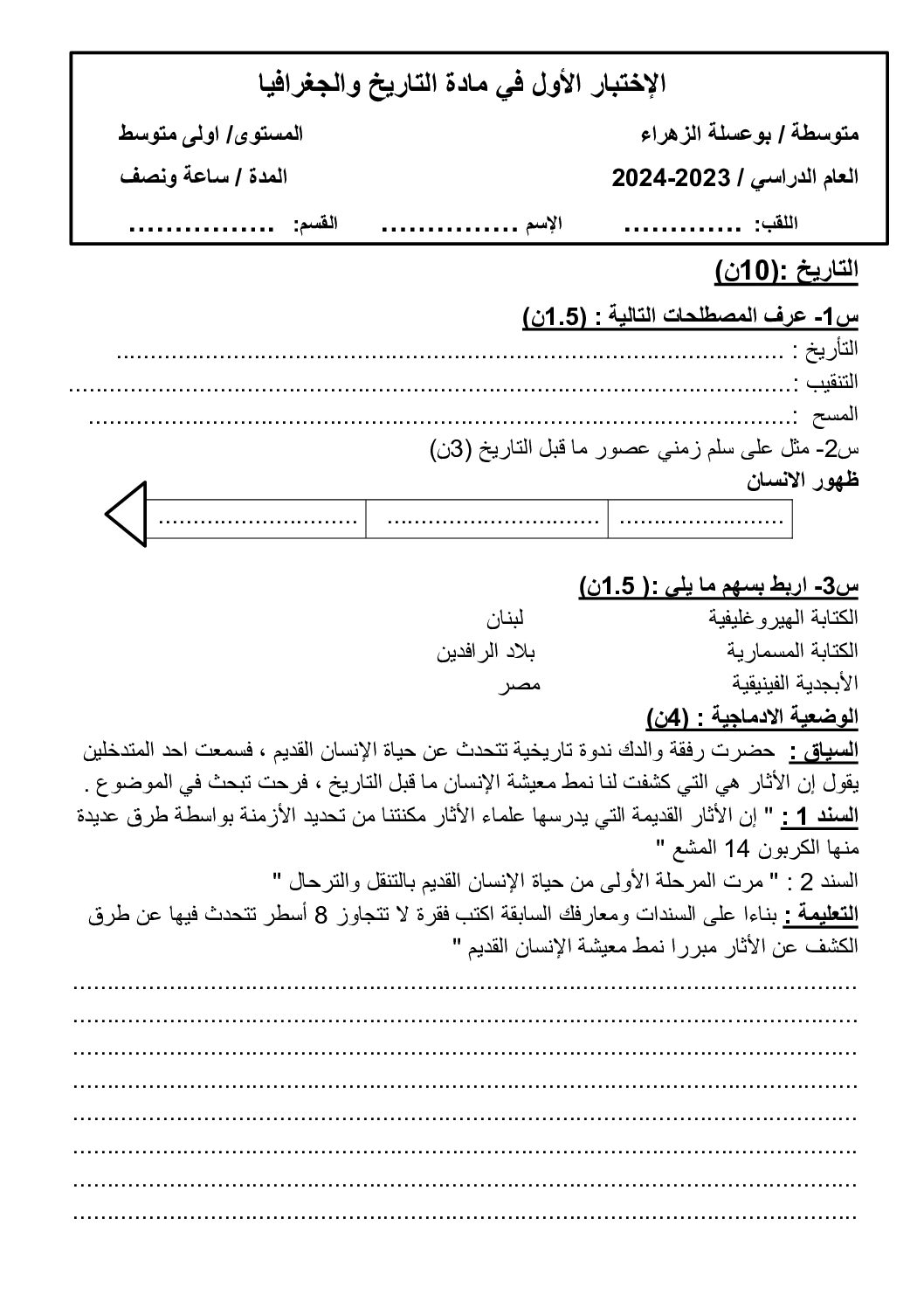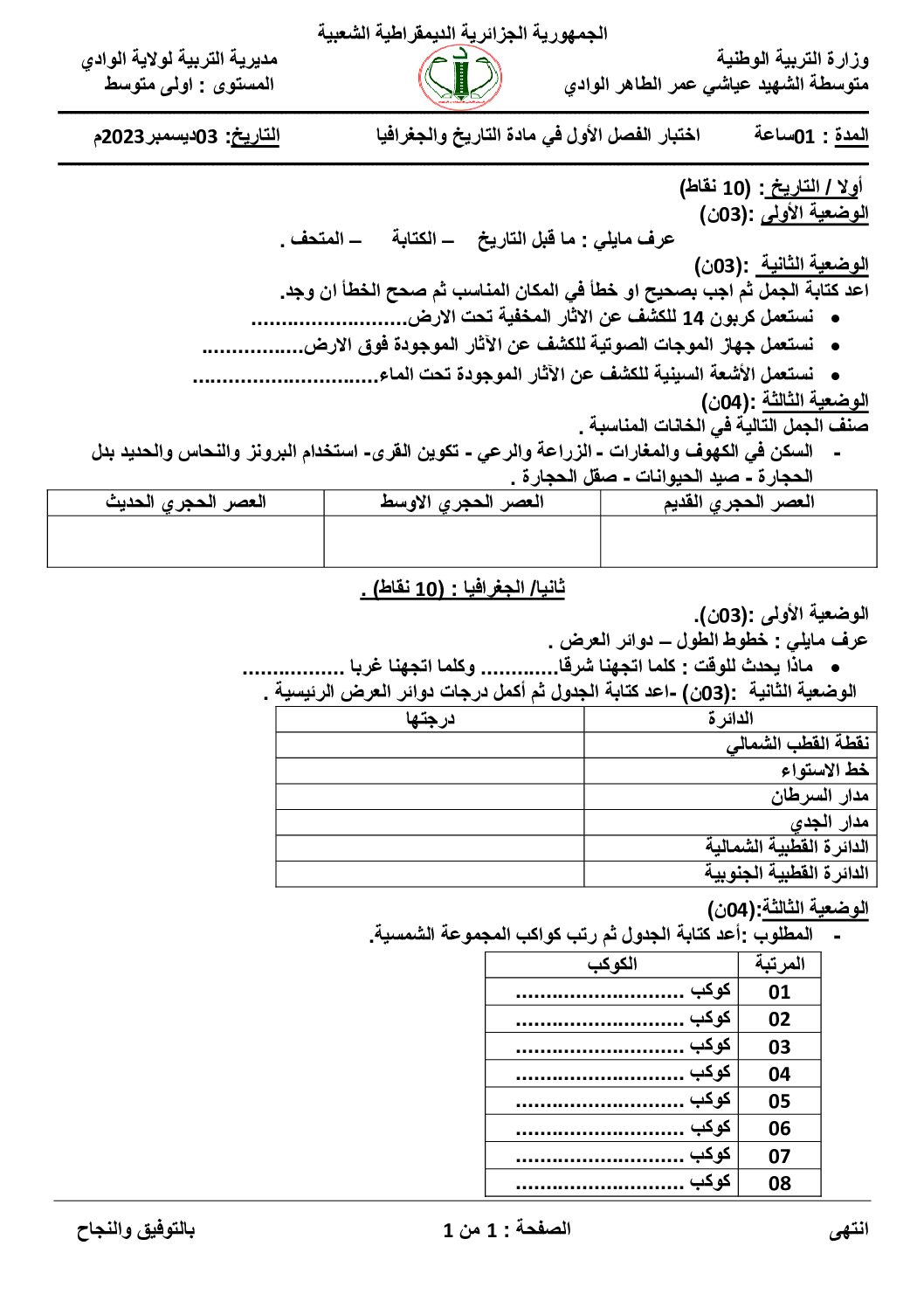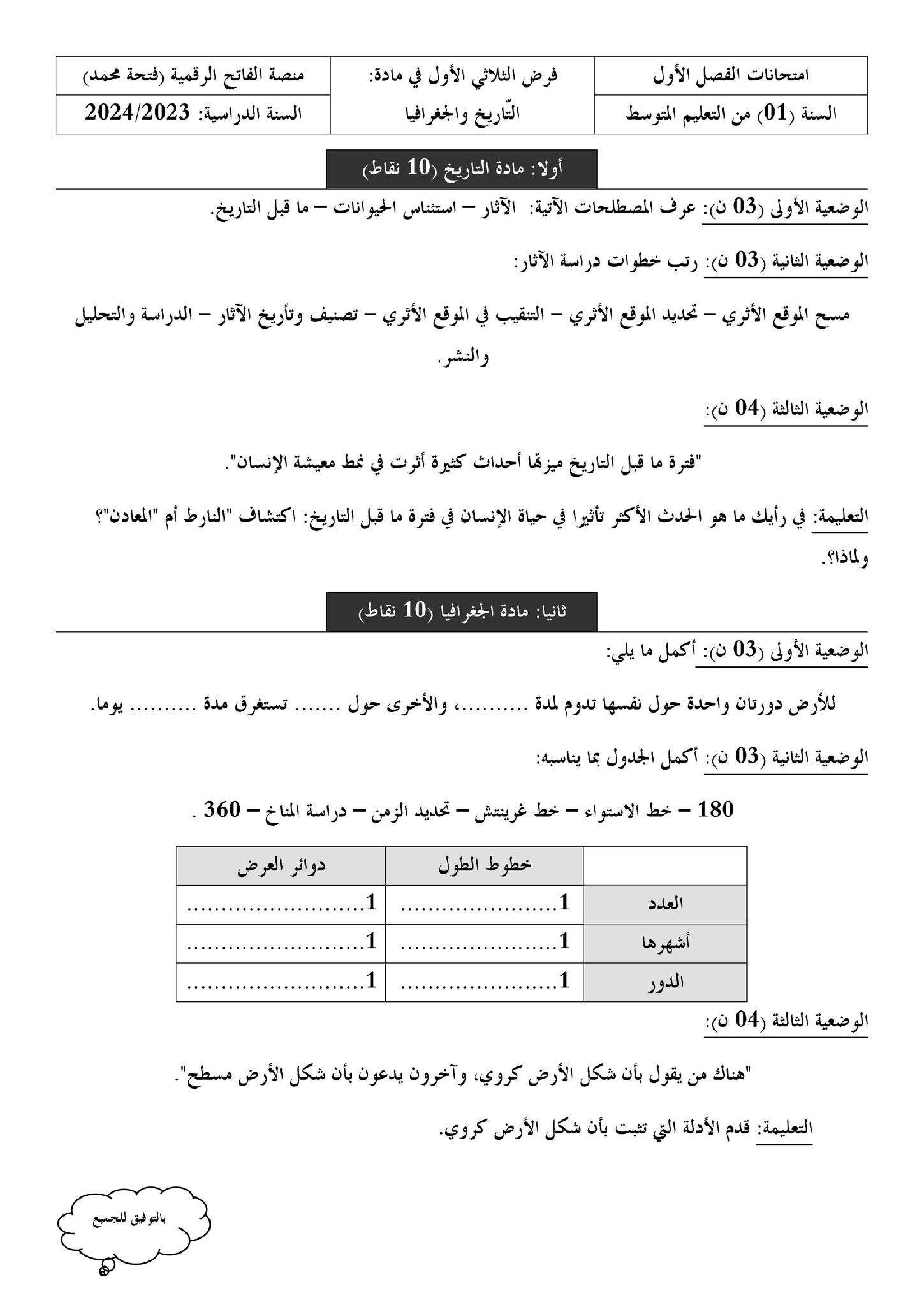 اختبار في التاريخ والجغرافيا الفصل الأول السنة الأولى متوسط رقم 45 مع التصحيح