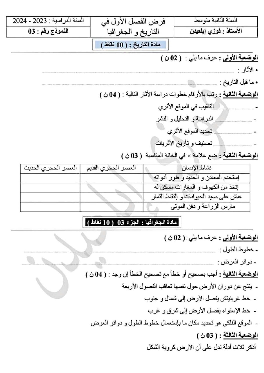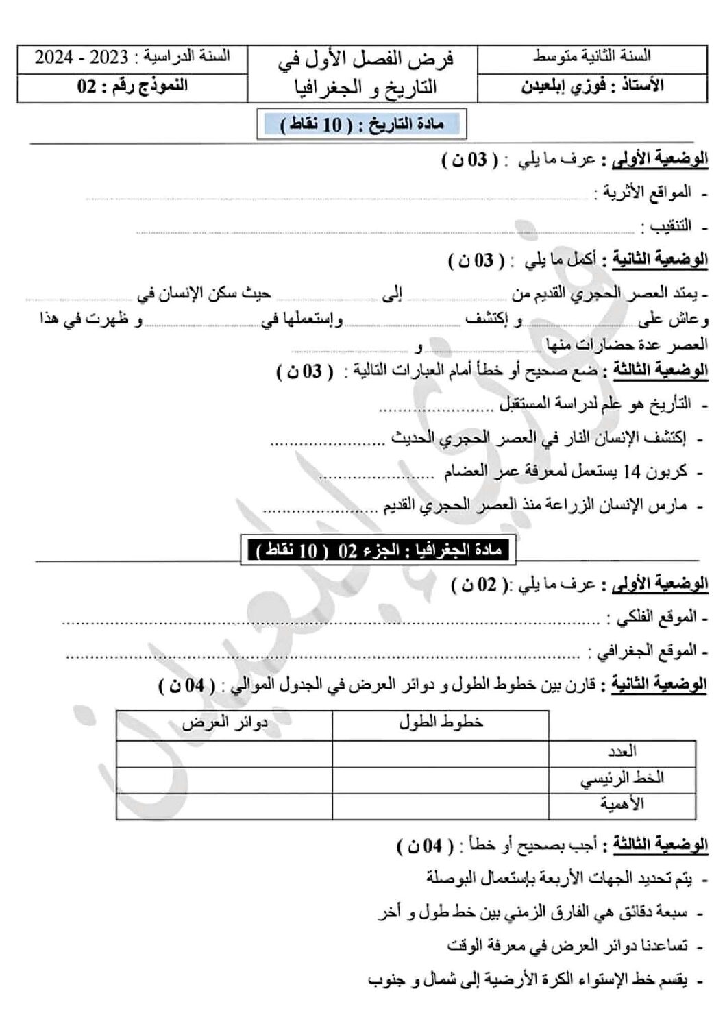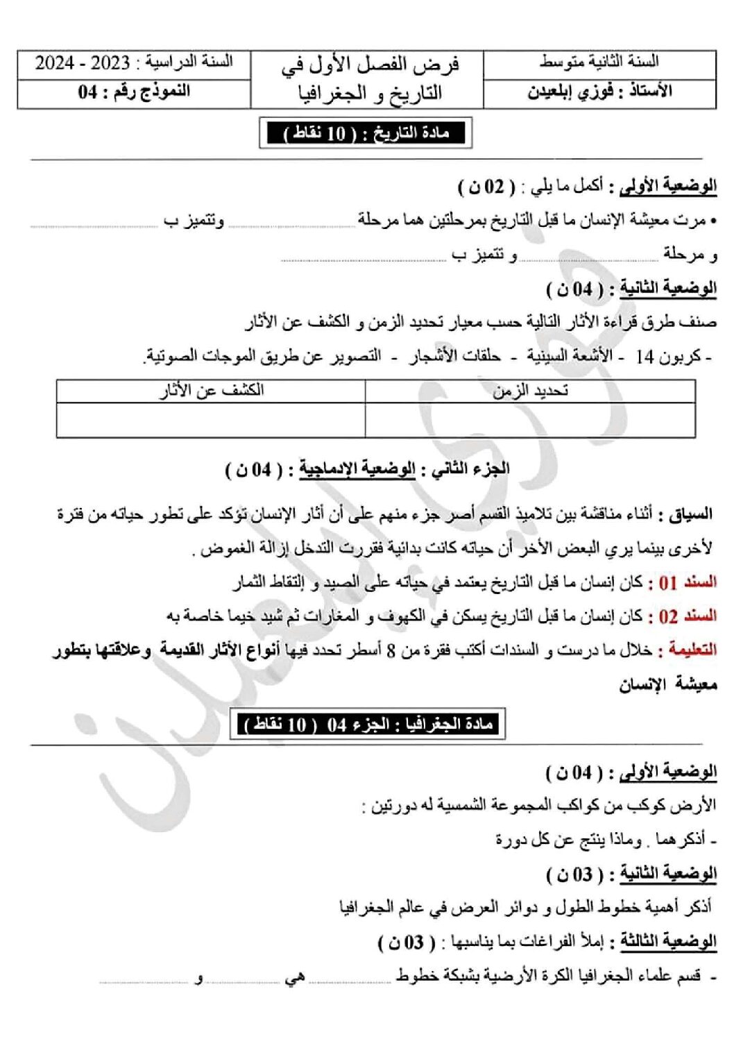 أكمل القراءة »فرض في التاريخ والجغرافيا الفصل الأول السنة الأولى متوسط رقم 34 مع التصحيح