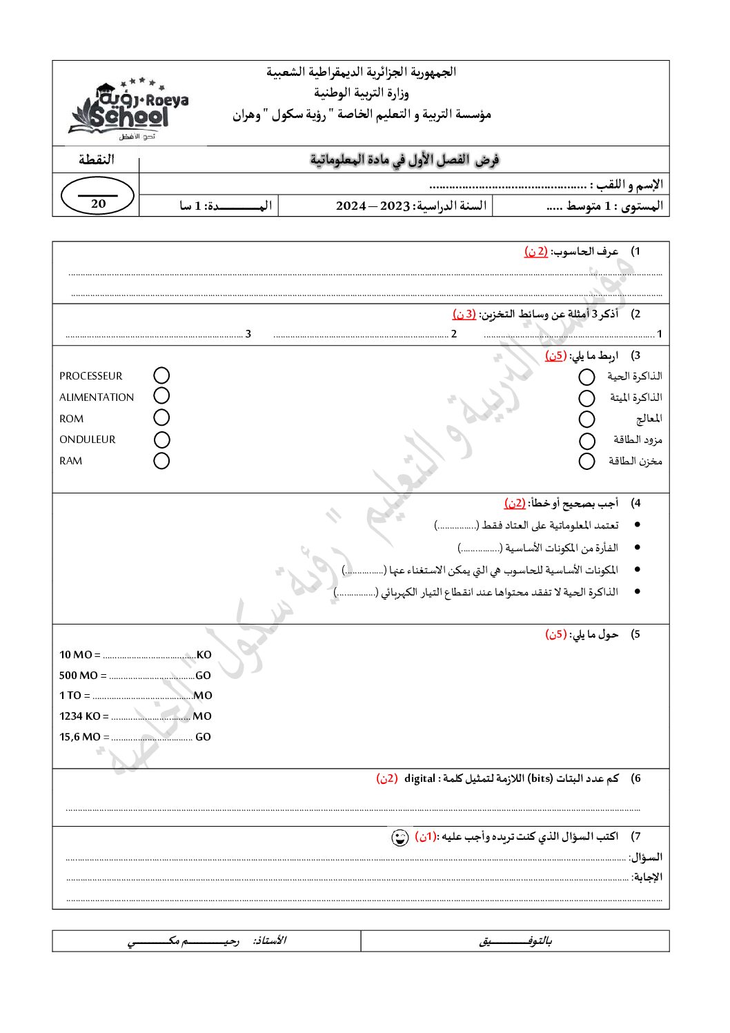 مادة الإعلام الآلي للسنة الأولى 1 متوسط دروس مفصلة، فروض واختبارات، تمارين محلولة: نموذج لإمتحان في الفصل الأول رقم 41- في مادة الإعلام الآلي و المعلوماتية مستوى السنة الأولى متوسط الجيل الثاني ، السنة الدراسية: 2025/2026 مع التصحيح يمكن تصفح الإختبار مباشرة عبر موقع الدراسة الجزائري أو تحميله مباشرة بصيغة PDF بالضغط أعلاه على: .: تحميل :. الإعلام الآلي السنة الأولى متوسط
