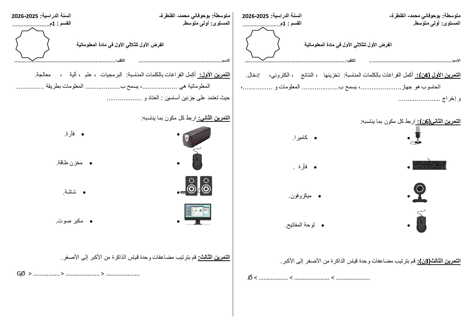مادة الإعلام الآلي للسنة الأولى 1 متوسط دروس مفصلة، فروض واختبارات، تمارين محلولة: نموذج لإمتحان في الفصل الأول رقم 42- في مادة الإعلام الآلي و المعلوماتية مستوى السنة الأولى متوسط الجيل الثاني ، السنة الدراسية: 2025/2026 مع التصحيح يمكن تصفح الإختبار مباشرة عبر موقع الدراسة الجزائري أو تحميله مباشرة بصيغة PDF بالضغط أعلاه على: .: تحميل :. الإعلام الآلي السنة الأولى متوسط