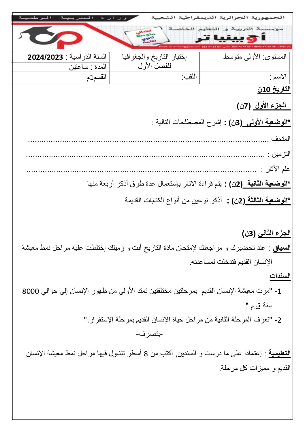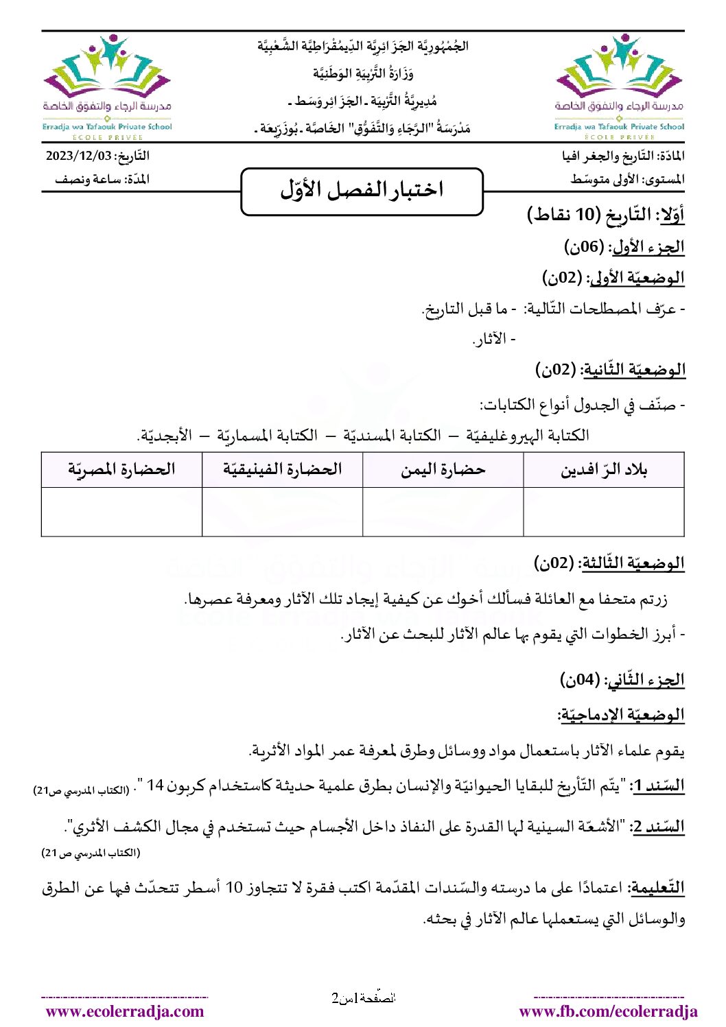 اختبار في التاريخ والجغرافيا الفصل الأول السنة الأولى متوسط رقم 39 مع التصحيح