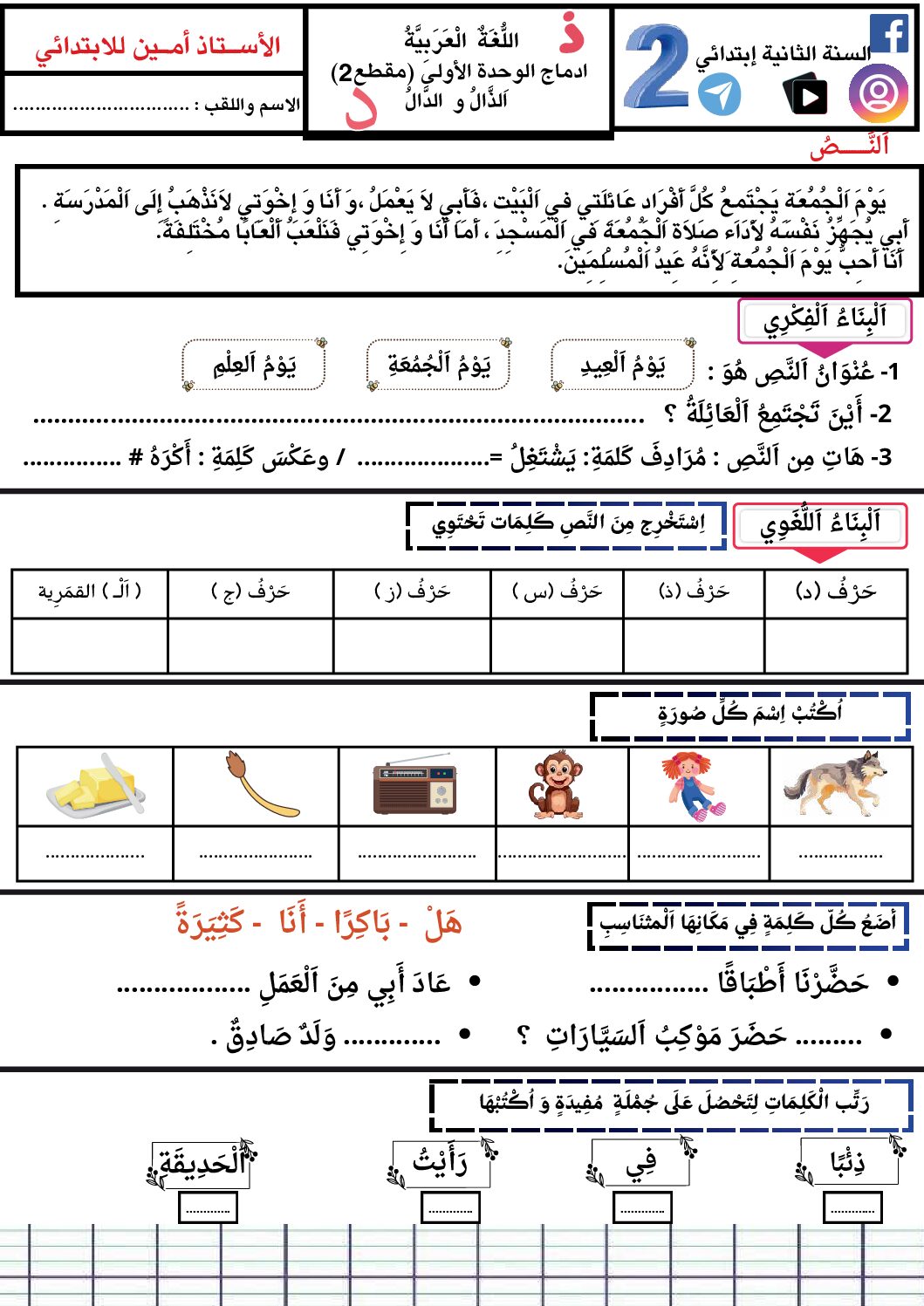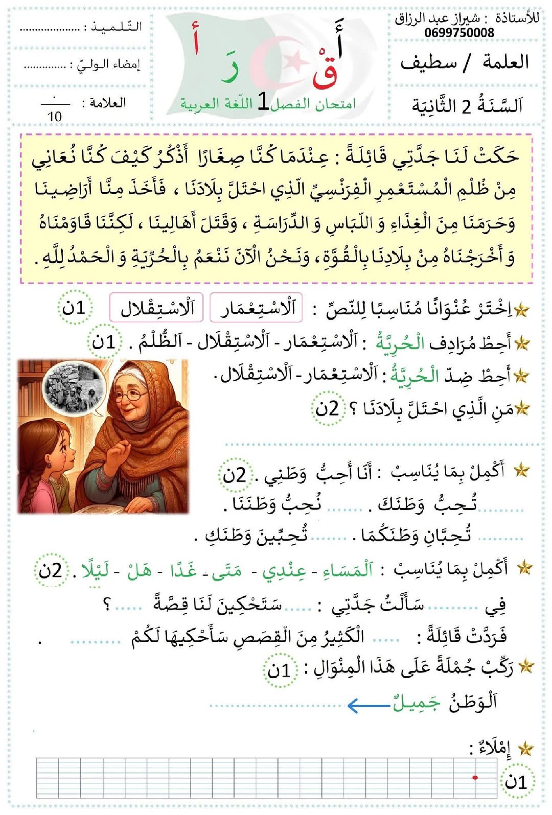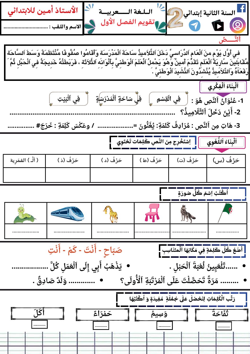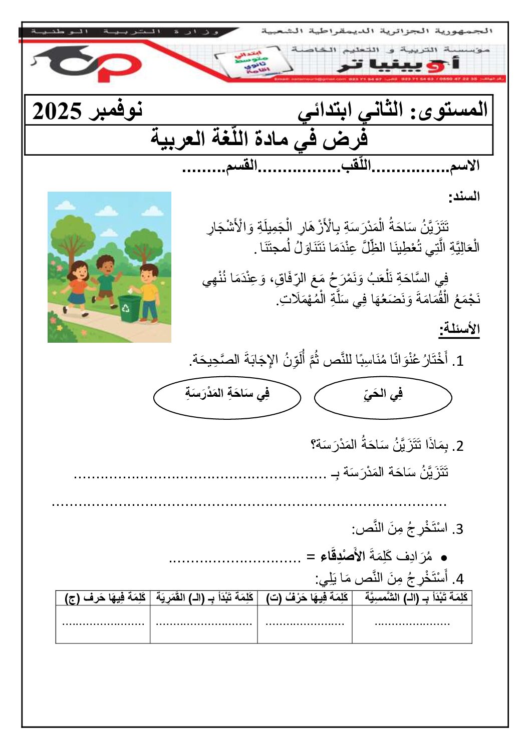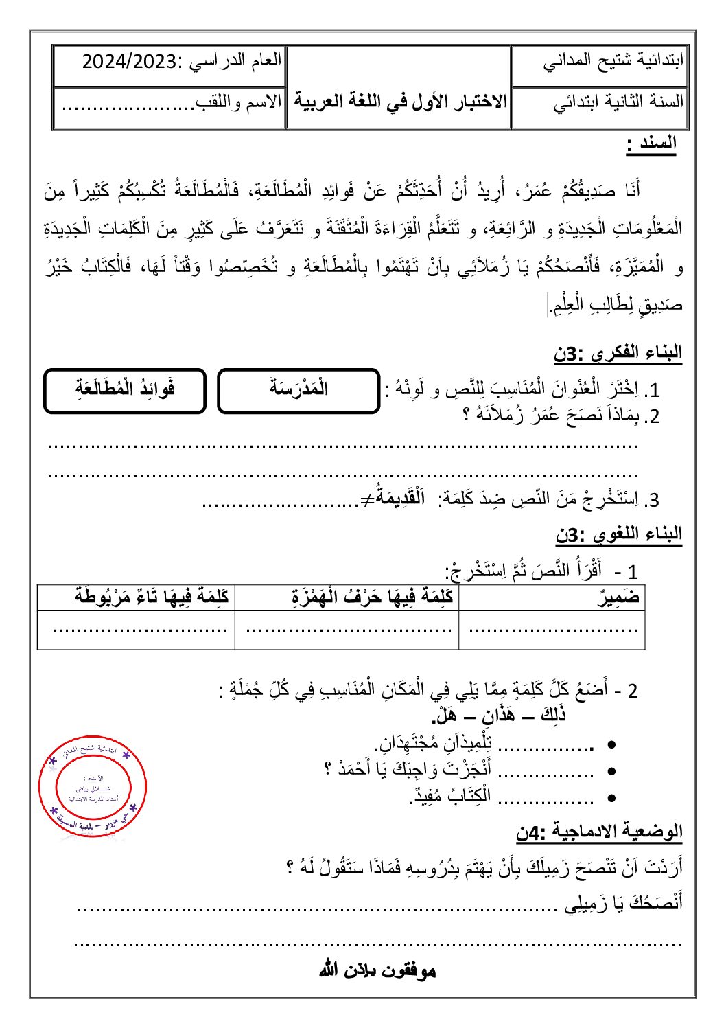 إختبار الفصل الأول في اللغة العربية السنة الثانية ابتدائي رقم 131