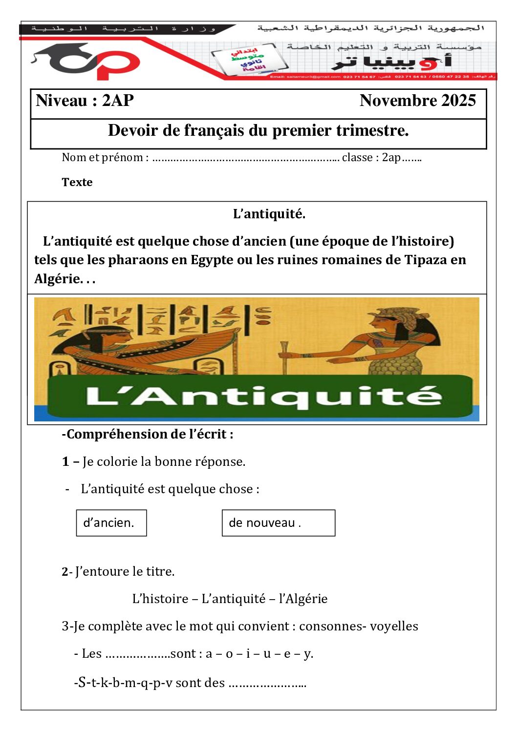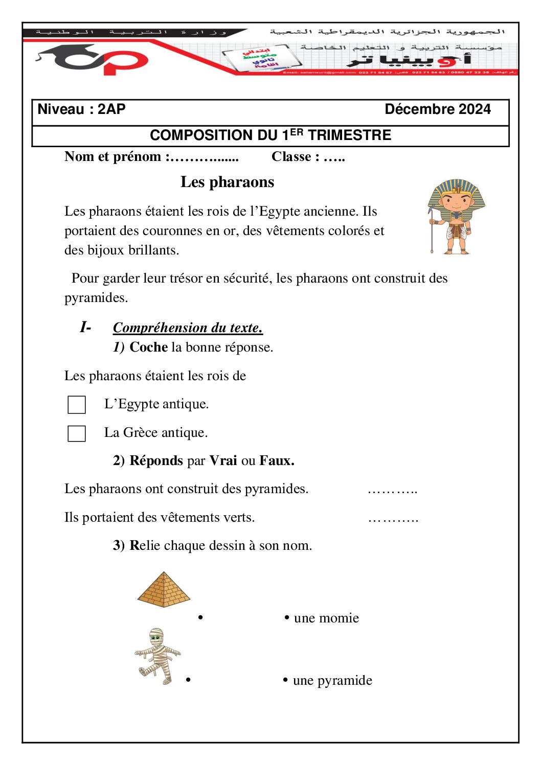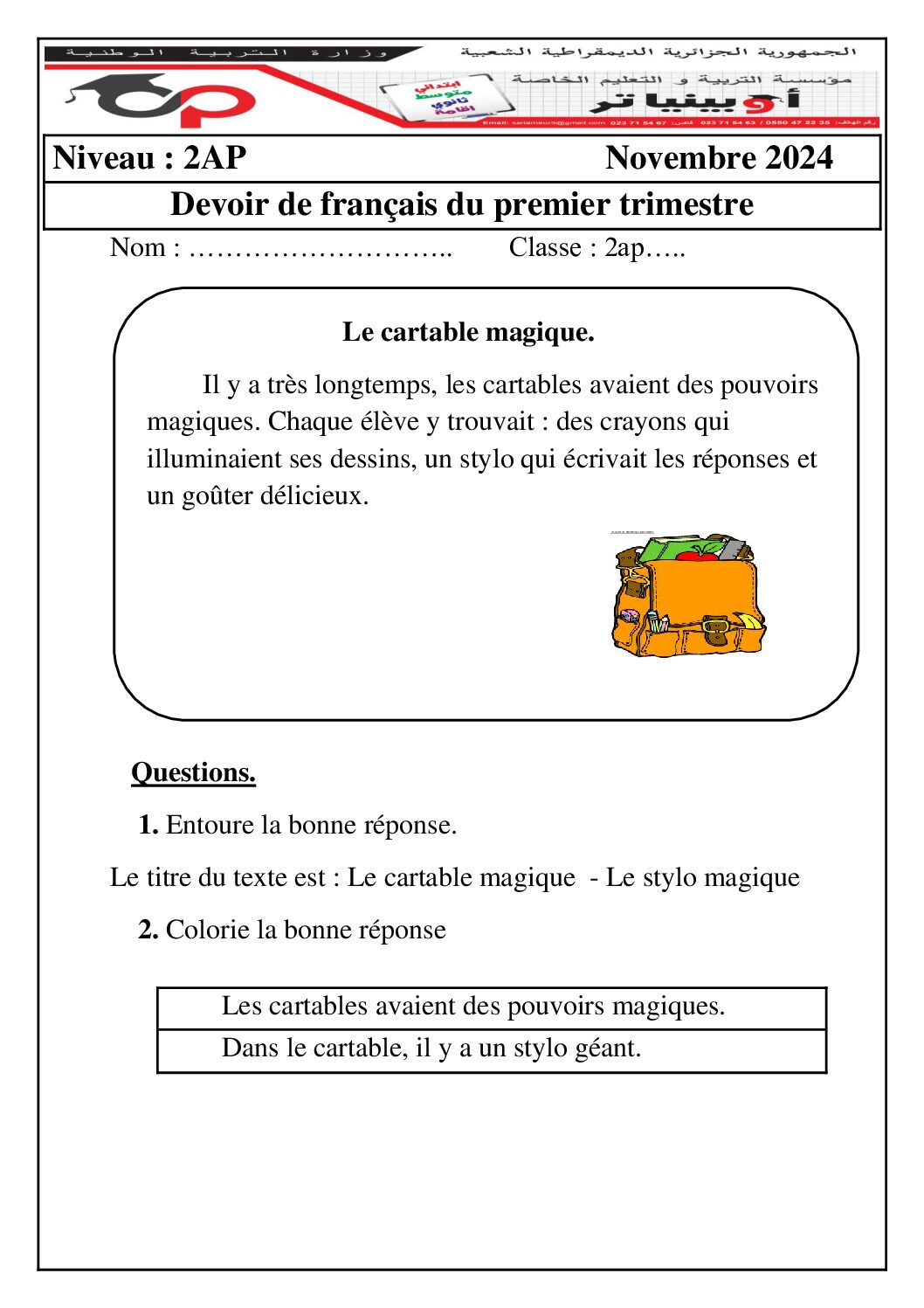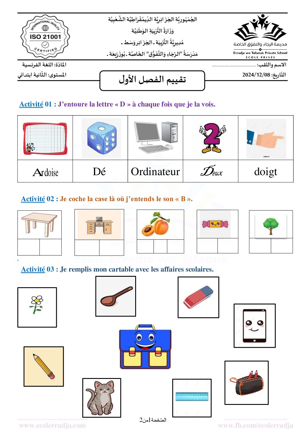 مادة التربية الفرنسية للسنة الثانية ابتدائي : نموذج لإمتحان في الفصل الأول رقم 35- في مادة اللغة الفرنسية مستوى السنة الثانية ابتدائي الجيل الثاني ، السنة الدراسية: 2025/2026 مع التصحيح اللغة الفرنسية السنة الثانية ابتدائي