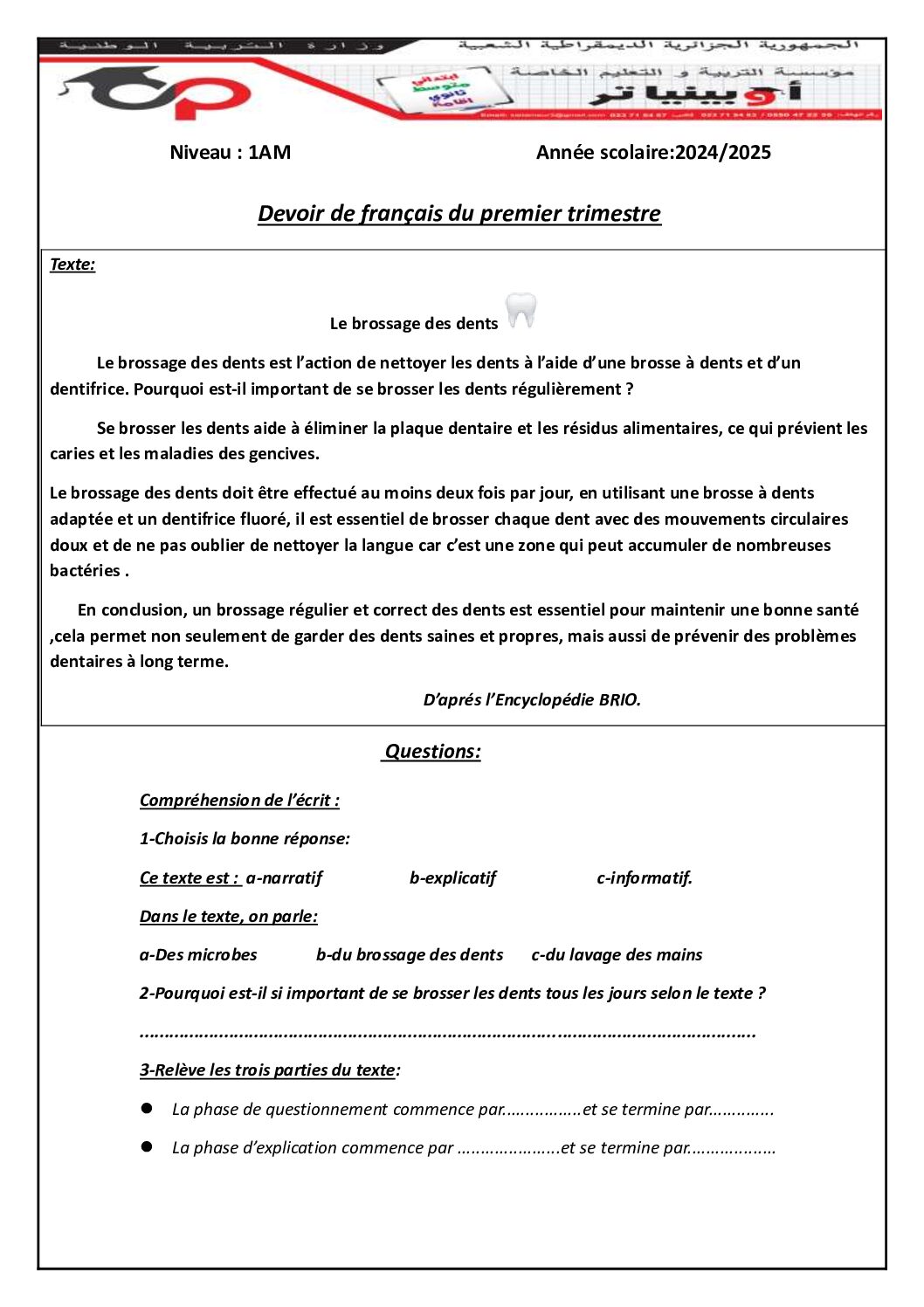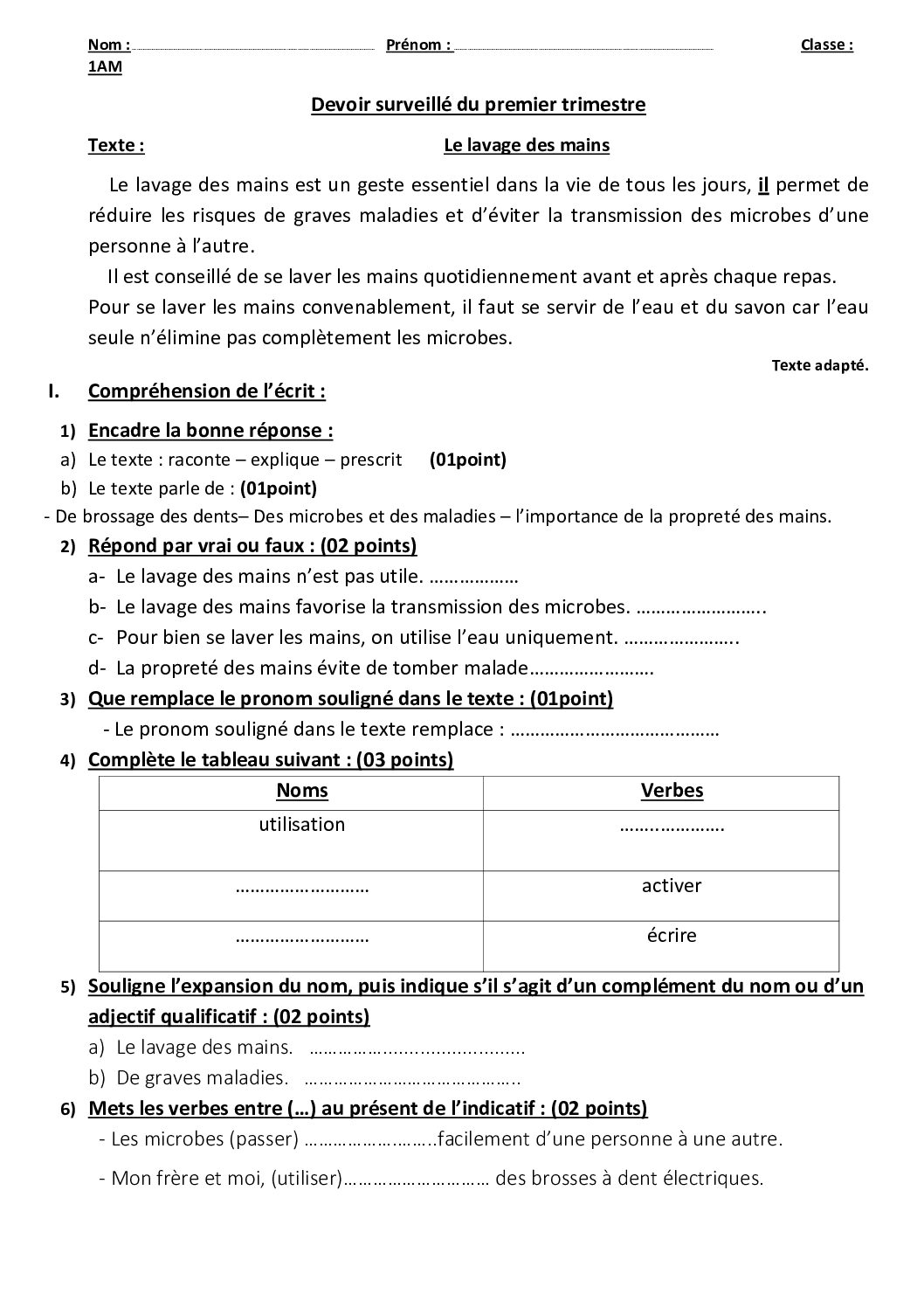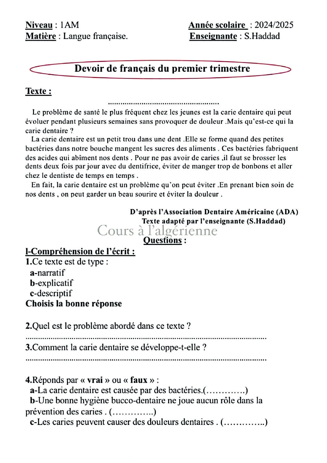 اختبار في اللغة الفرنسية الفصل الأول السنة الأولى متوسط رقم 72 مع التصحيح
