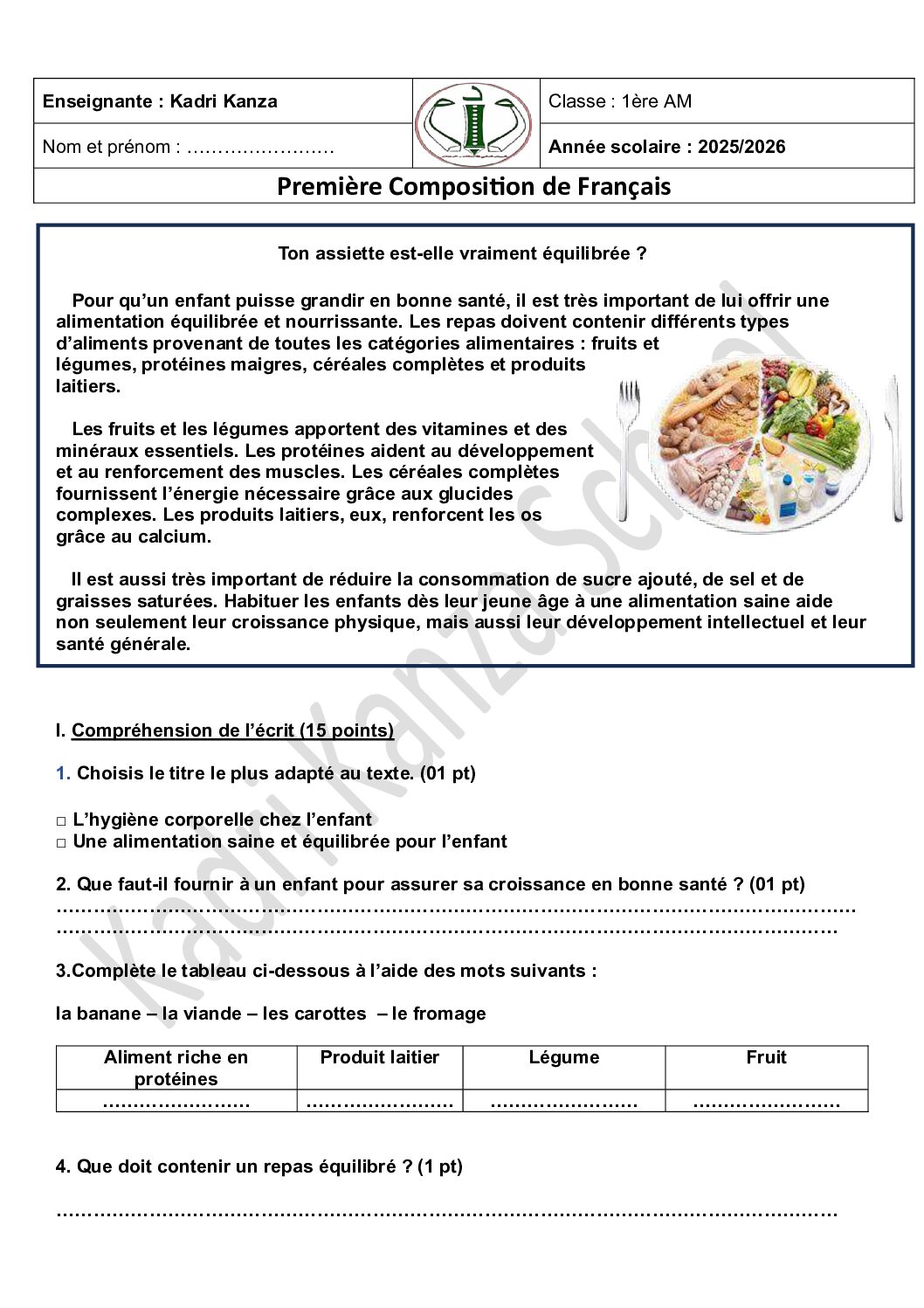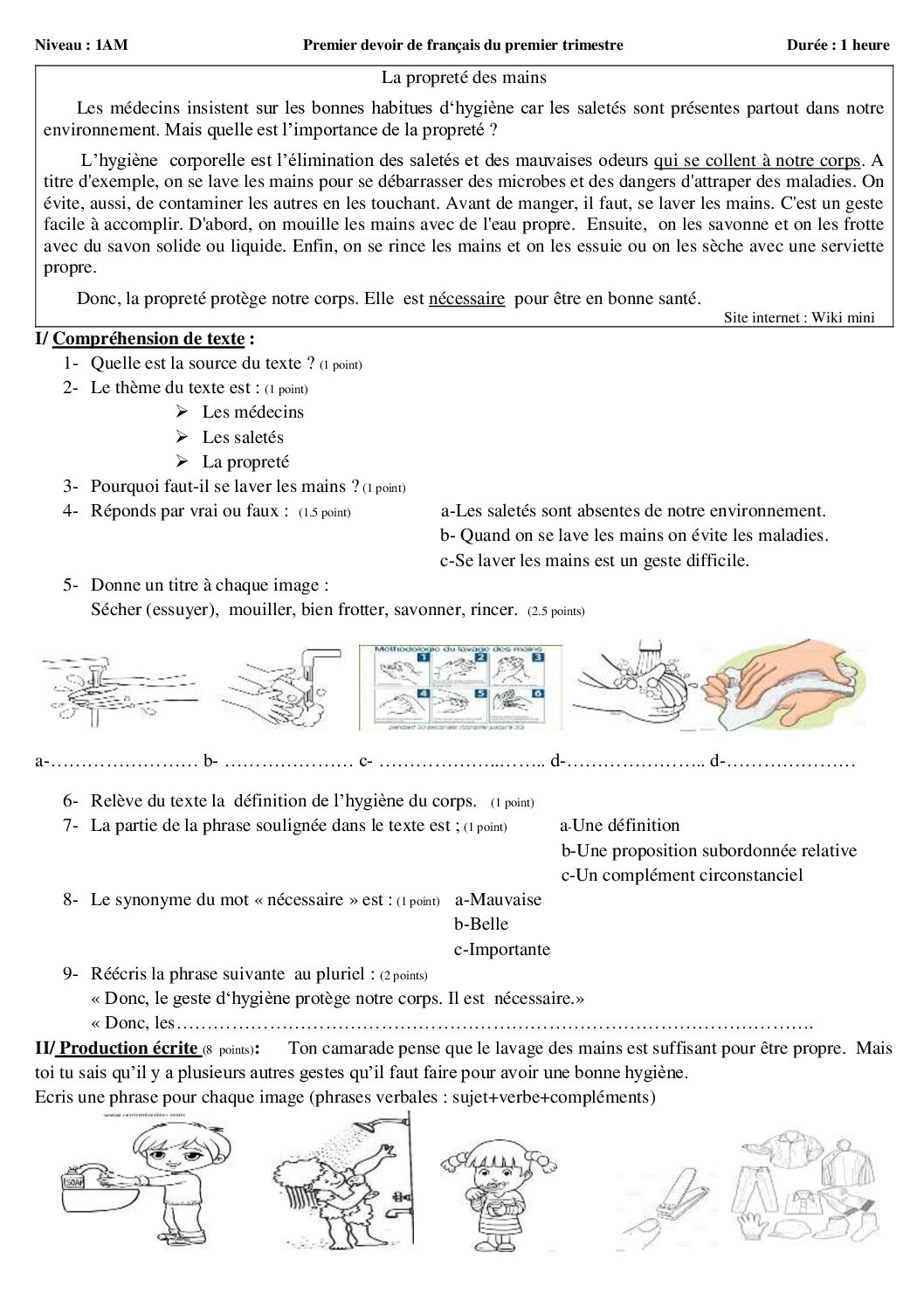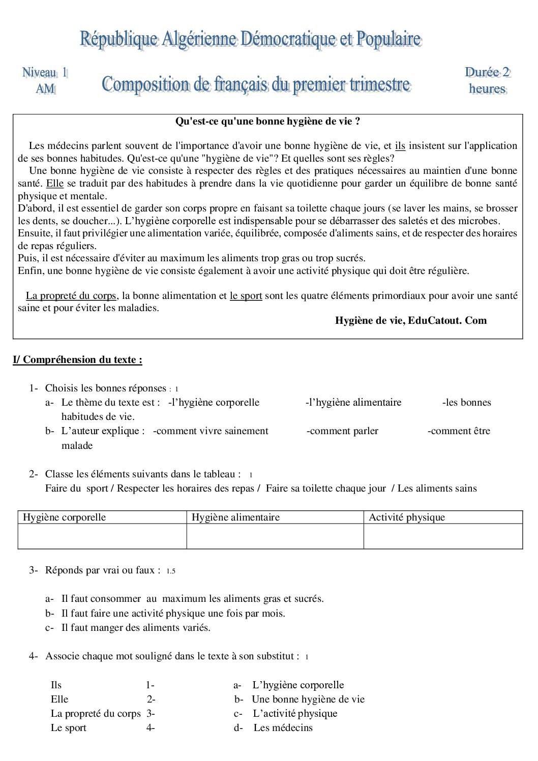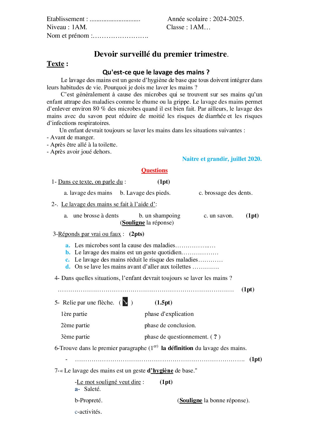 اختبار في اللغة الفرنسية الفصل الأول السنة الأولى متوسط رقم 72 مع التصحيح