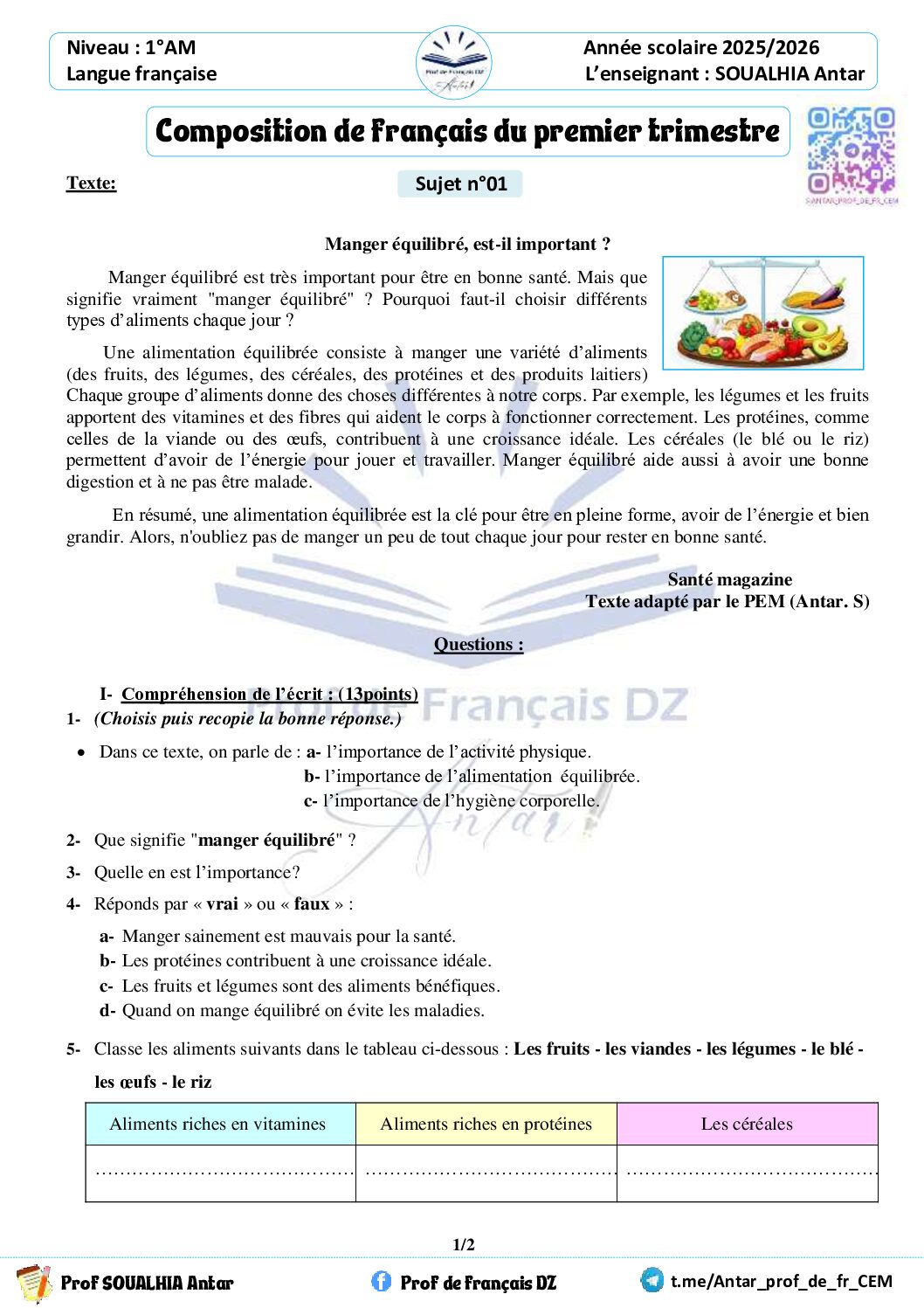 مادة اللغة الفرنسية للسنة الأولى 1 متوسط دروس مفصلة، فروض واختبارات، تمارين محلولة: نموذج لإمتحان في الفصل الأول رقم 72- في مادة اللغة الفرنسية مستوى السنة الأولى متوسط الجيل الثاني ، السنة الدراسية: 2025/2026 مع التصحيح يمكن تصفح الاختبار مباشرة عبر موقع الدراسة الجزائري أو تحميله مباشرة بصيغة PDF بالضغط أعلاه على: .: تحميل :. اللغة الفرنسية السنة الأولى متوسط