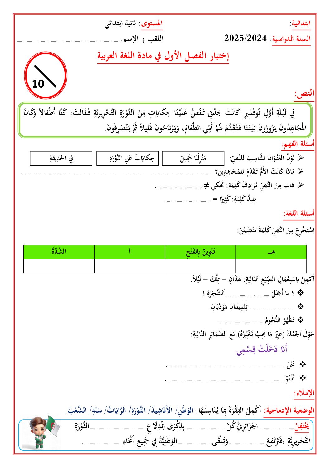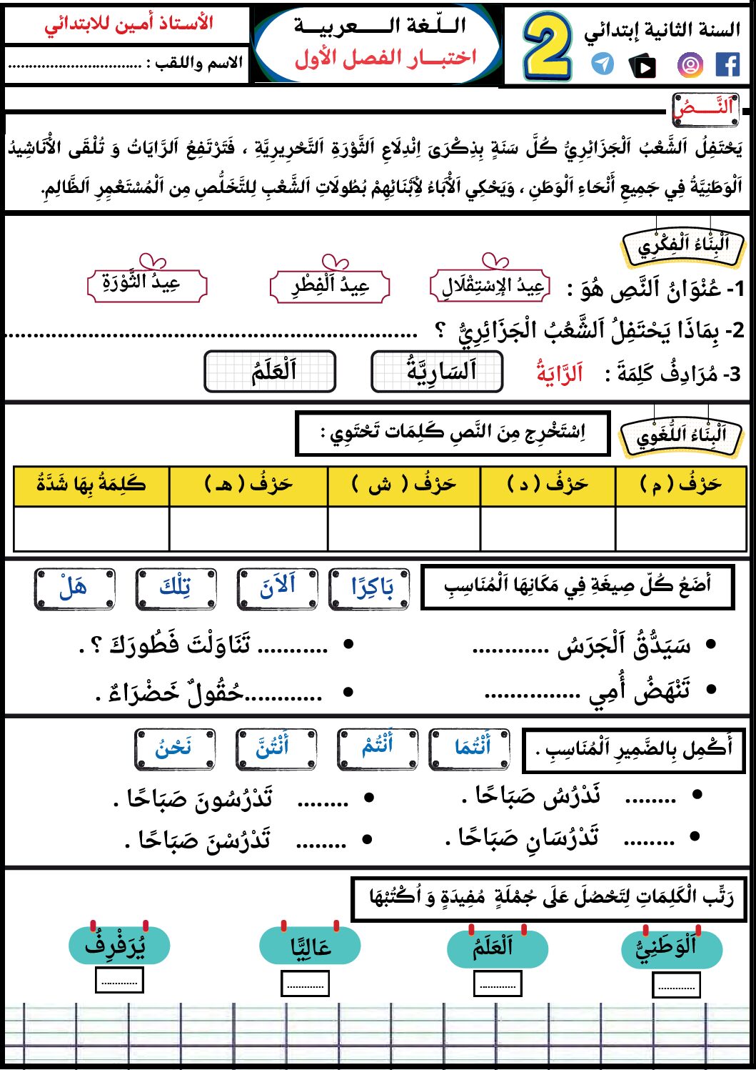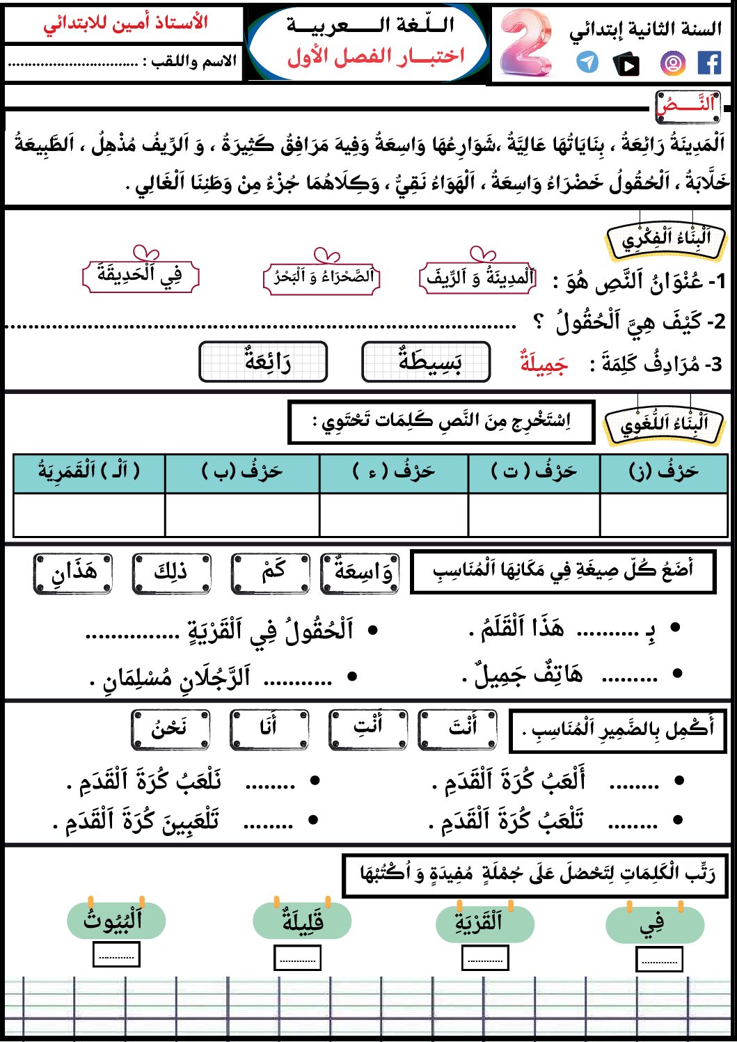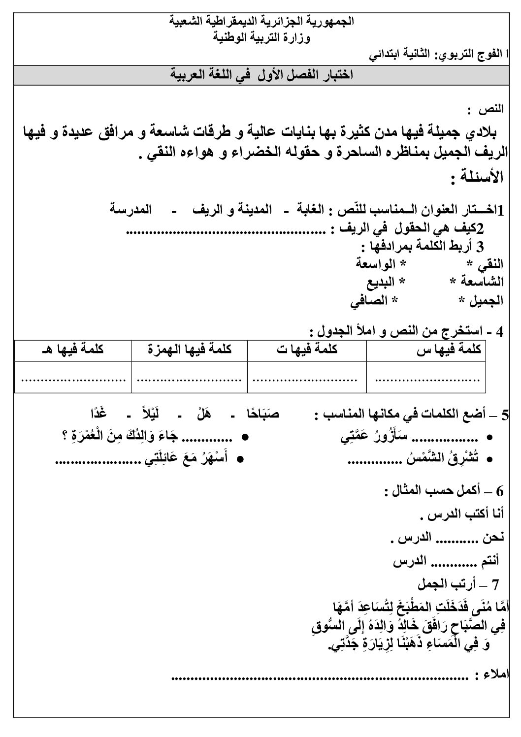 إختبار الفصل الأول في اللغة العربية السنة الثانية ابتدائي رقم 125