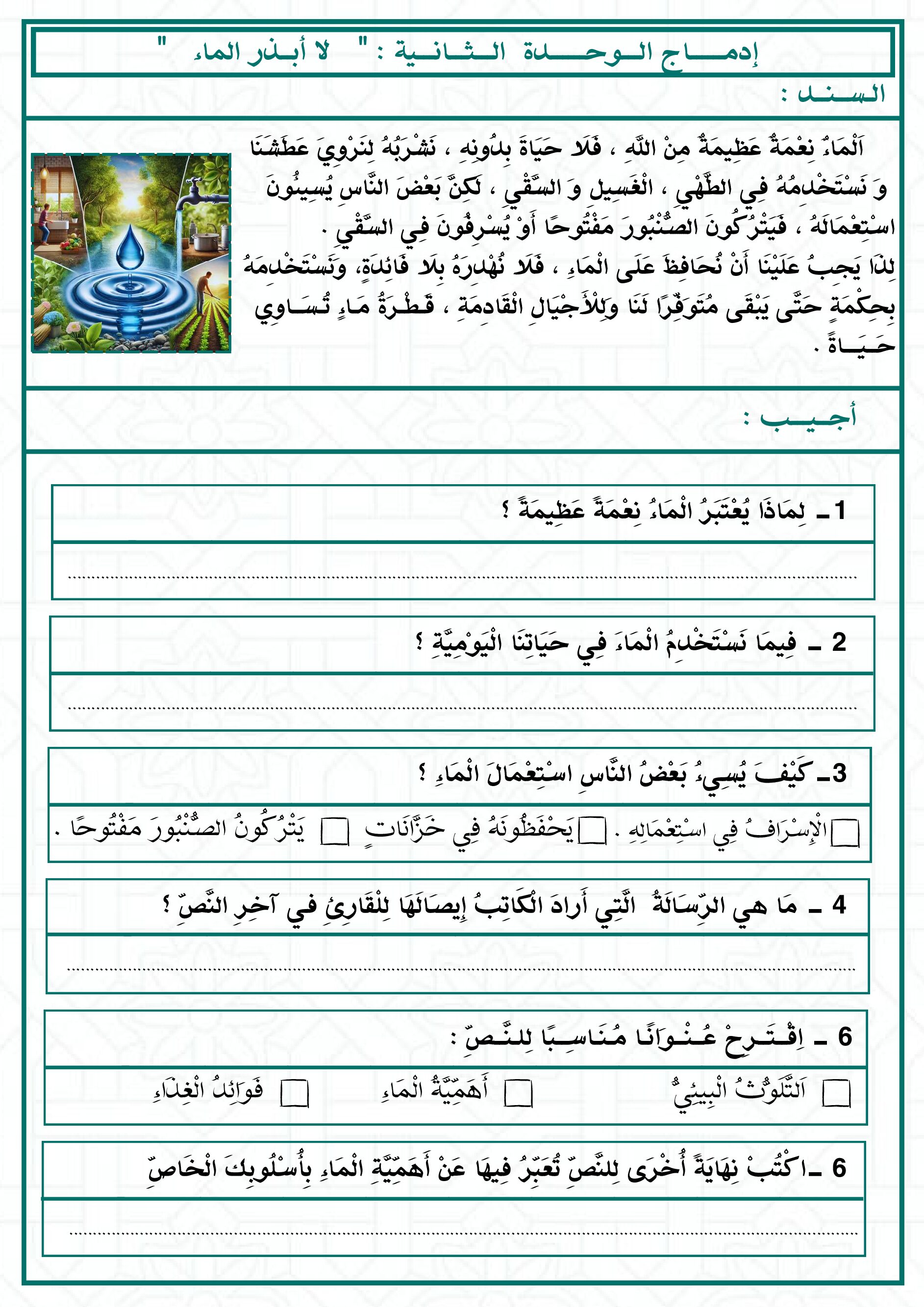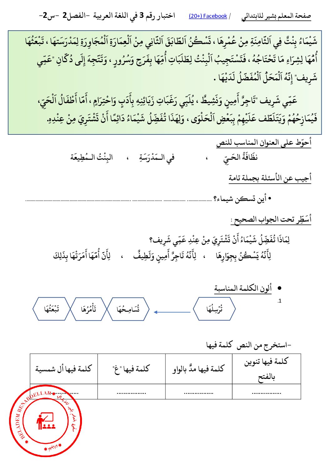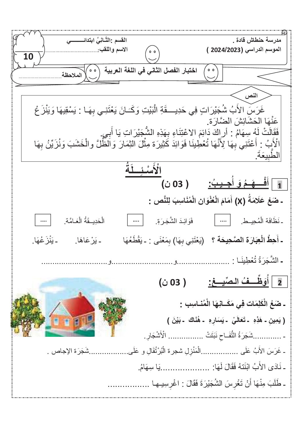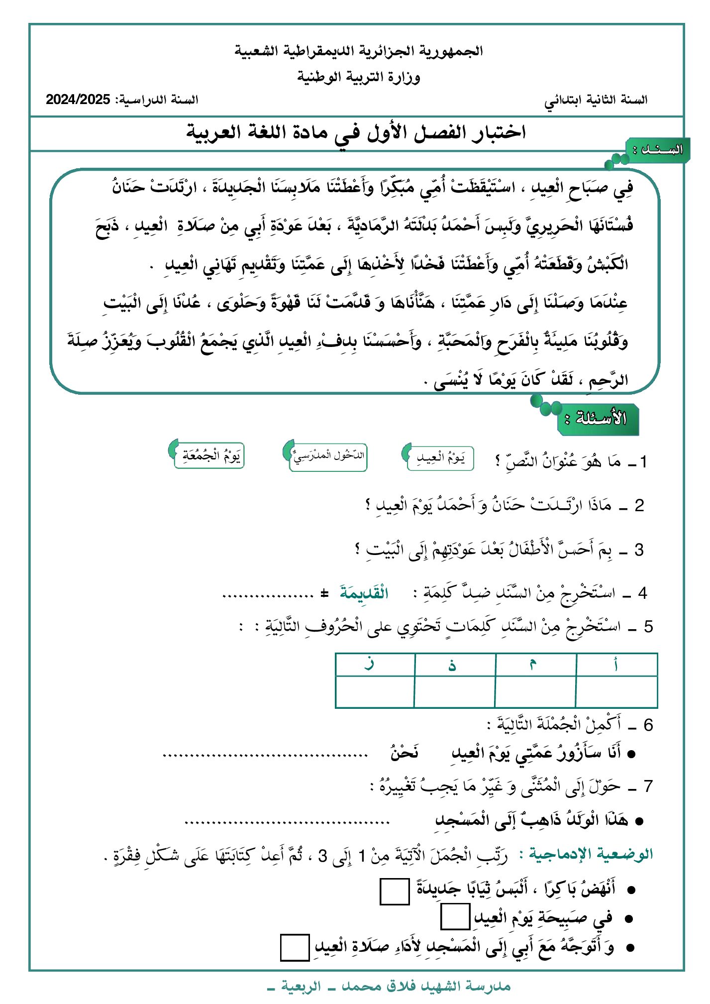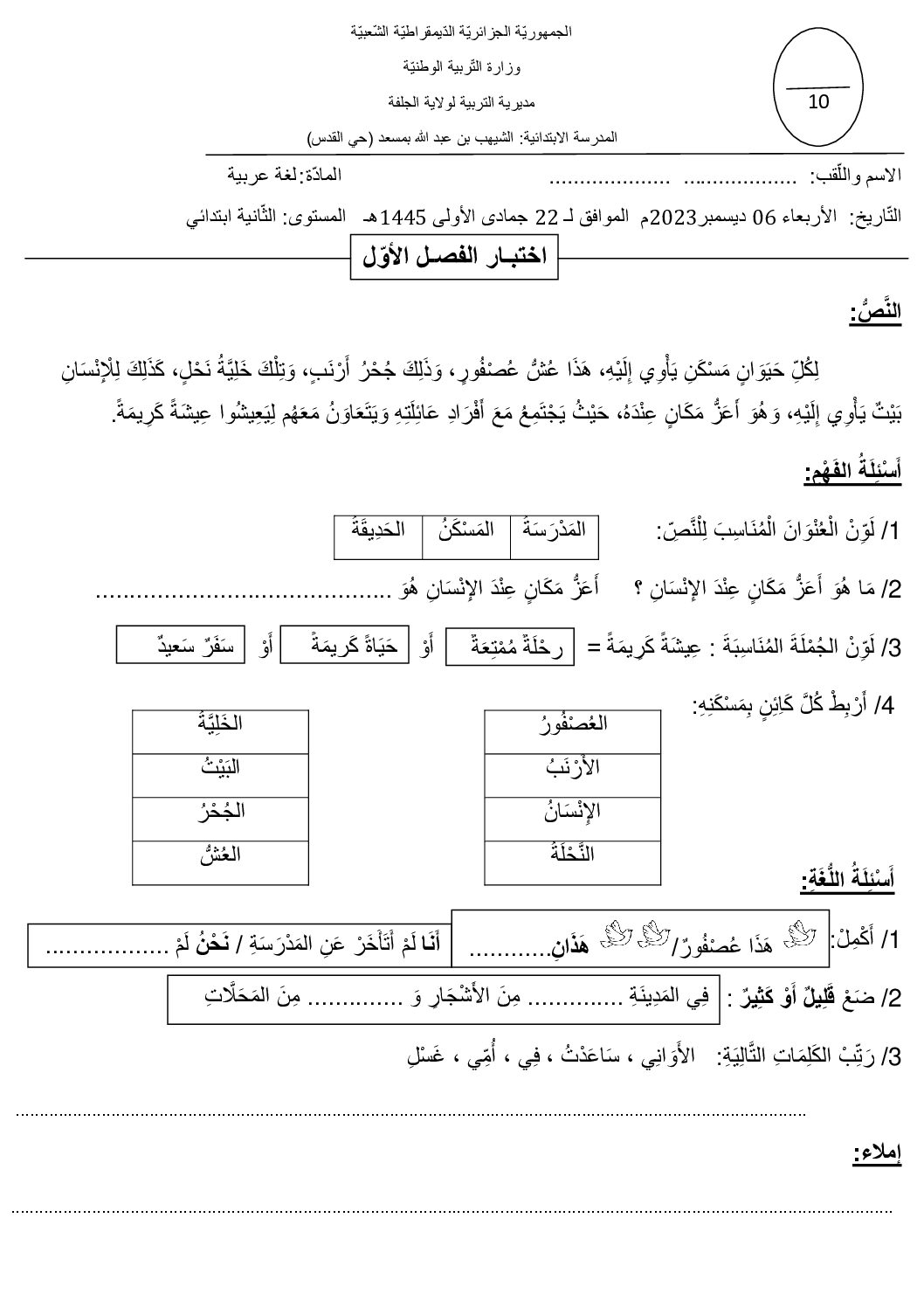 إختبار الفصل الأول في اللغة العربية السنة الثانية ابتدائي رقم 125