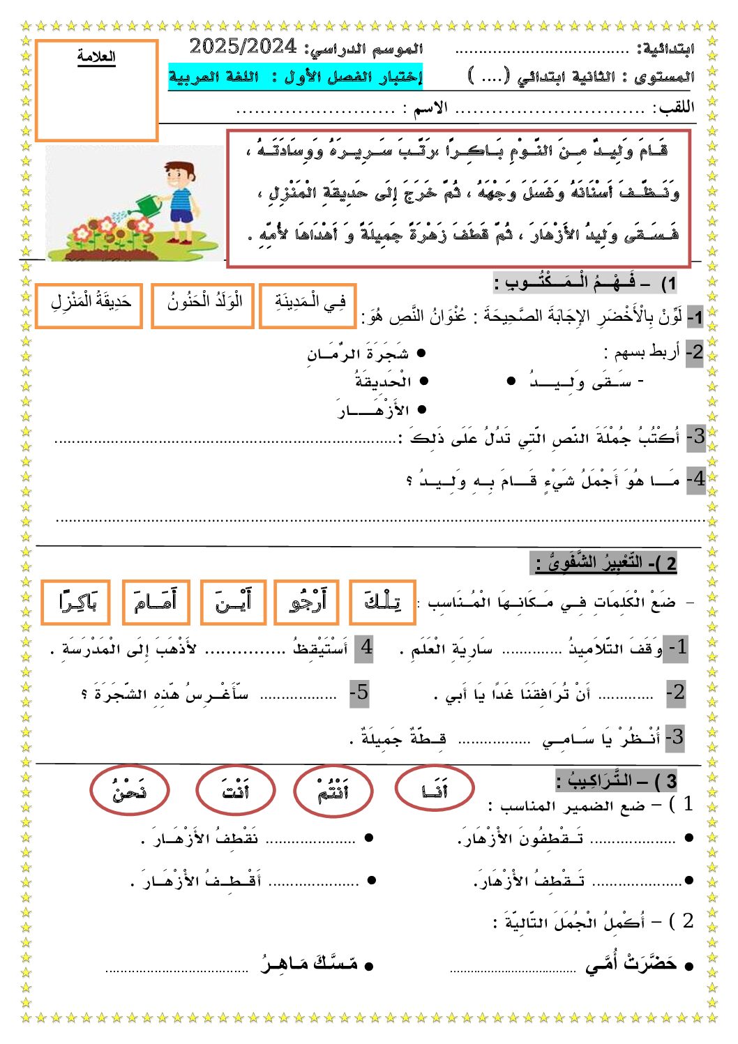مادة اللغة العربية للسنة الثانية ابتدائي : نموذج لإمتحان في الفصل الأول رقم 109- في مادة اللغة العربية مستوى السنة الثانية ابتدائي الجيل الثاني ، السنة الدراسية: 2025/2026 مع التصحيح يمكن تصفح الإختبار مباشرة عبر موقع الدراسة الجزائري أو تحميله مباشرة بصيغة PDF بالضغط أعلاه على: .: تحميل :. اللغة العربية السنة الثانية ابتدائي