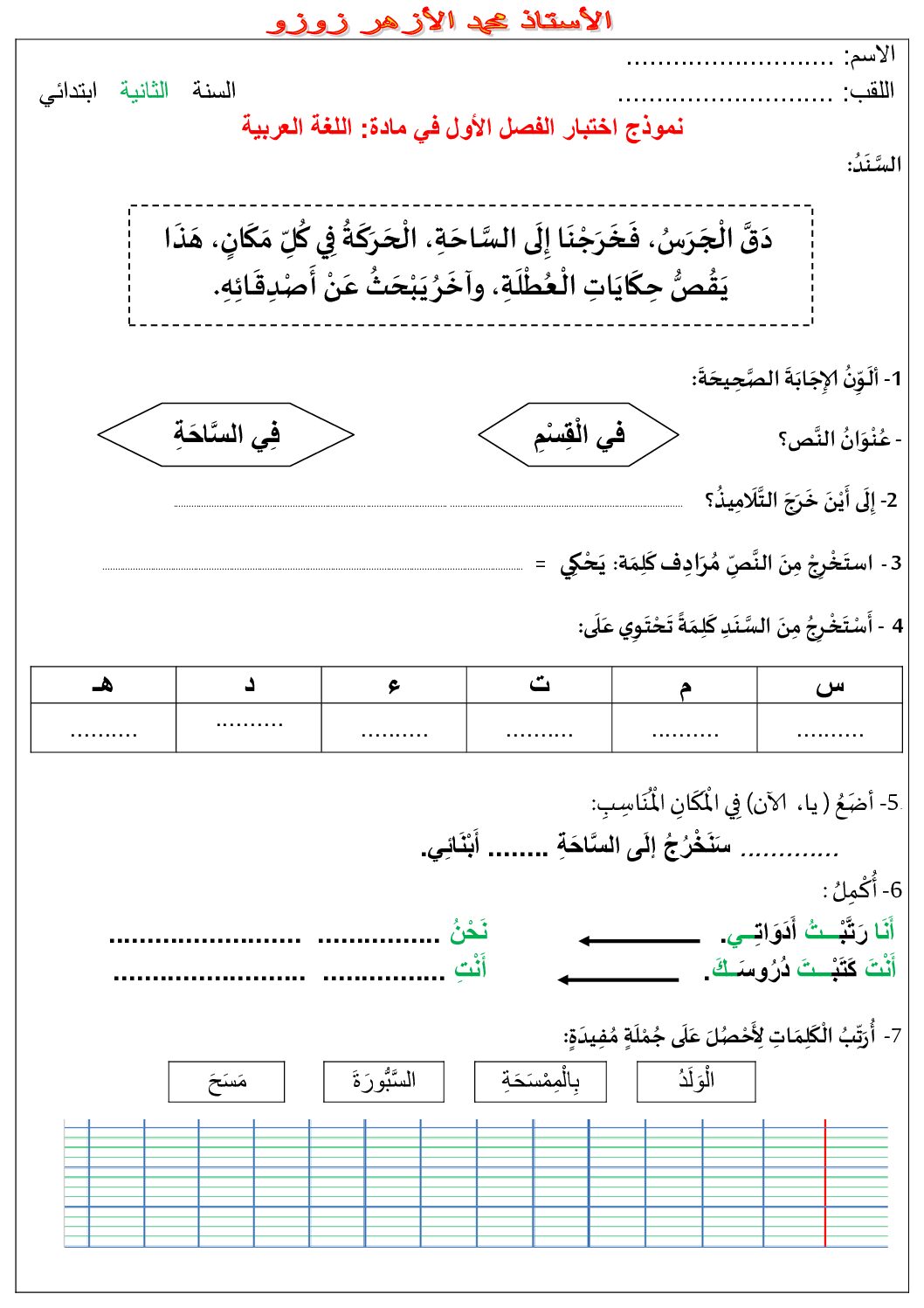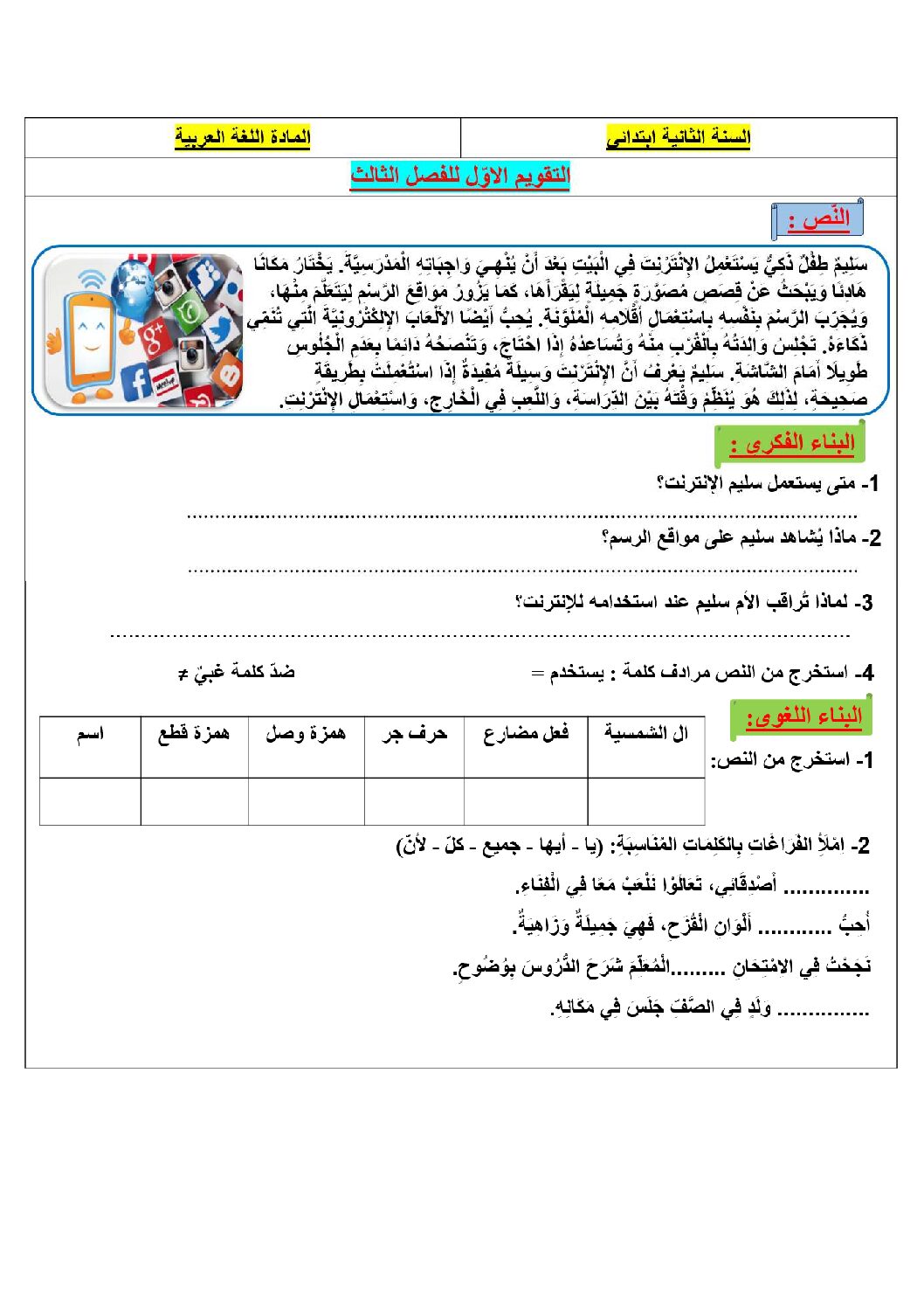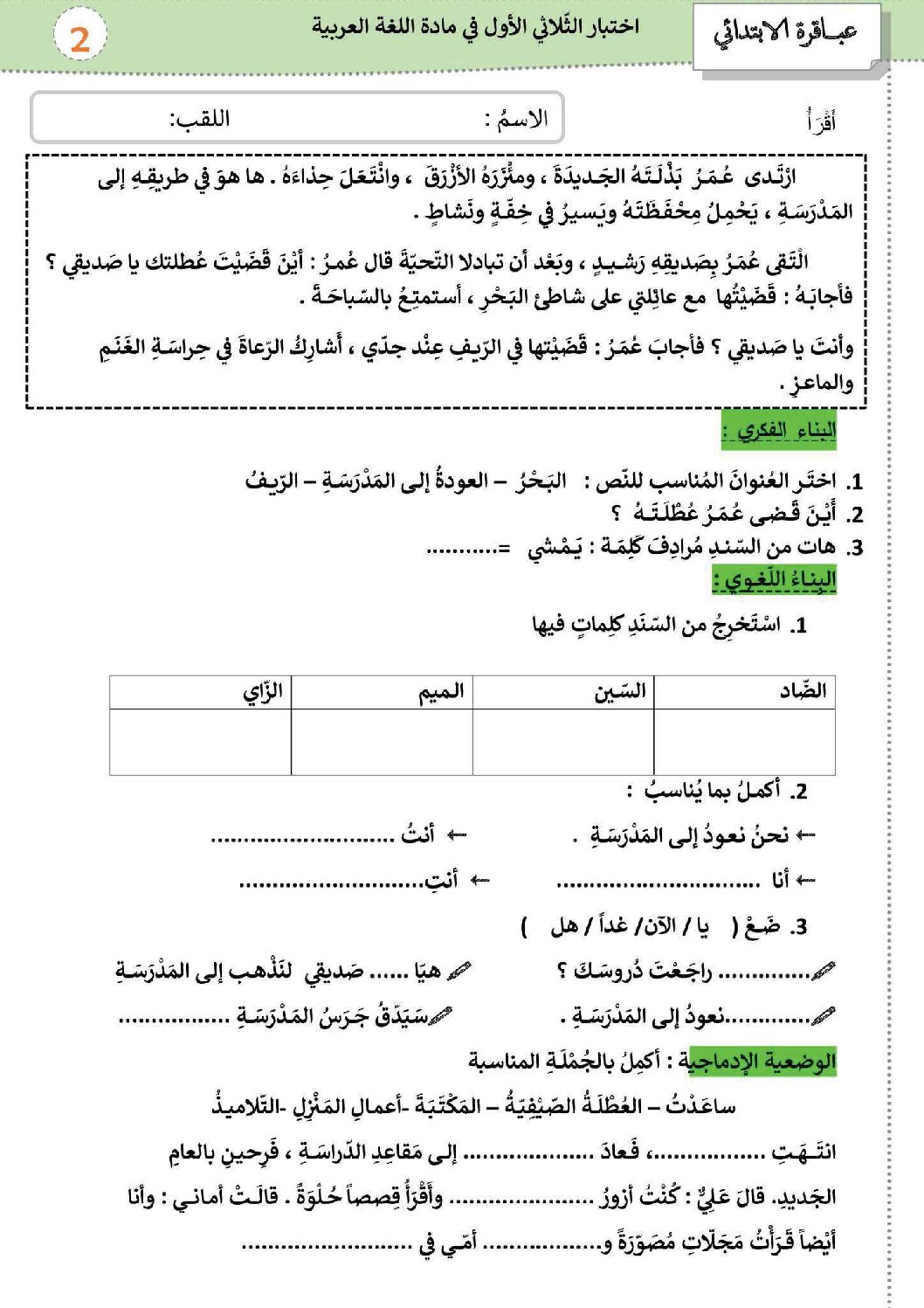 إختبار الفصل الثالث في اللغة العربية السنة الثانية ابتدائي رقم 42