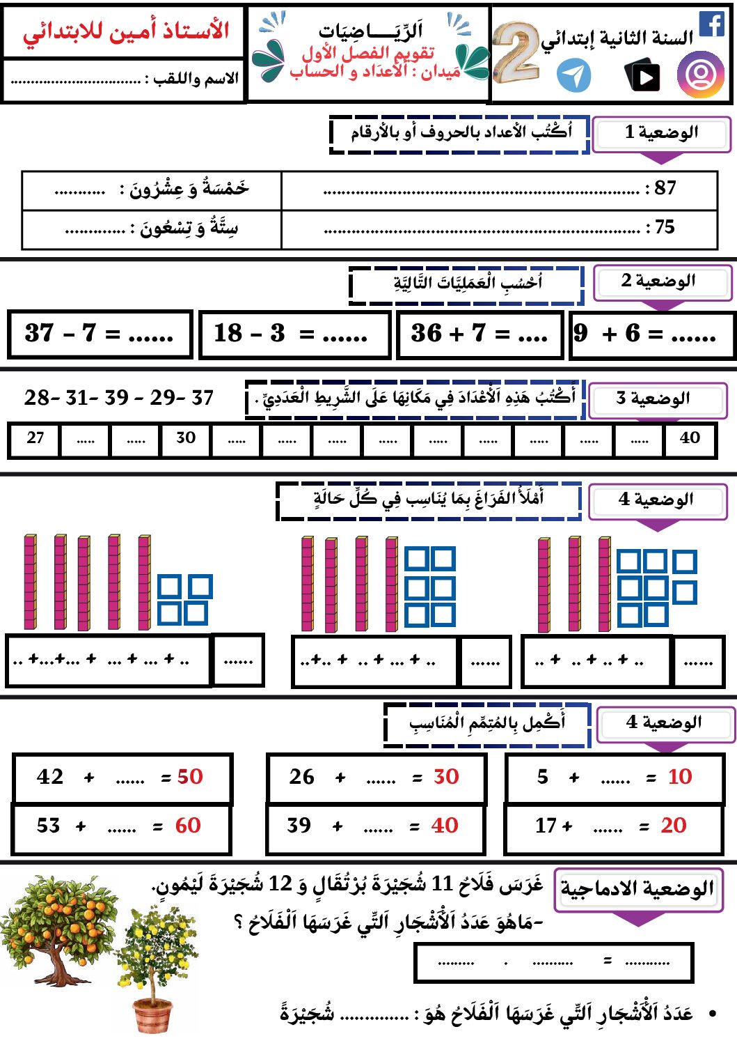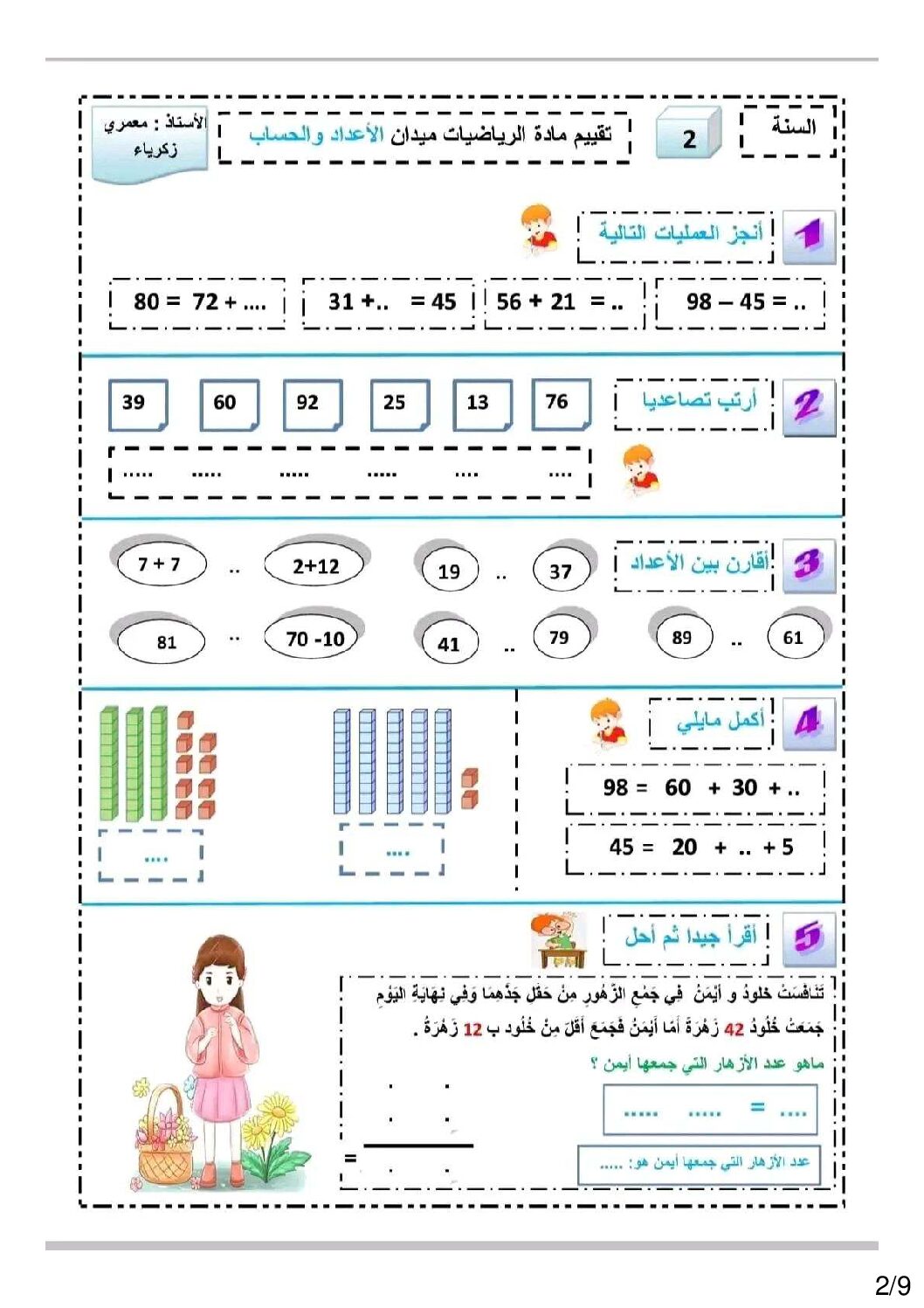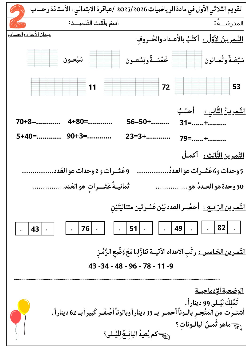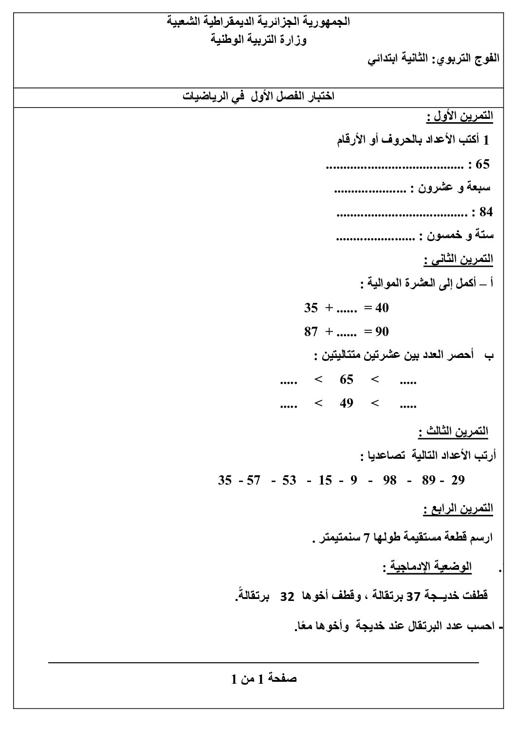 إختبار الفصل الأول في الرياضيات السنة الثانية ابتدائي رقم 132