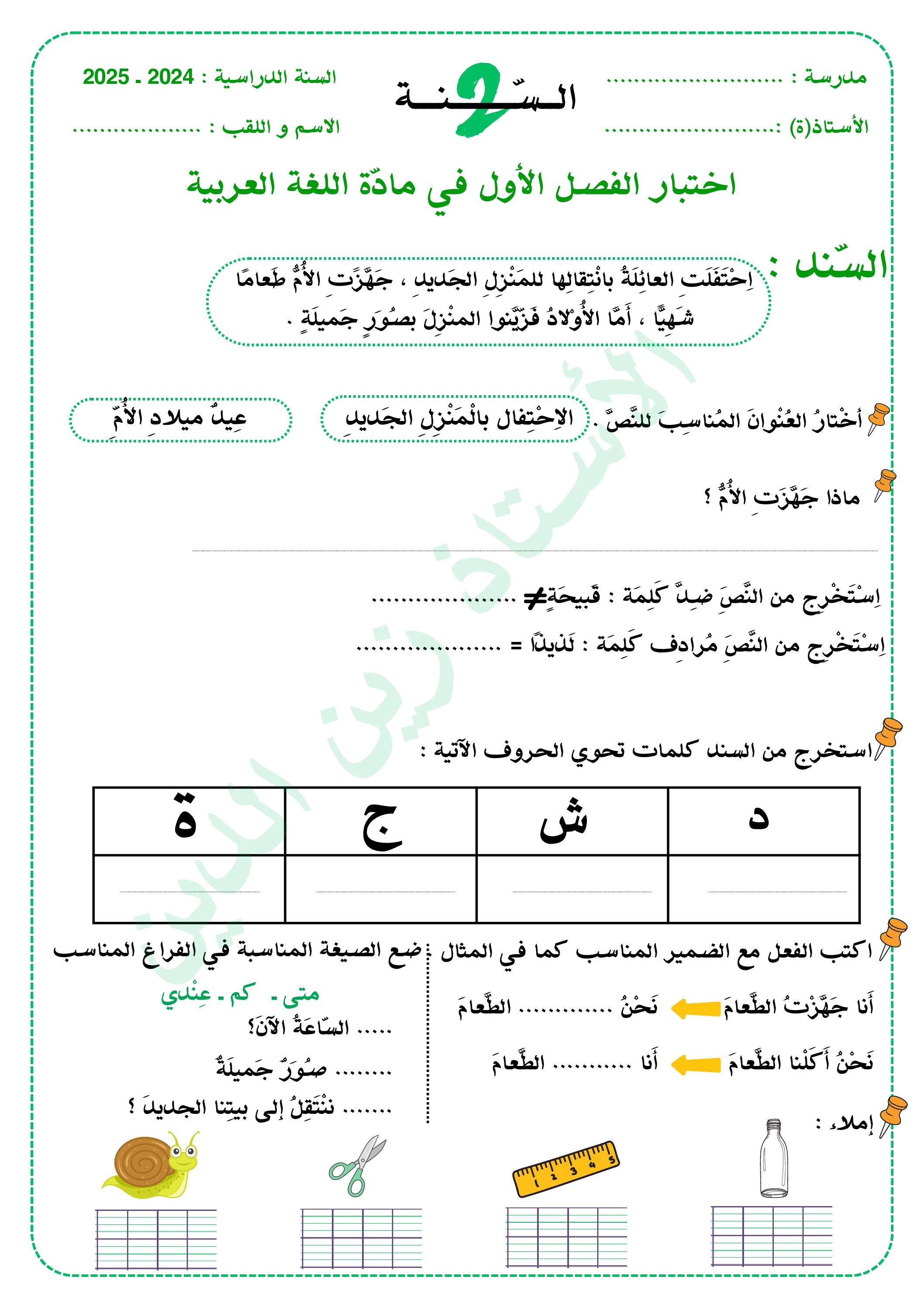مادة اللغة العربية للسنة الثانية ابتدائي : نموذج لإمتحان في الفصل الأول رقم 105- في مادة اللغة العربية مستوى السنة الثانية ابتدائي الجيل الثاني ، السنة الدراسية: 2025/2026 مع التصحيح يمكن تصفح الإختبار مباشرة عبر موقع الدراسة الجزائري أو تحميله مباشرة بصيغة PDF بالضغط أعلاه على: .: تحميل :. اللغة العربية السنة الثانية ابتدائي