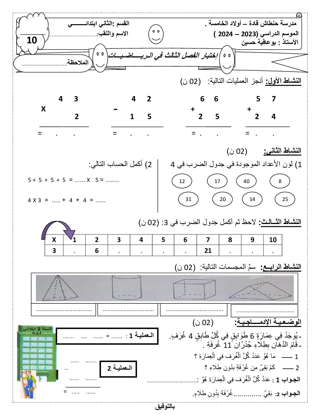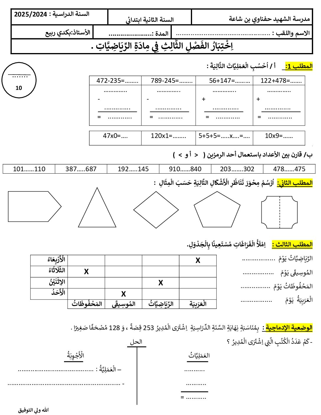إختبار الفصل الأول في الرياضيات السنة الثانية ابتدائي رقم 113 مع التصحيح