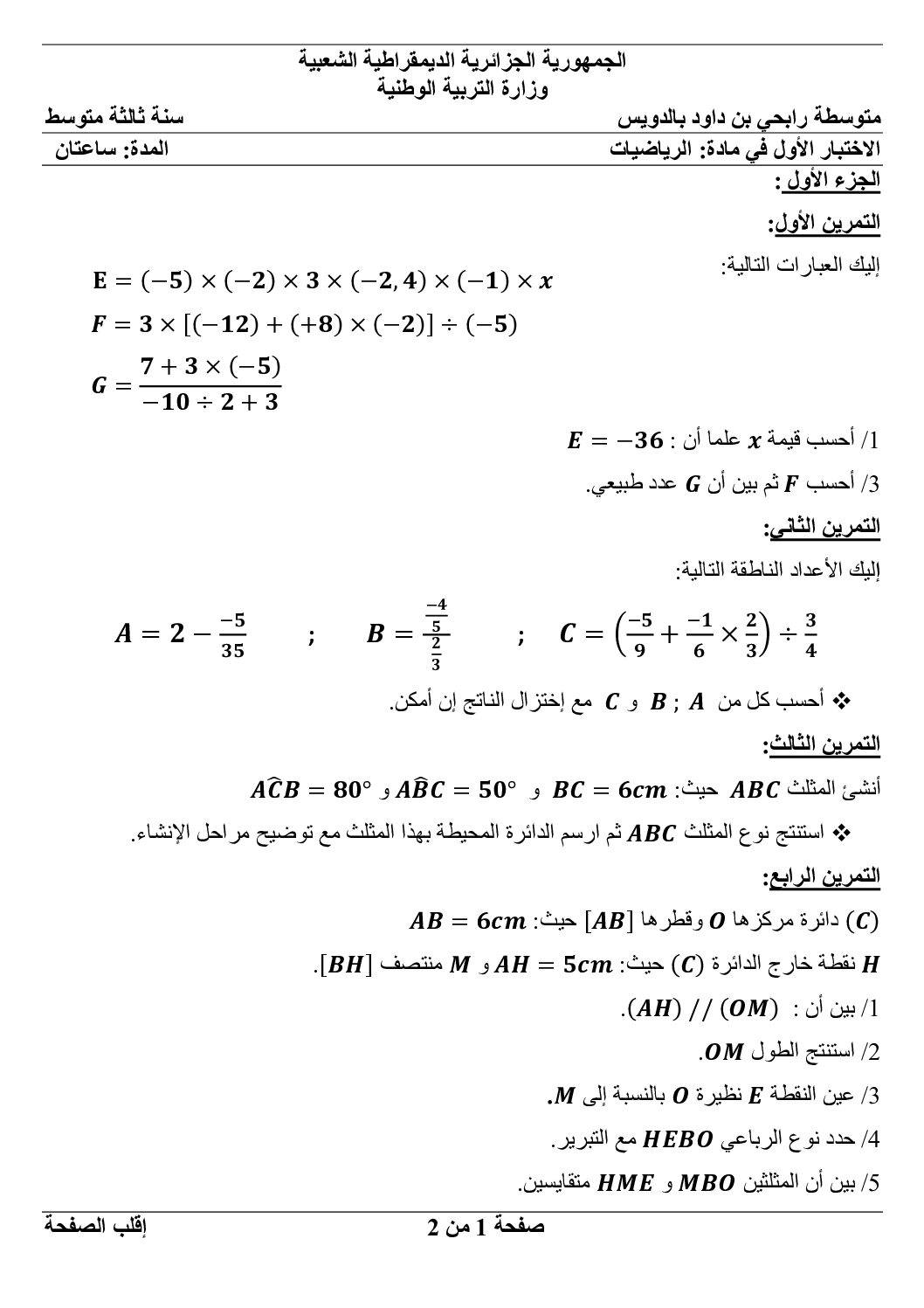 أكمل القراءة »اختبار في الرياضيات الفصل الأول السنة الأولى متوسط رقم 104 مع التصحيح