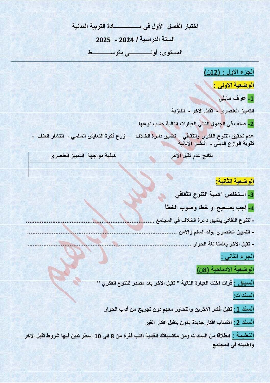مادة التربية المدنية للسنة الأولى 1 متوسط دروس مفصلة، فروض واختبارات، تمارين محلولة: نموذج لإمتحان في الفصل الأول رقم 44- في مادة التربية المدنية مستوى السنة الأولى متوسط الجيل الثاني ، السنة الدراسية: 2025/2026 مع التصحيح يمكن تصفح الاختبار مباشرة عبر موقع الدراسة الجزائري أو تحميله مباشرة بصيغة PDF بالضغط أعلاه على: .: تحميل :. التربية المدنية السنة الأولى متوسط
