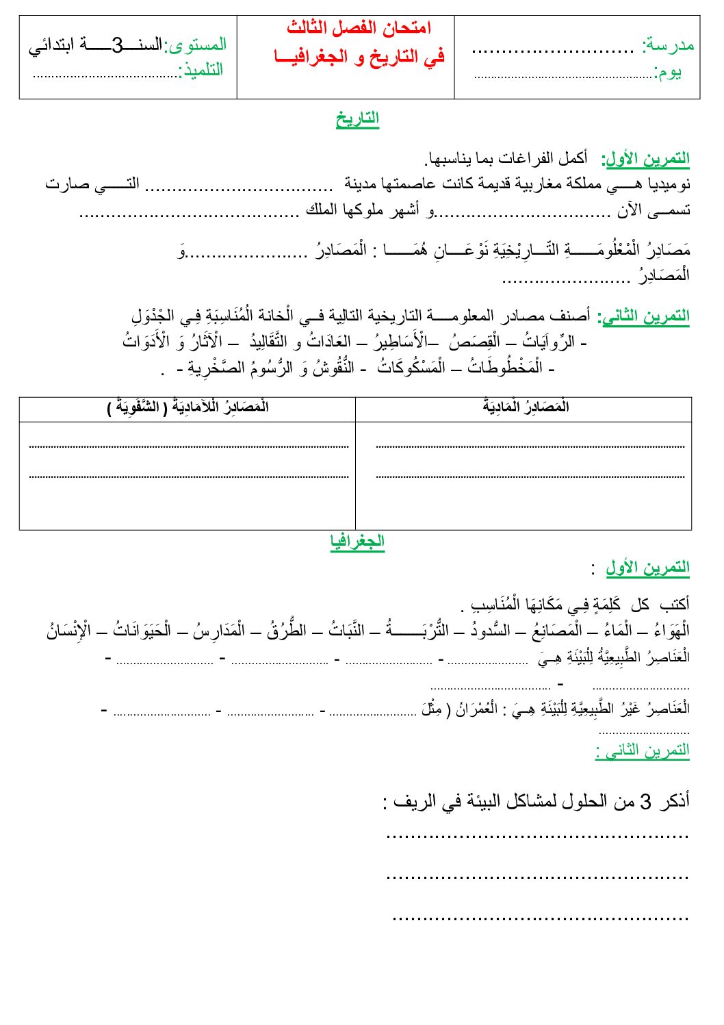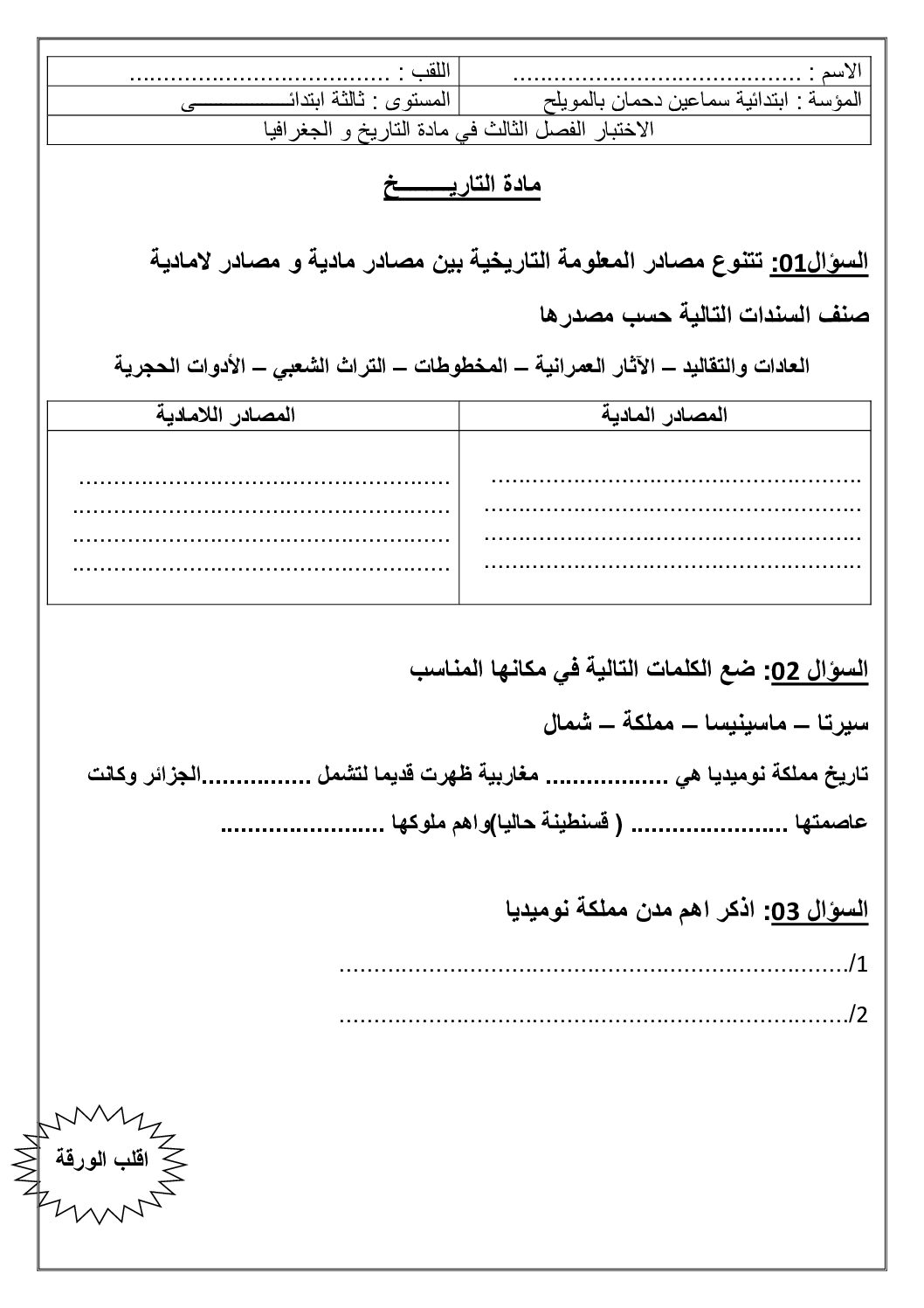 إختبار الفصل الأول في التاريخ والجغرافيا السنة الثالثة ابتدائي رقم 102