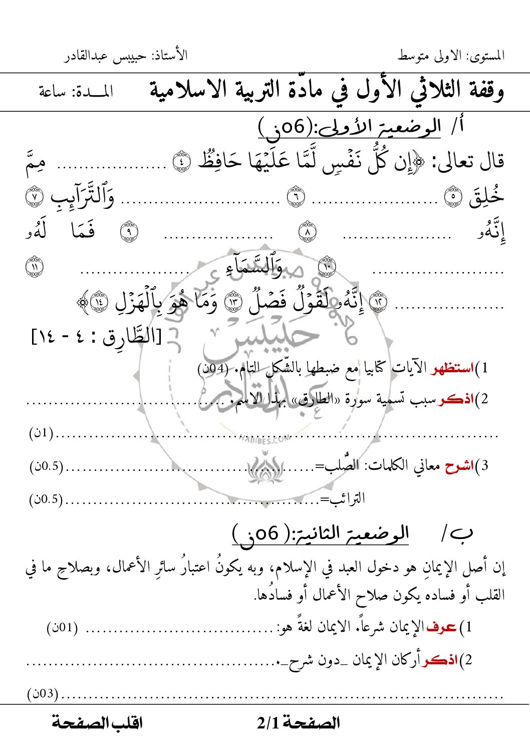 مادة التربية الإسلامية للسنة الأولى 1 متوسط دروس مفصلة، فروض واختبارات، تمارين محلولة: نموذج لإمتحان في الفصل الأول رقم 25- في مادة التربية الإسلامية مستوى السنة الأولى متوسط الجيل الثاني ، السنة الدراسية: 2025/2026 مع التصحيح يمكن تصفح الإختبار مباشرة عبر موقع الدراسة الجزائري أو تحميله مباشرة بصيغة PDF بالضغط أعلاه على: .: تحميل :. التربية الإسلامية السنة الأولى متوسط