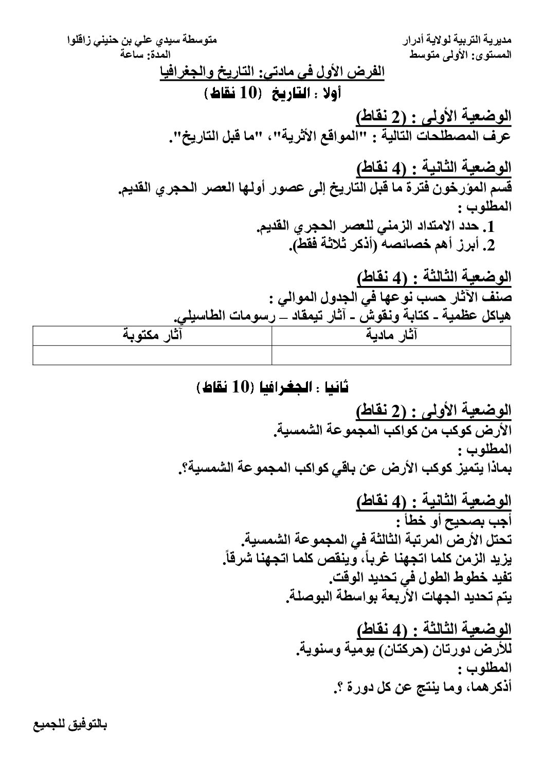 اختبار في التاريخ والجغرافيا الفصل الأول السنة الأولى متوسط رقم 48 مع التصحيح