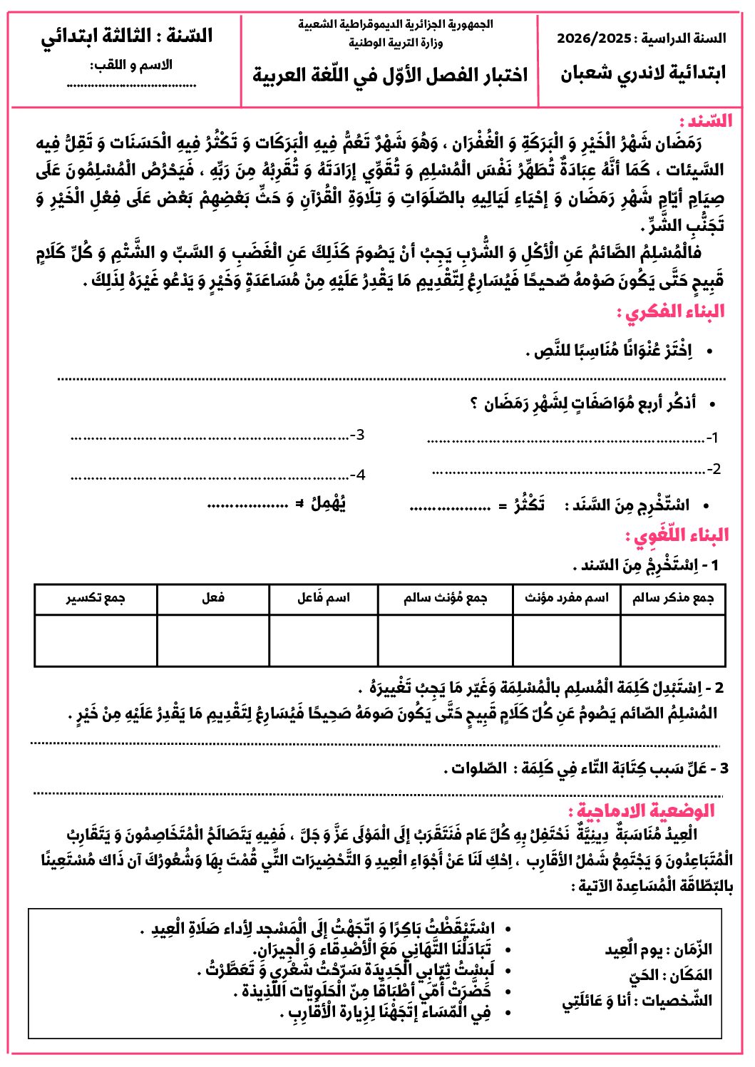 مادة اللغة العربية للسنة الثالثة ابتدائي : نموذج لإمتحان في الفصل الأول رقم 165- في مادة اللغة العربية مستوى السنة الثالثة ابتدائي الجيل الثاني ، السنة الدراسية: 2025/2026 مع التصحيح يمكن تصفح الإختبار مباشرة عبر موقع الدراسة الجزائري أو تحميله مباشرة بصيغة PDF بالضغط أعلاه على: .: تحميل :. اللغة العربية السنة الثالثة ابتدائي
