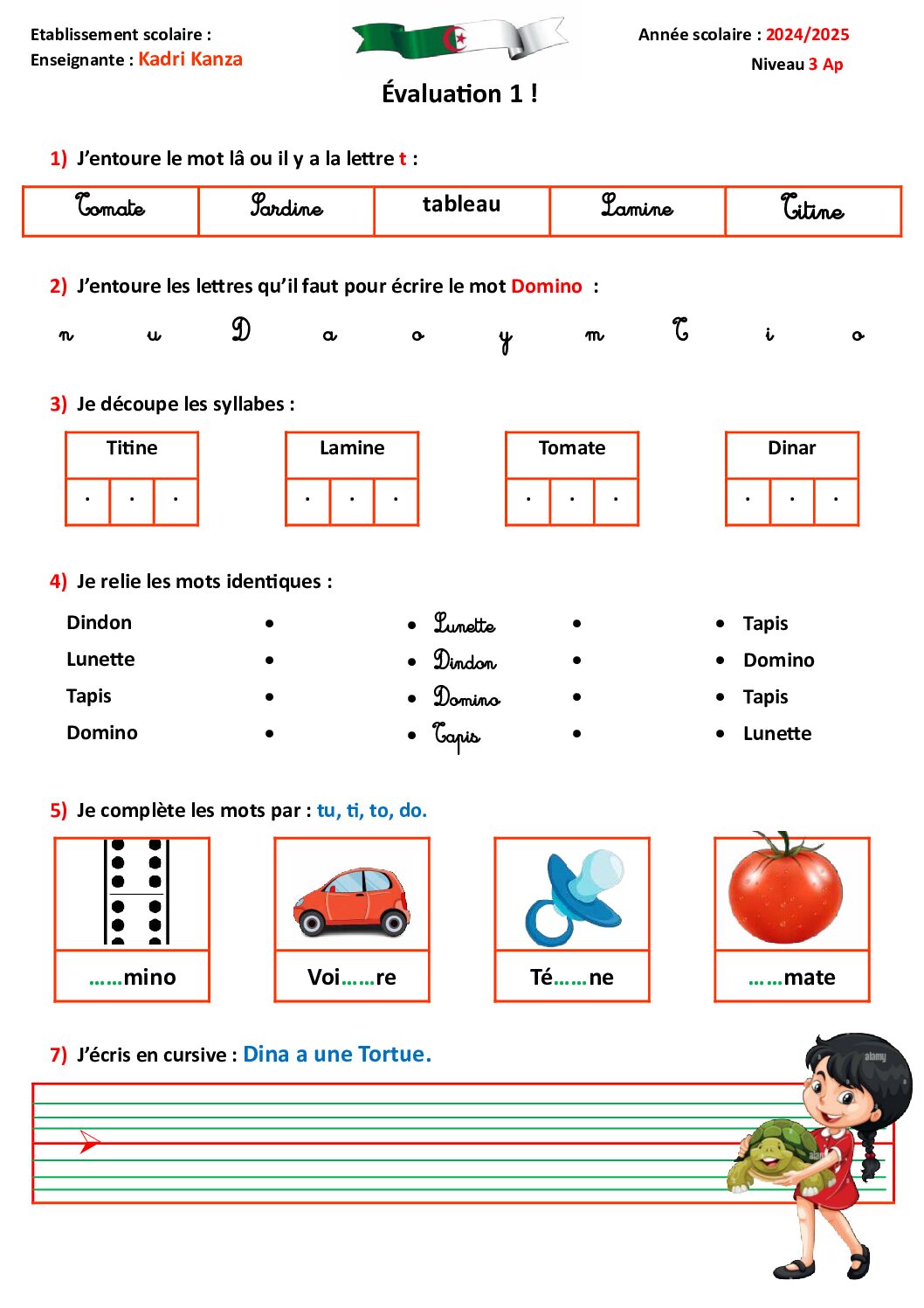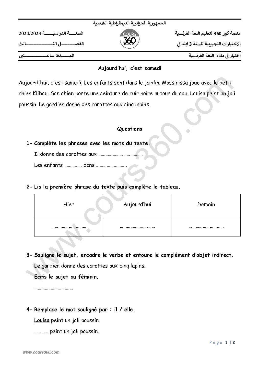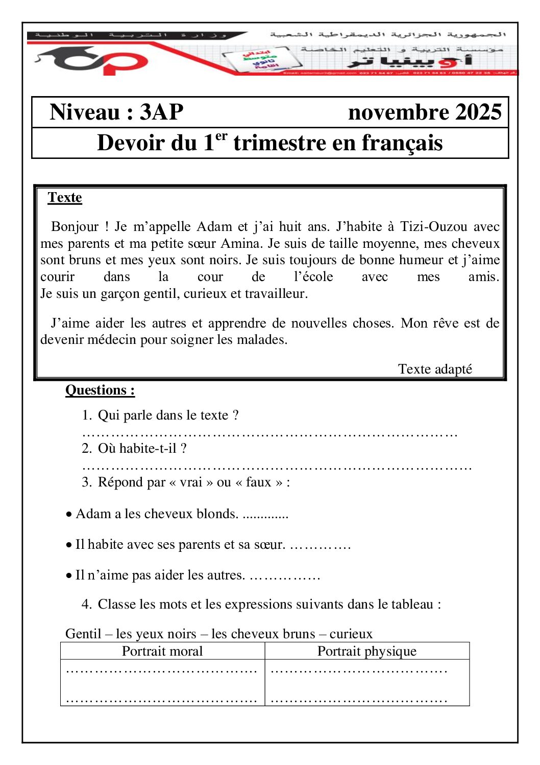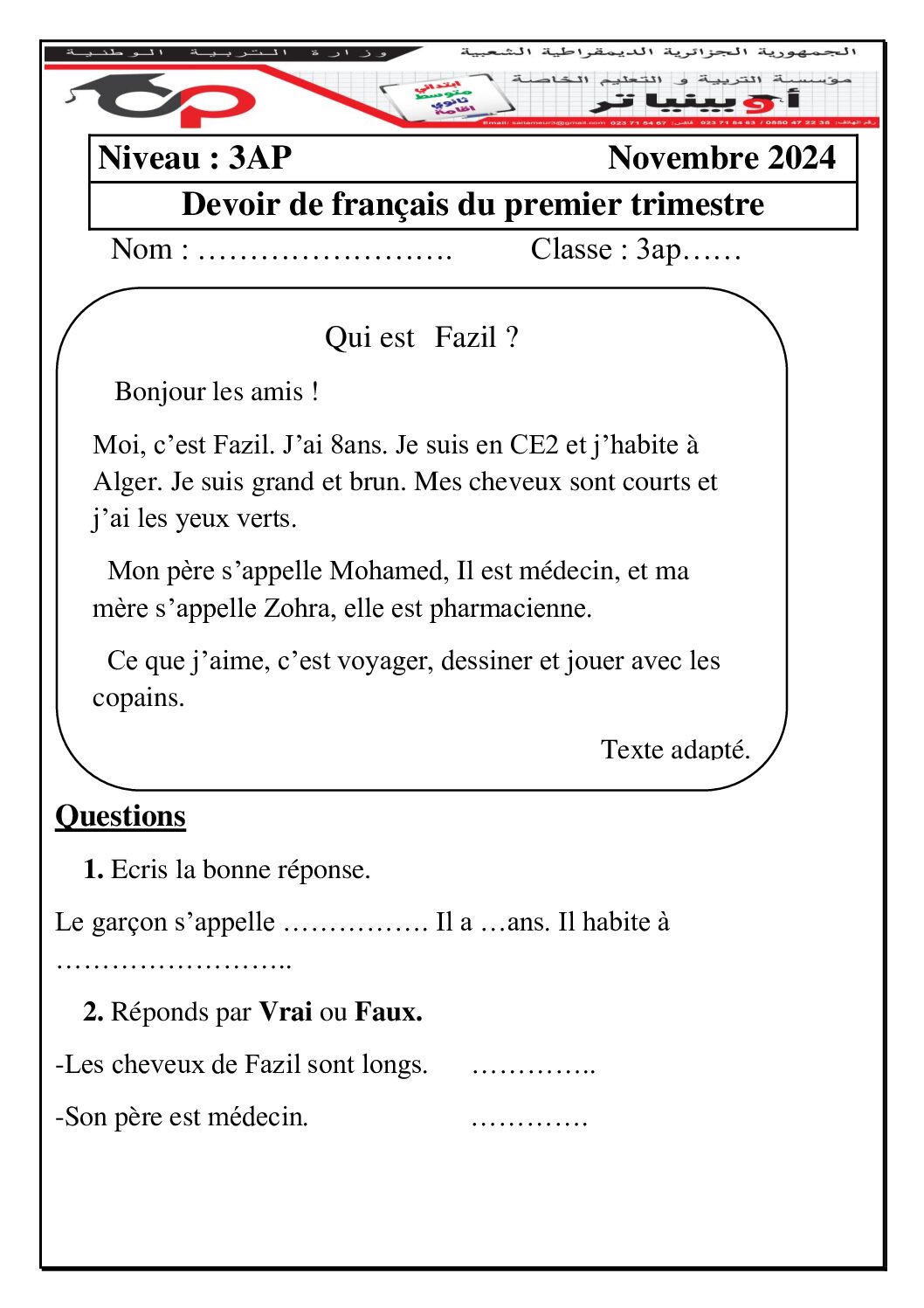 إختبار الفصل الأول في اللغة الفرنسية السنة الثالثة ابتدائي رقم 124 مع التصحيح