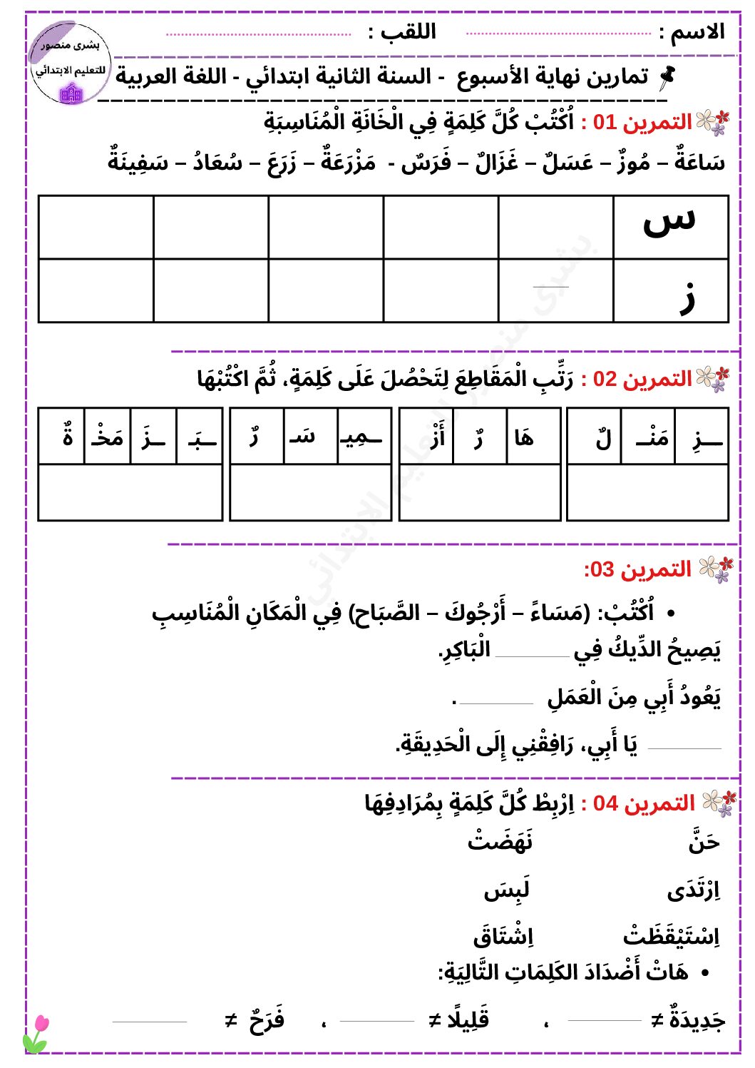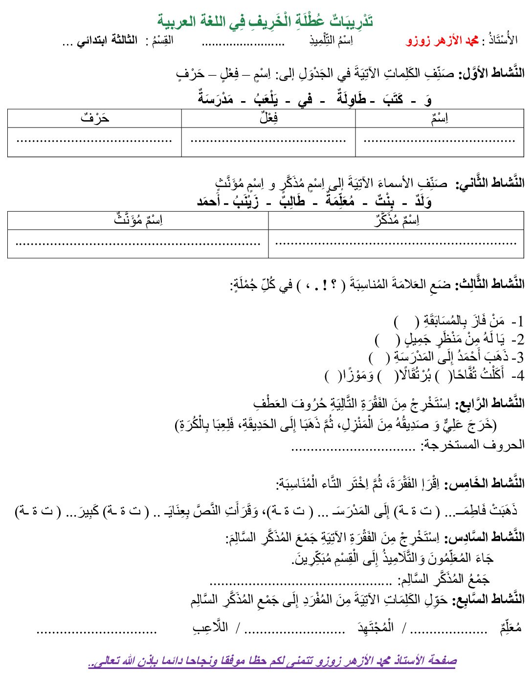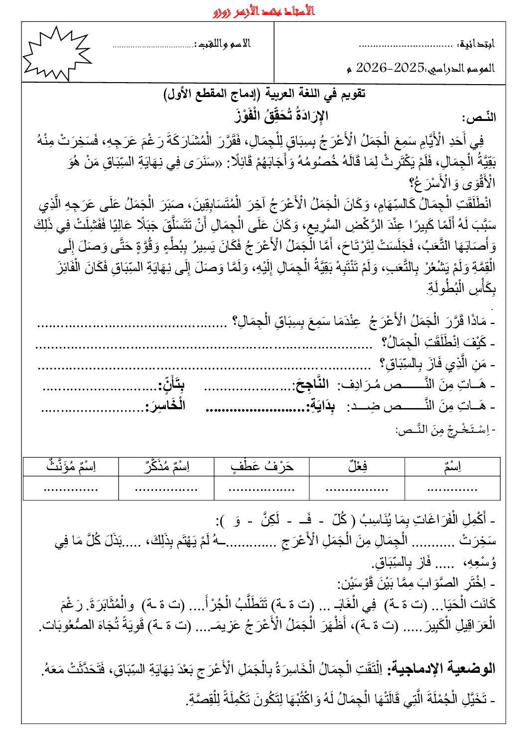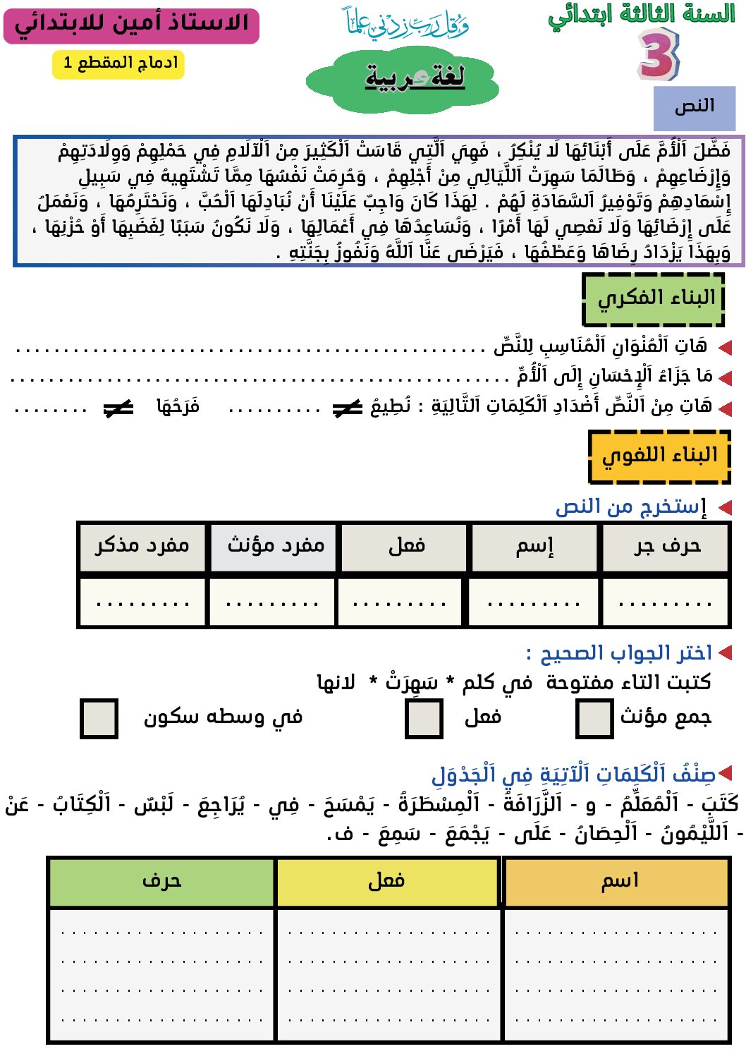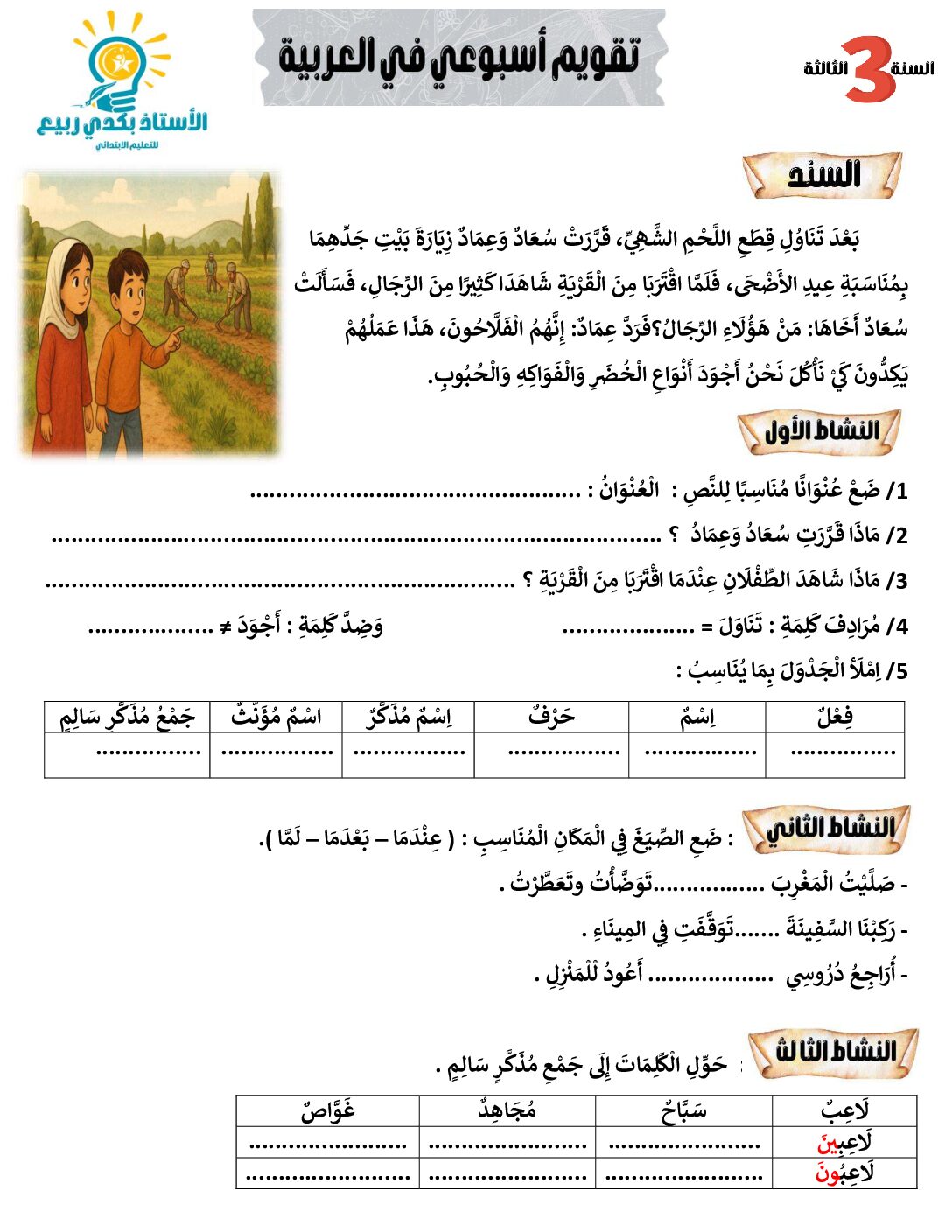 إختبار الفصل الأول في اللغة العربية السنة الثالثة ابتدائي رقم 133