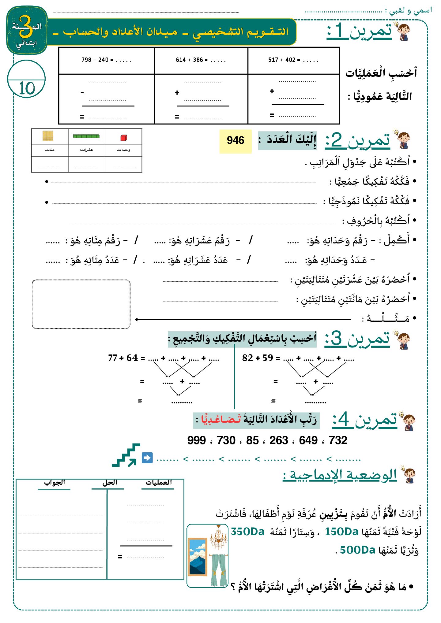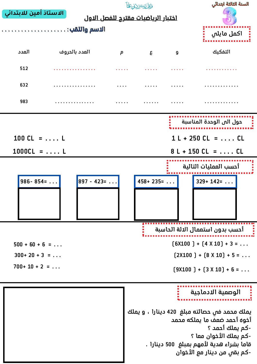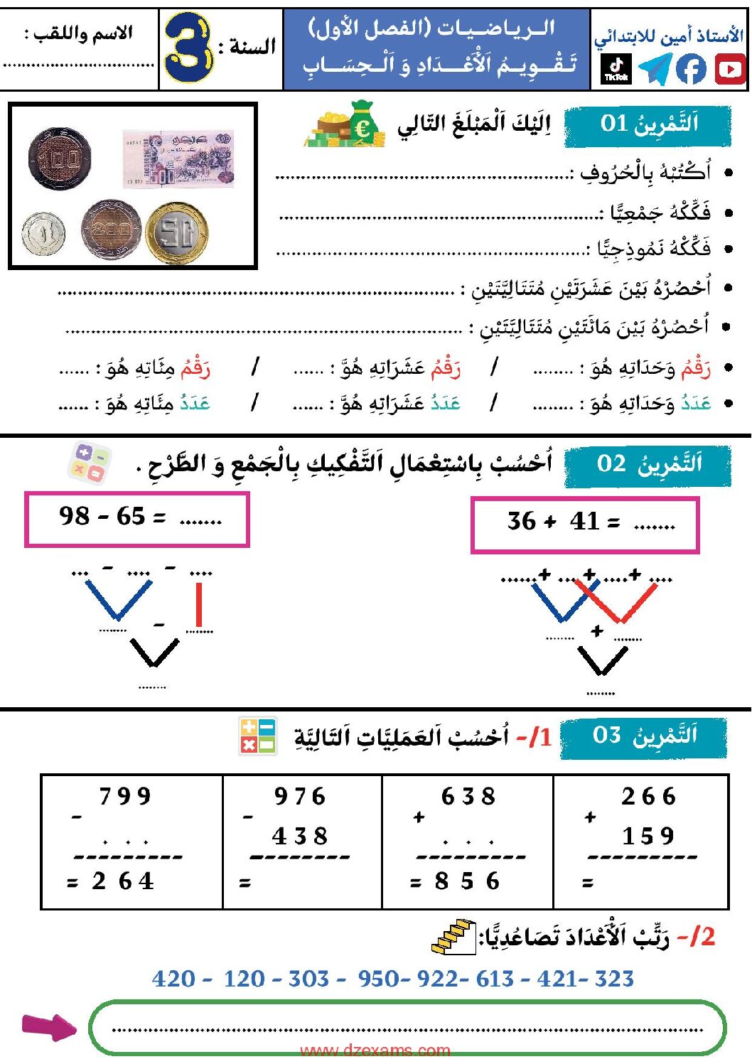 إختبار الفصل الأول في الرياضيات السنة الثالثة ابتدائي رقم 143