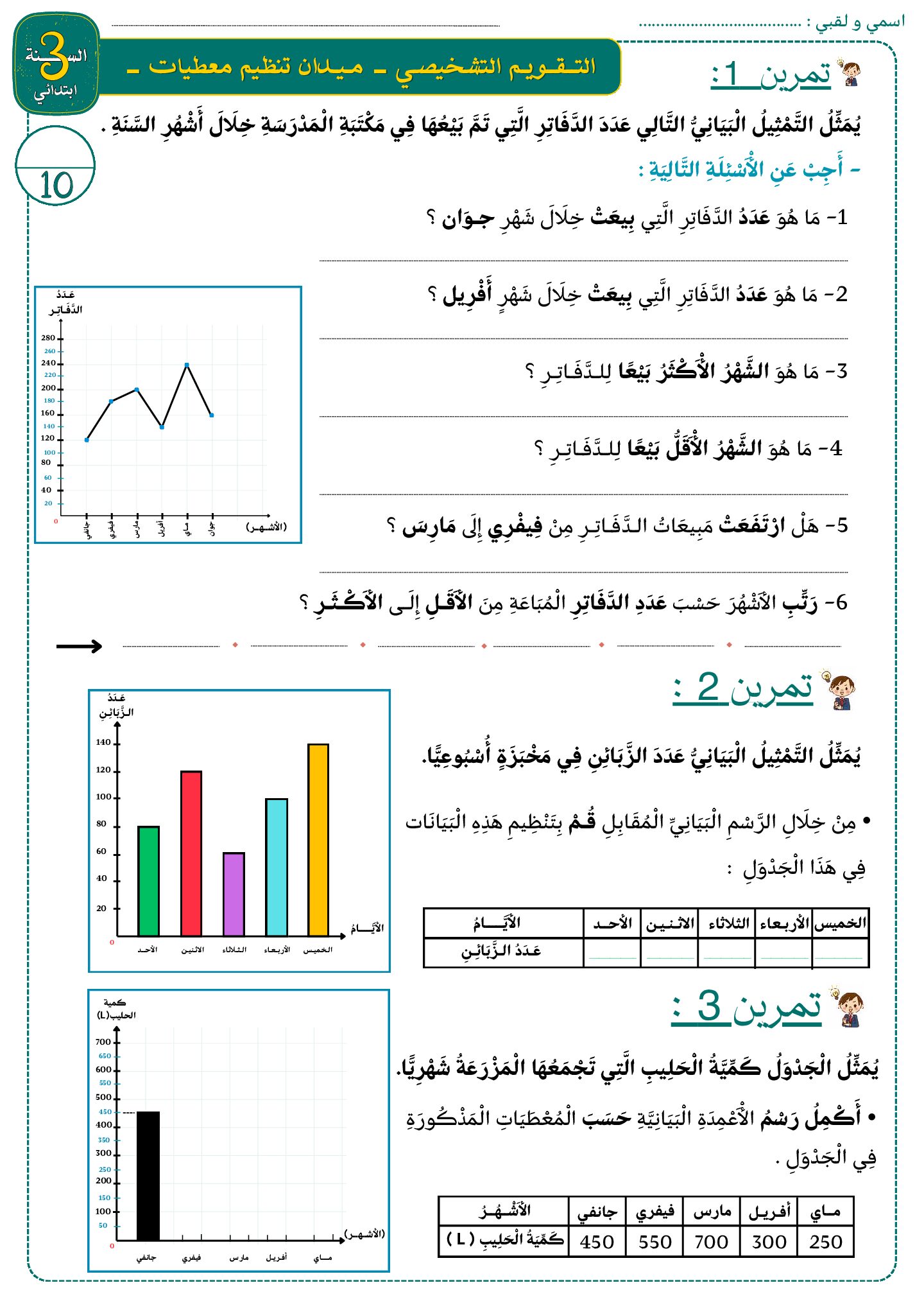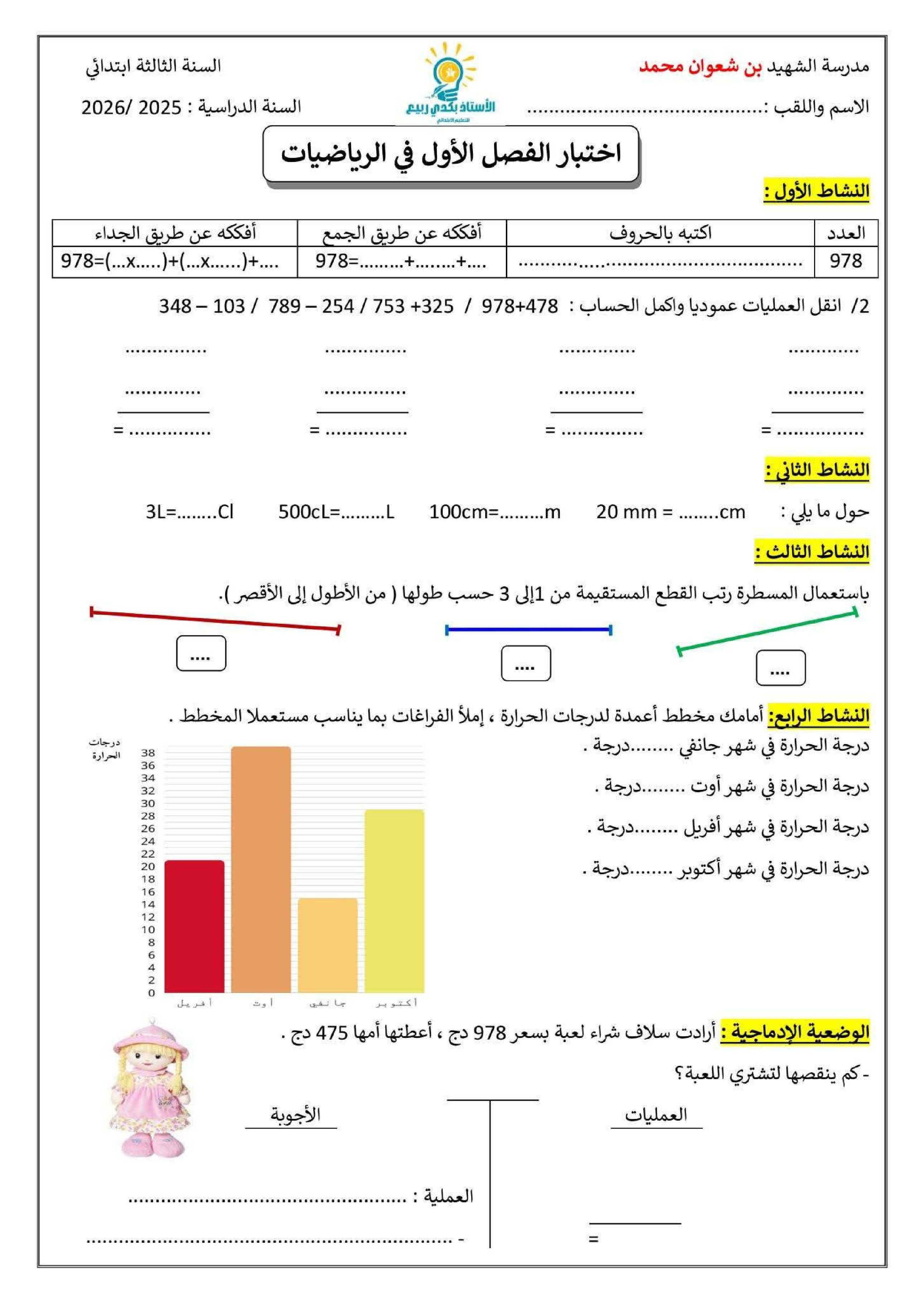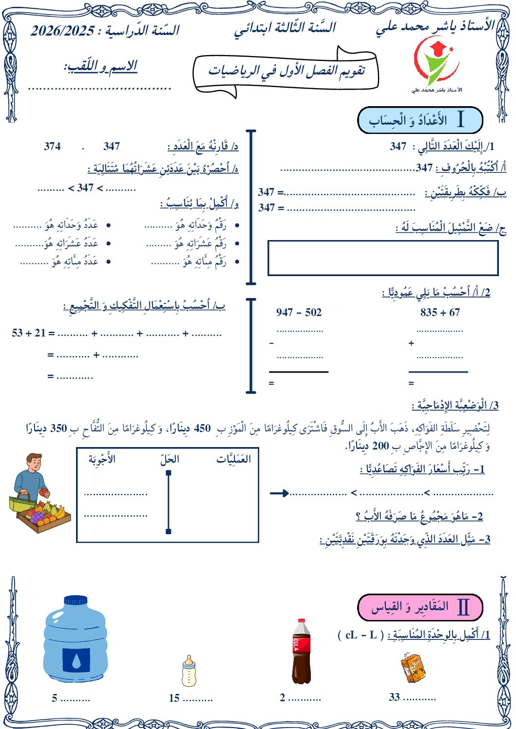 إختبار الفصل الأول في الرياضيات السنة الثالثة ابتدائي رقم 143
