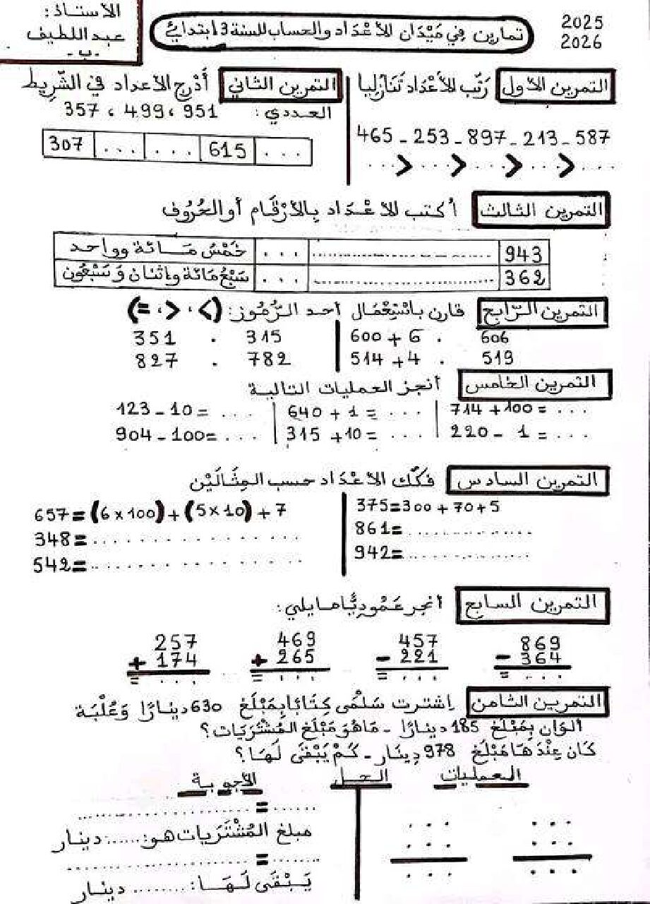 مادة الرياضيات للسنة الثالثة ابتدائي الجيل الثاني : نموذج لإمتحان في الفصل الأول رقم 139- في مادة الرياضيات مستوى السنة الثالثة ابتدائي الجيل الثاني ، السنة الدراسية: 2025/2026 مع التصحيح يمكن تصفح الإختبار مباشرة عبر موقع الدراسة الجزائري أو تحميله مباشرة بصيغة PDF بالضغط أعلاه على: .: تحميل :. الرياضيات السنة الثالثة ابتدائي