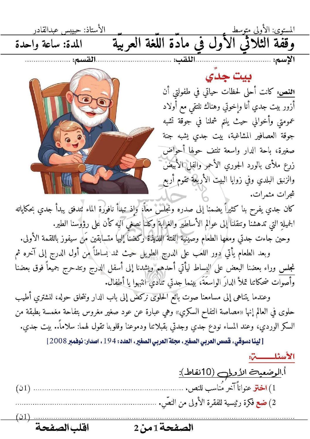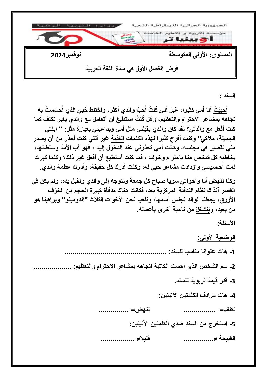 مادة اللغة العربية للسنة الأولى 1 متوسط دروس مفصلة، فروض واختبارات، تمارين محلولة: نموذج لإمتحان في الفصل الأول رقم 59- في مادة اللغة العربية مستوى السنة الأولى متوسط الجيل الثاني ، السنة الدراسية: 2025/2026 مع التصحيح يمكن تصفح الاختبار مباشرة عبر موقع الدراسة الجزائري أو تحميله مباشرة بصيغة PDF بالضغط أعلاه على: .: تحميل :. اللغة العربية السنة الأولى متوسط