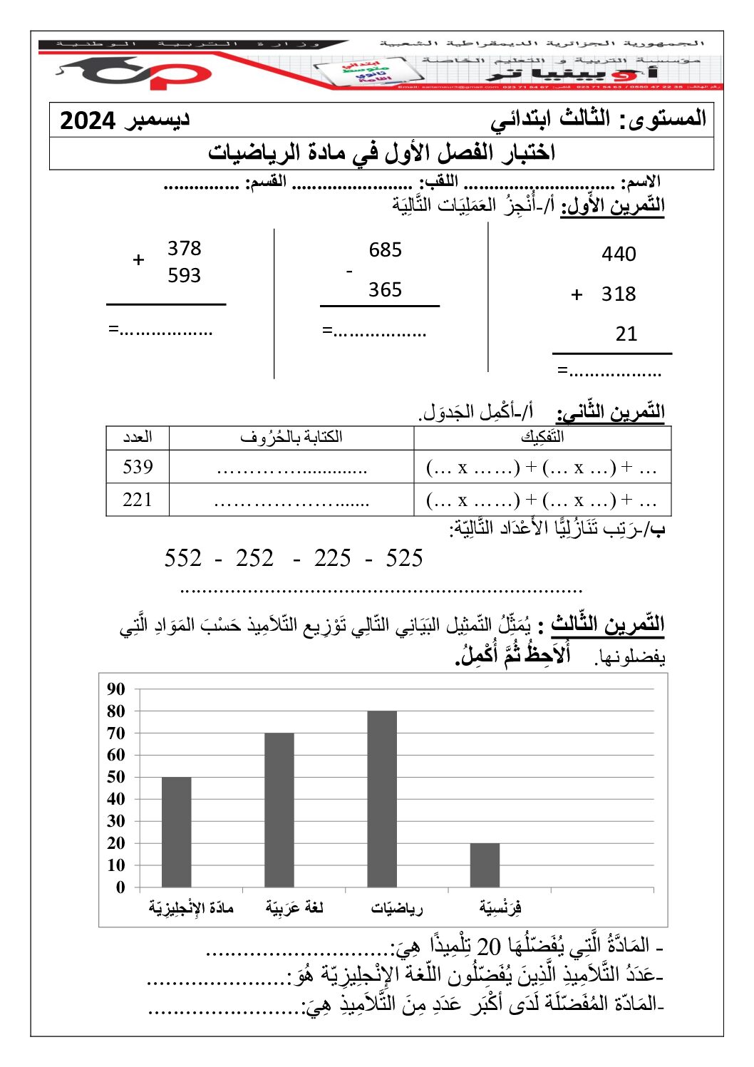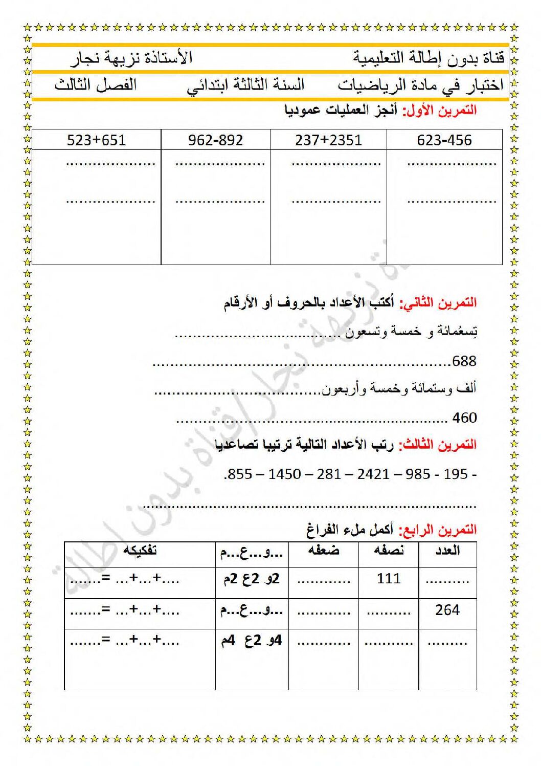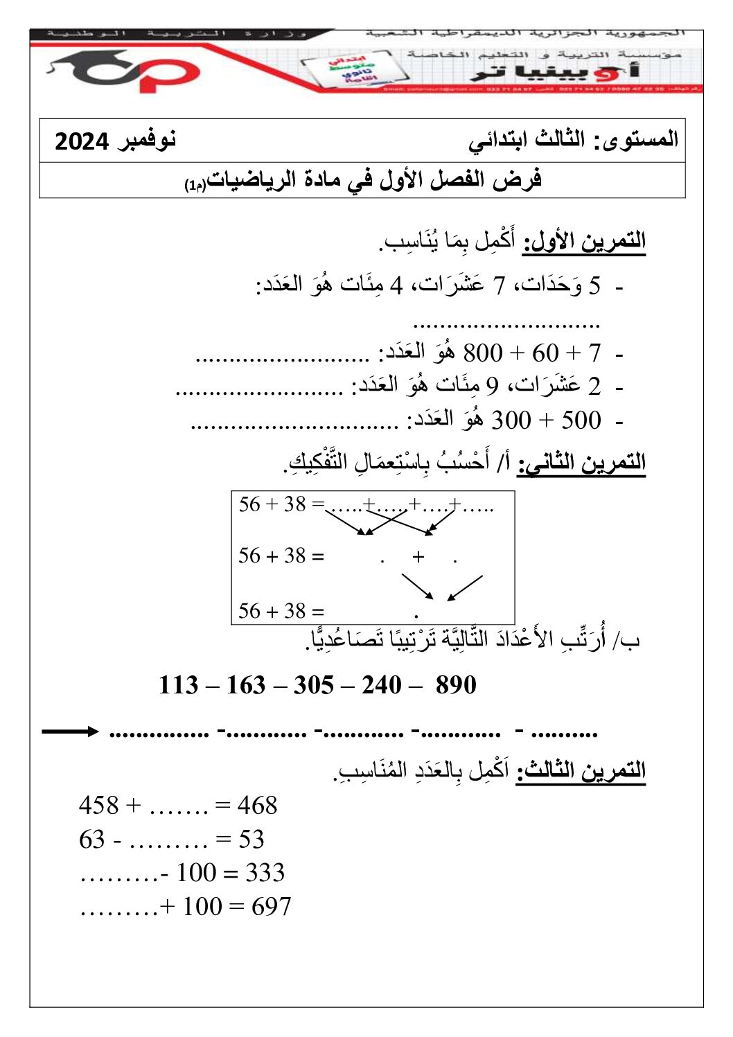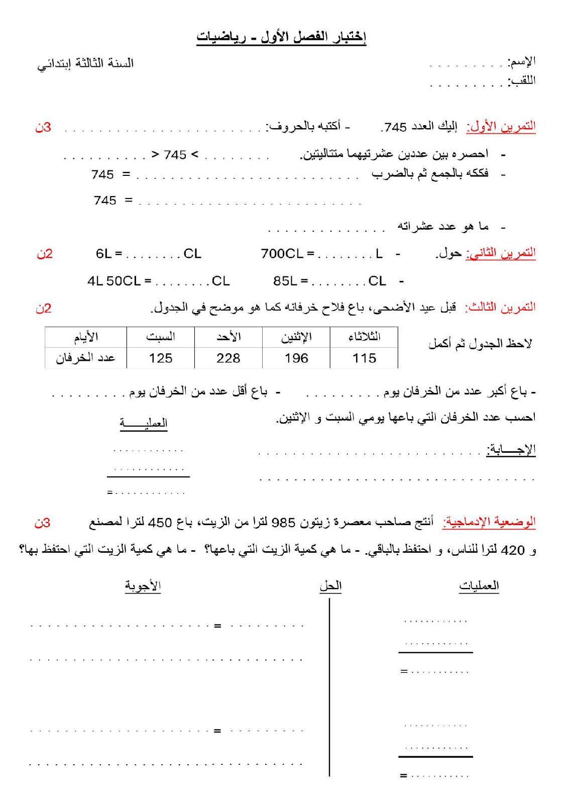 إختبار الفصل الأول في الرياضيات السنة الثالثة ابتدائي رقم 106 مع التصحيح
