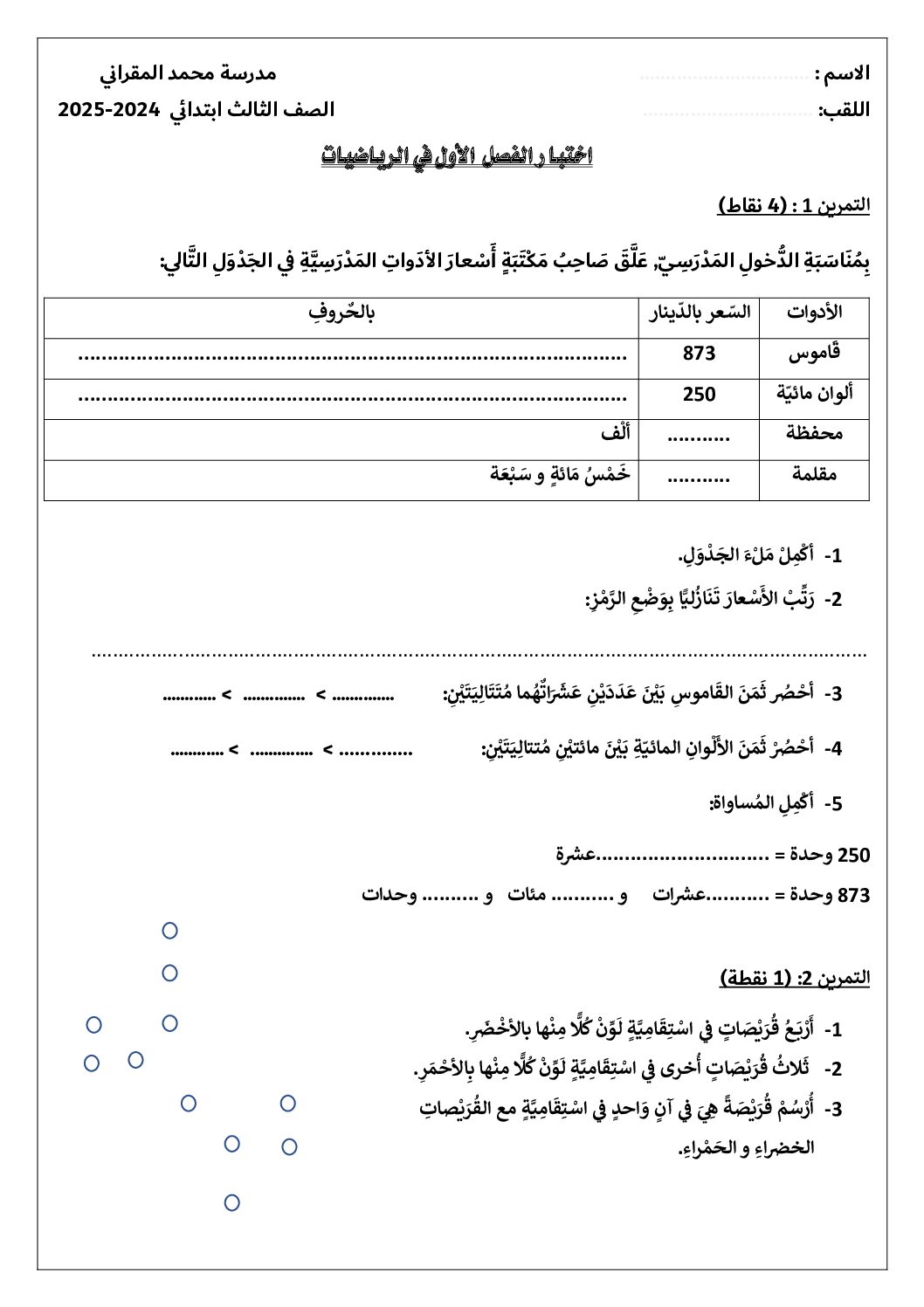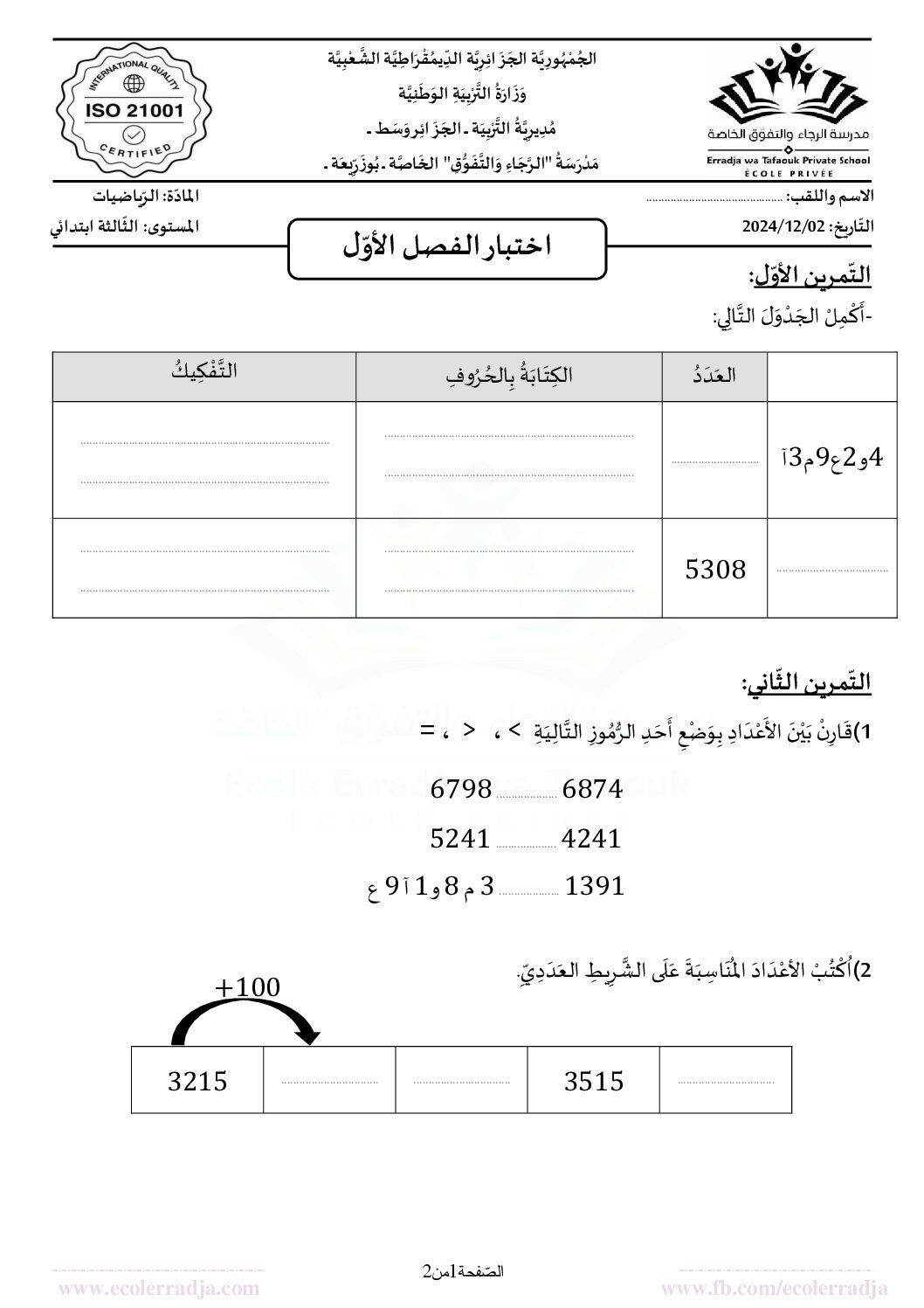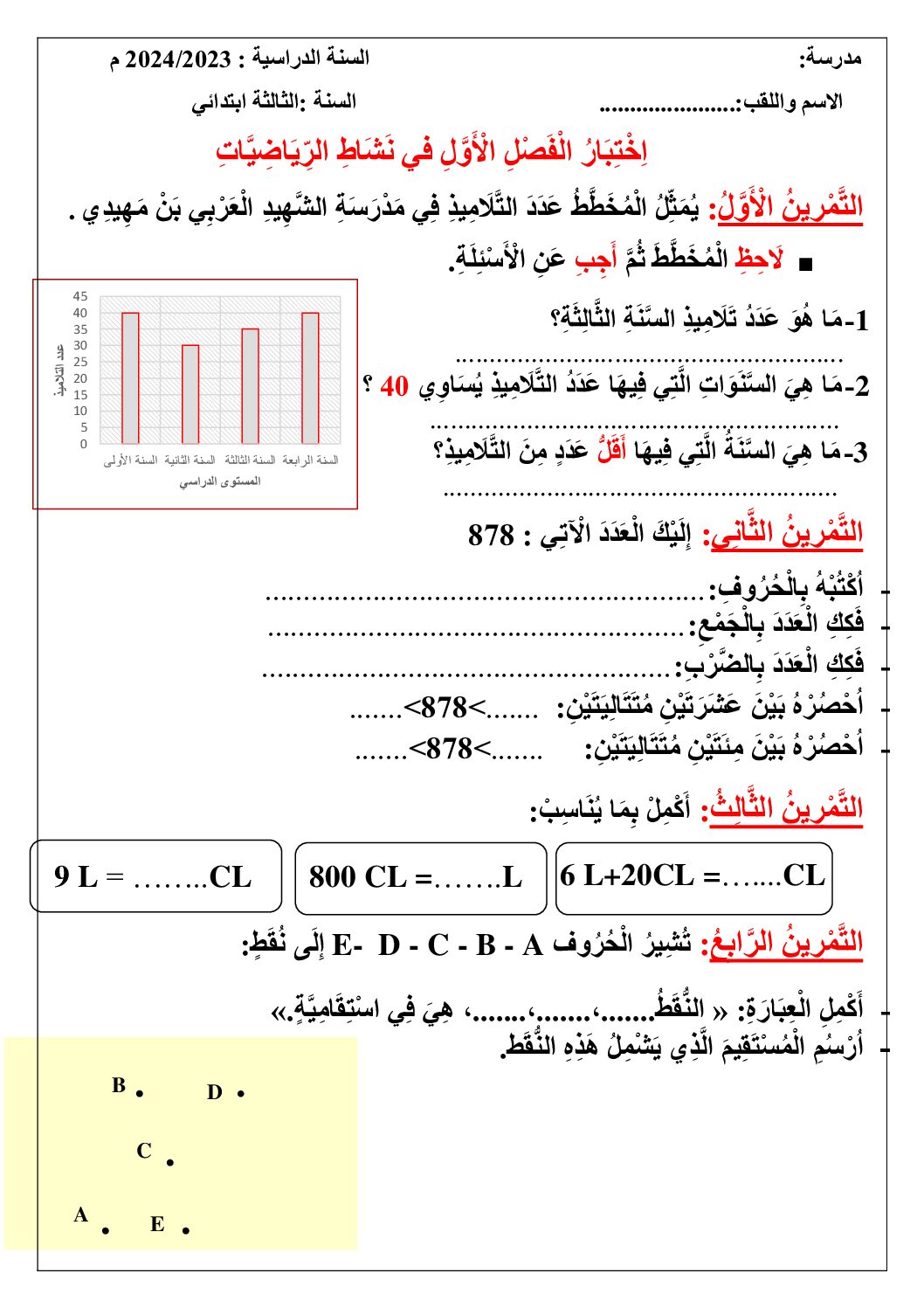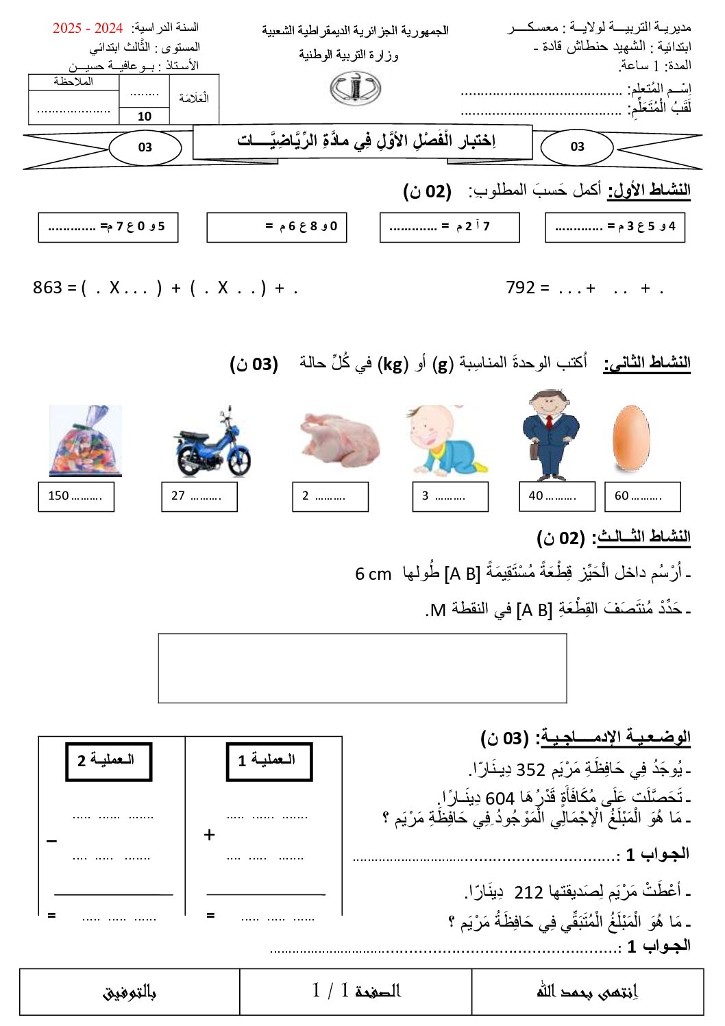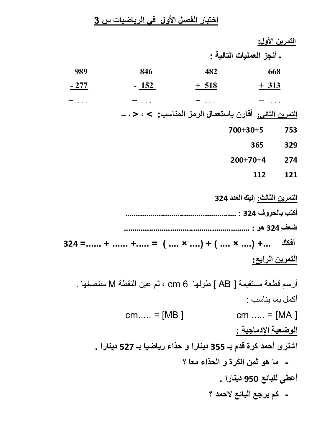 إختبار الفصل الأول في الرياضيات السنة الثالثة ابتدائي رقم 106 مع التصحيح