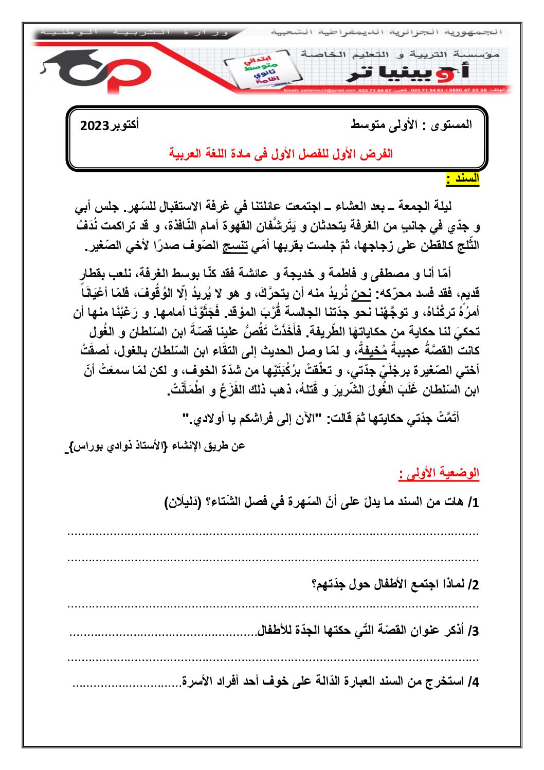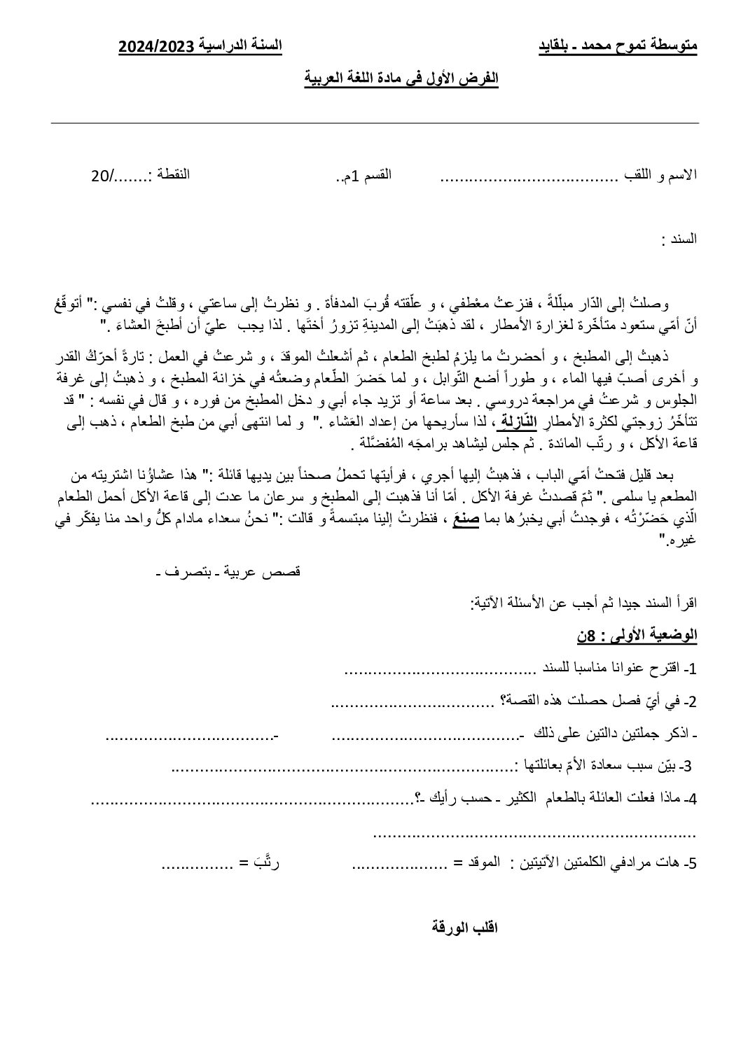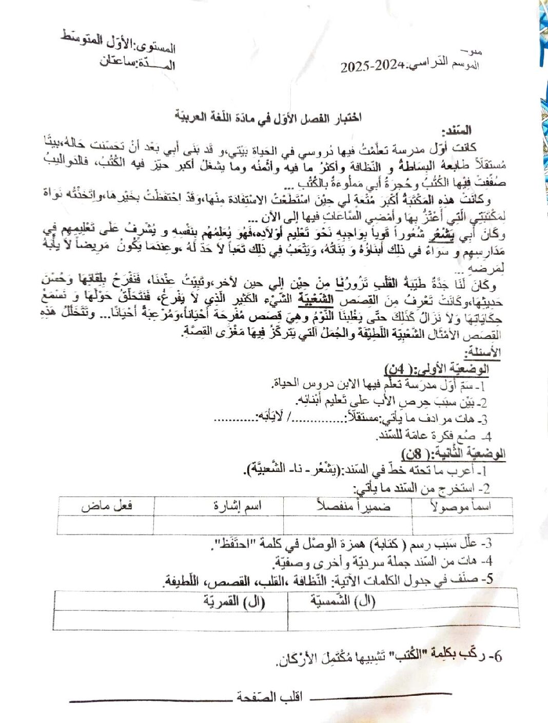 اختبار في اللغة العربية الفصل الأول السنة الأولى متوسط رقم 74 مع التصحيح