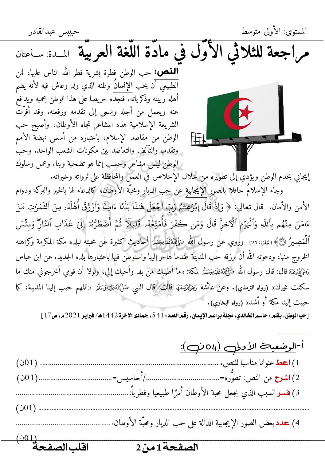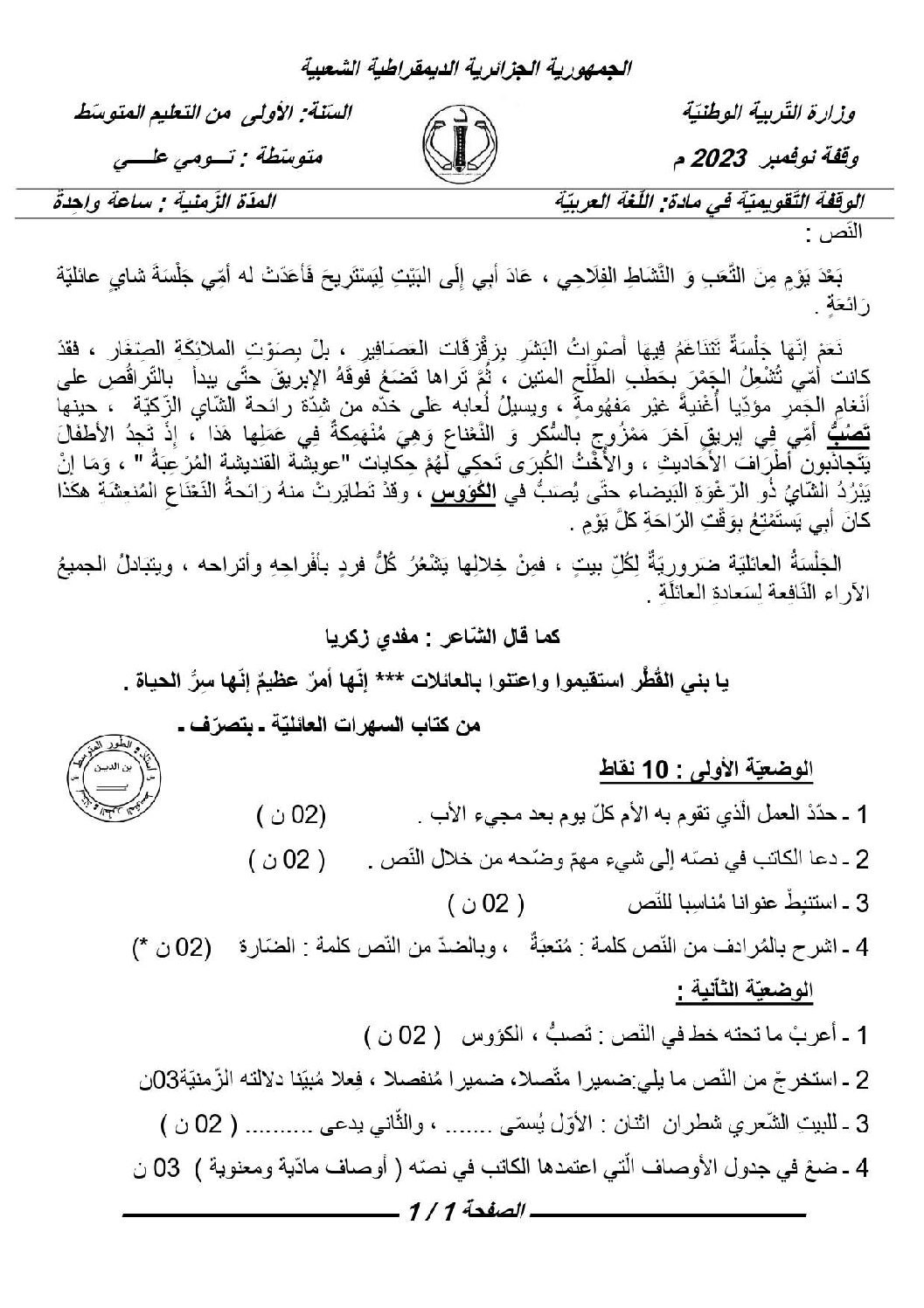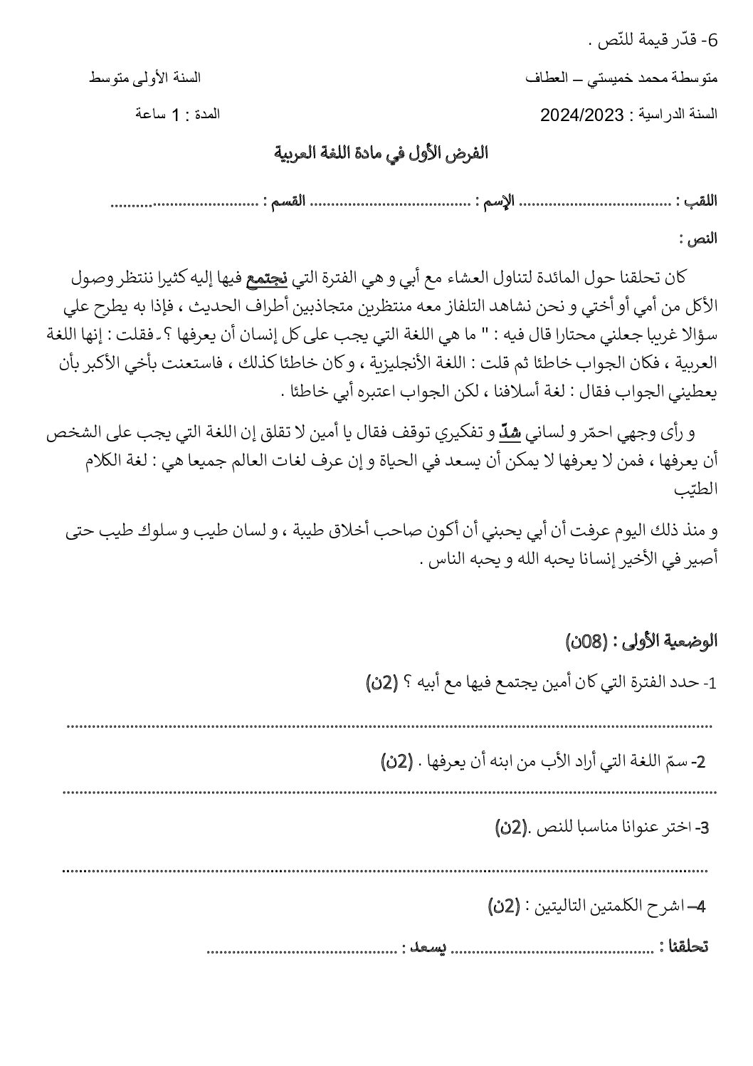 اختبار في اللغة العربية الفصل الأول السنة الأولى متوسط رقم 74 مع التصحيح