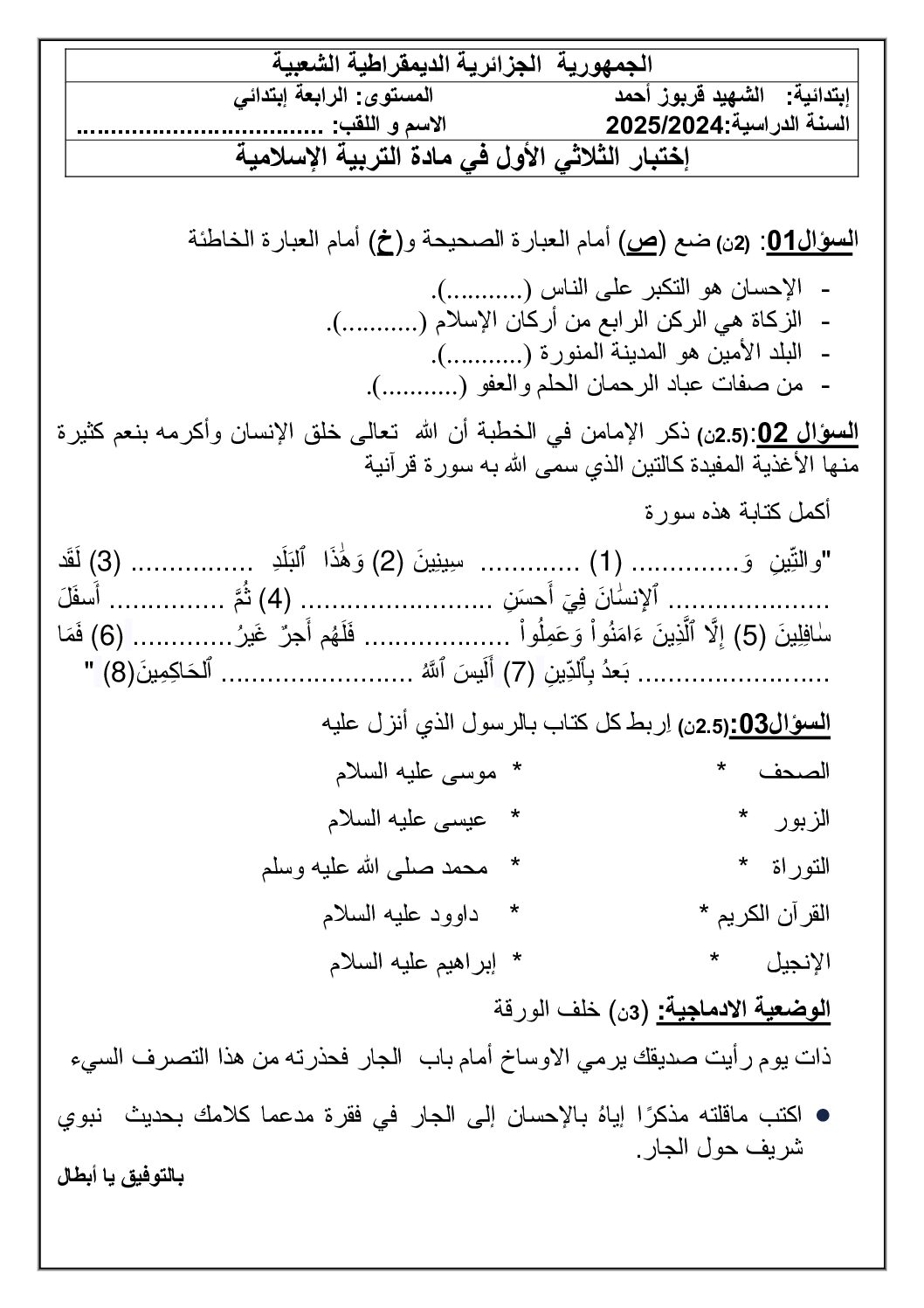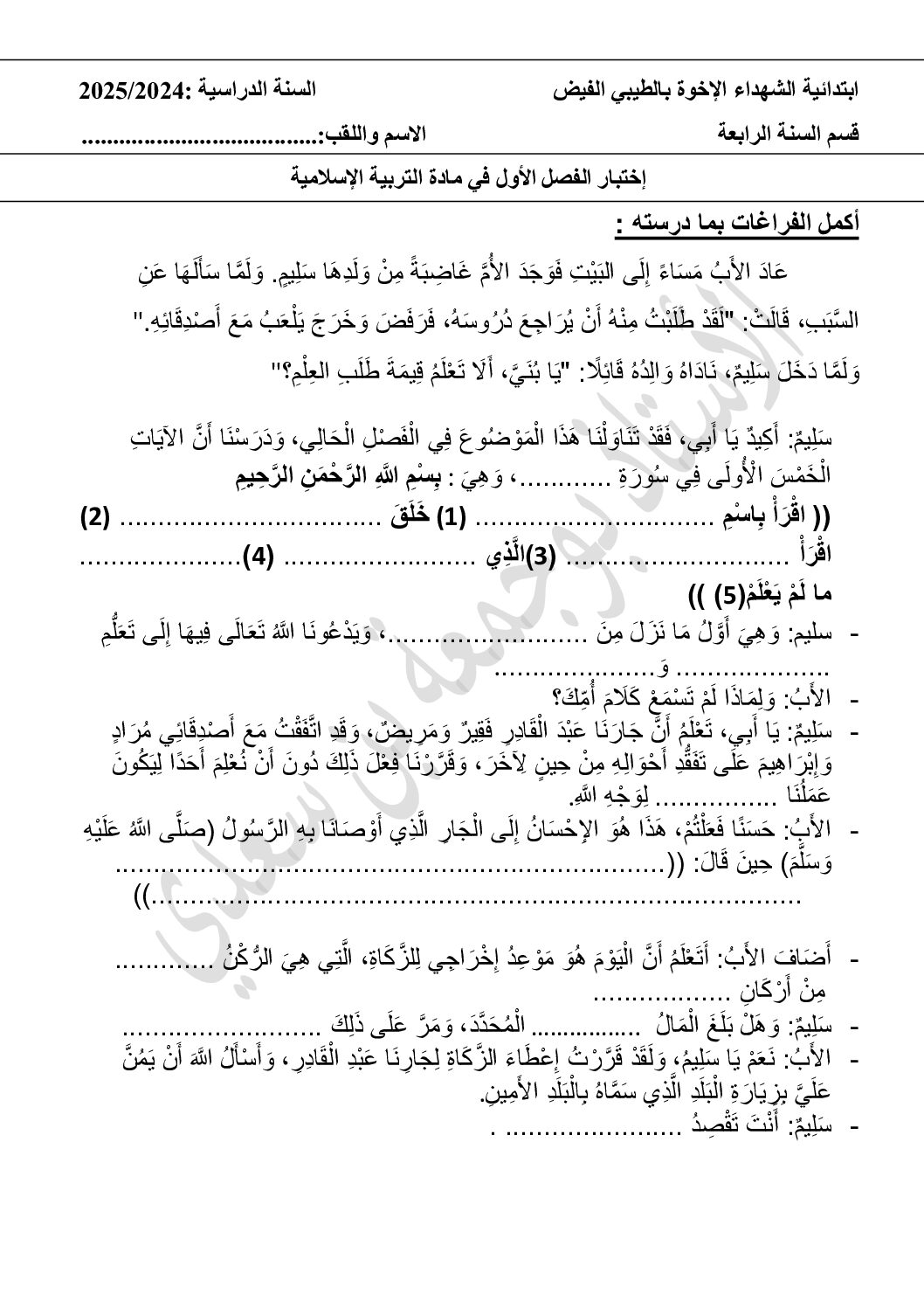 إختبار الفصل الأول في التربية الإسلامية السنة الرابعة ابتدائي رقم 73