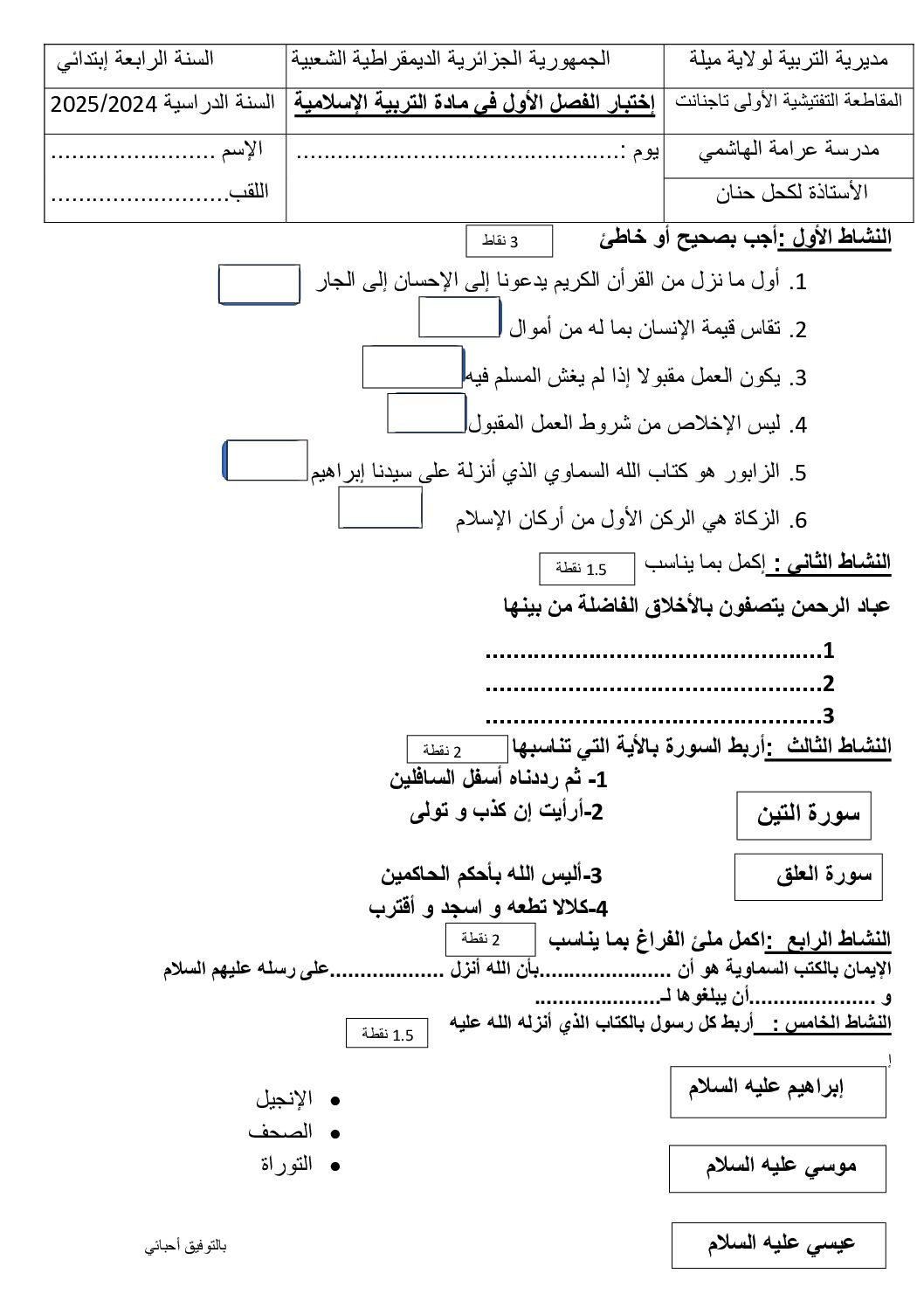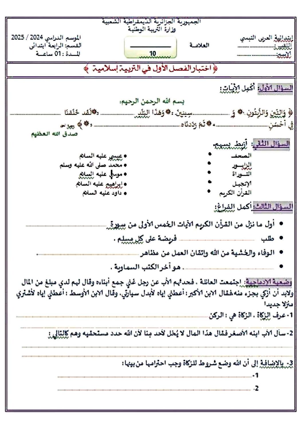 إختبار الفصل الأول في التربية الإسلامية السنة الرابعة ابتدائي رقم 63