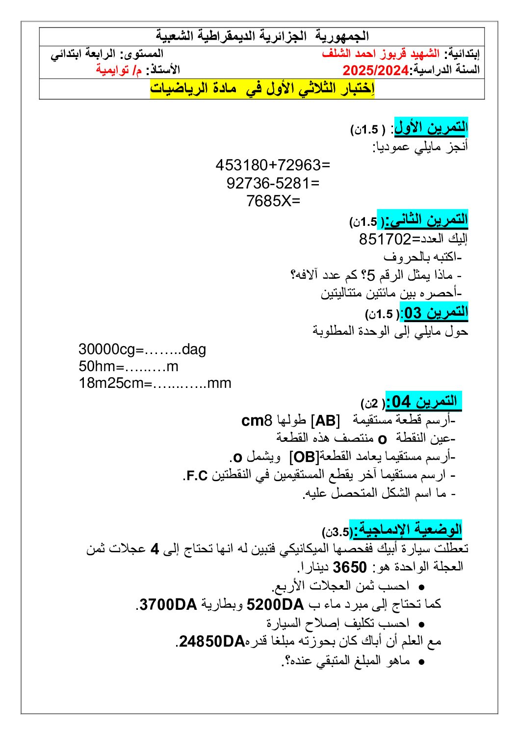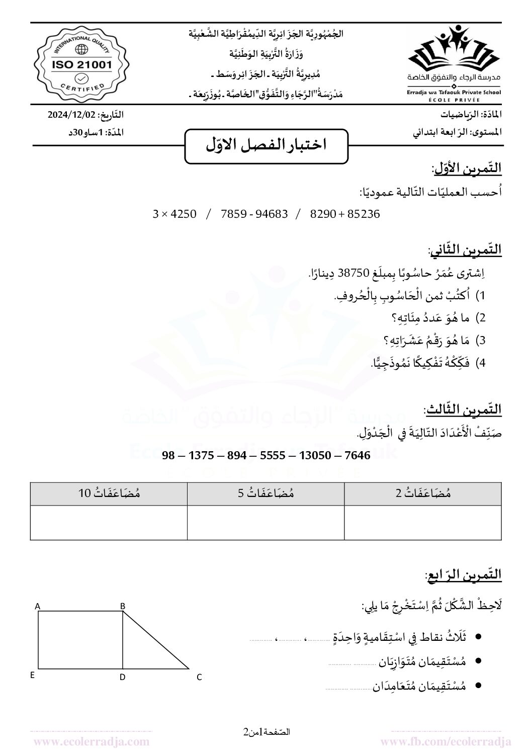 أكمل القراءة »إختبار الفصل الأول في الرياضيات السنة الرابعة ابتدائي رقم 112 مع التصحيح