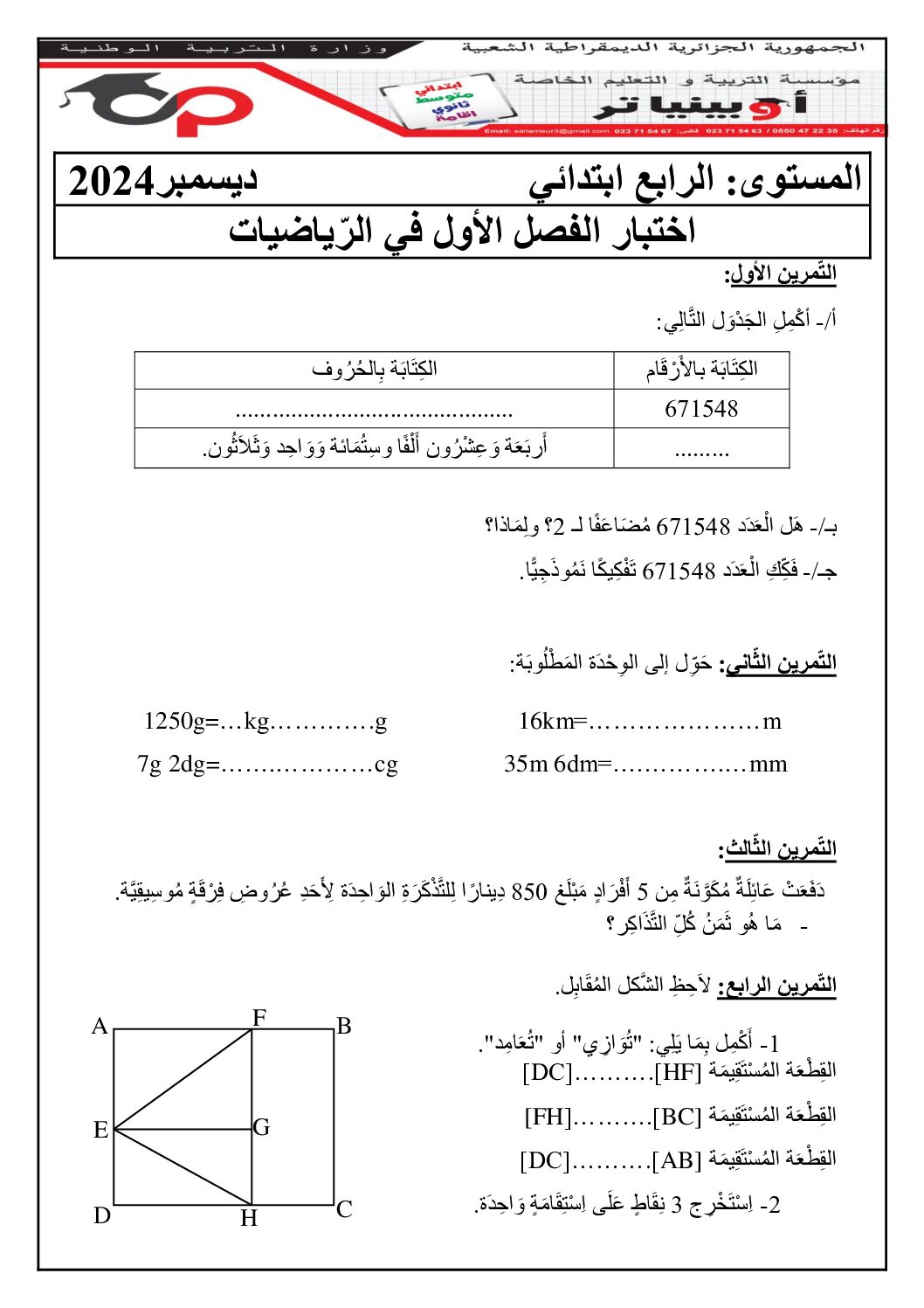 مادة الرياضيات للسنة الرابعة ابتدائي : نموذج لإمتحان في الفصل الأول رقم 114- في مادة الرياضيات مستوى السنة الرابعة ابتدائي الجيل الثاني ، السنة الدراسية: 2025/2026 مع التصحيح يمكن تصفح الإختبار مباشرة عبر موقع الدراسة الجزائري أو تحميله مباشرة بصيغة PDF بالضغط أعلاه على: .: تحميل :. الرياضيات السنة الرابعة ابتدائي