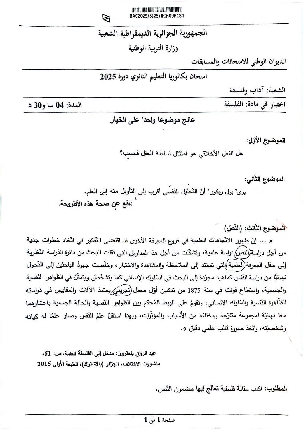موضوع امتحان بكالوريا دورة جوان 2025 BAC : شعبة: آداب وفلسفة، موضوع اختبار مادة الفلسفة لبكالوريا 2025: