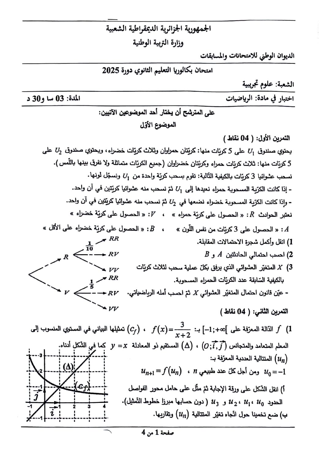 موضوع امتحان بكالوريا دورة جوان 2025 BAC : شعبة: علوم تجريبية، موضوع اختبار مادة الرياضيات لبكالوريا 2025:
