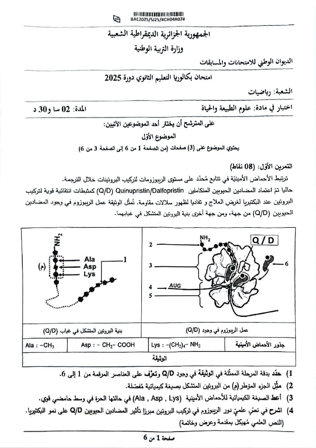 موضوع امتحان بكالوريا دورة جوان 2025 BAC : شعبة: رياضيات، موضوع اختبار مادة علوم الطبيعة والحياة لبكالوريا 2025 :