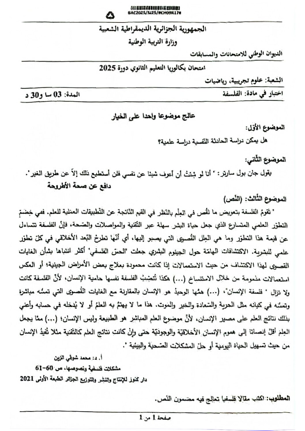 موضوع امتحان بكالوريا دورة جوان 2025 BAC : شعبة: علوم تجريبية، رياضيات، موضوع اختبار مادة الفلسفة لبكالوريا 2025: