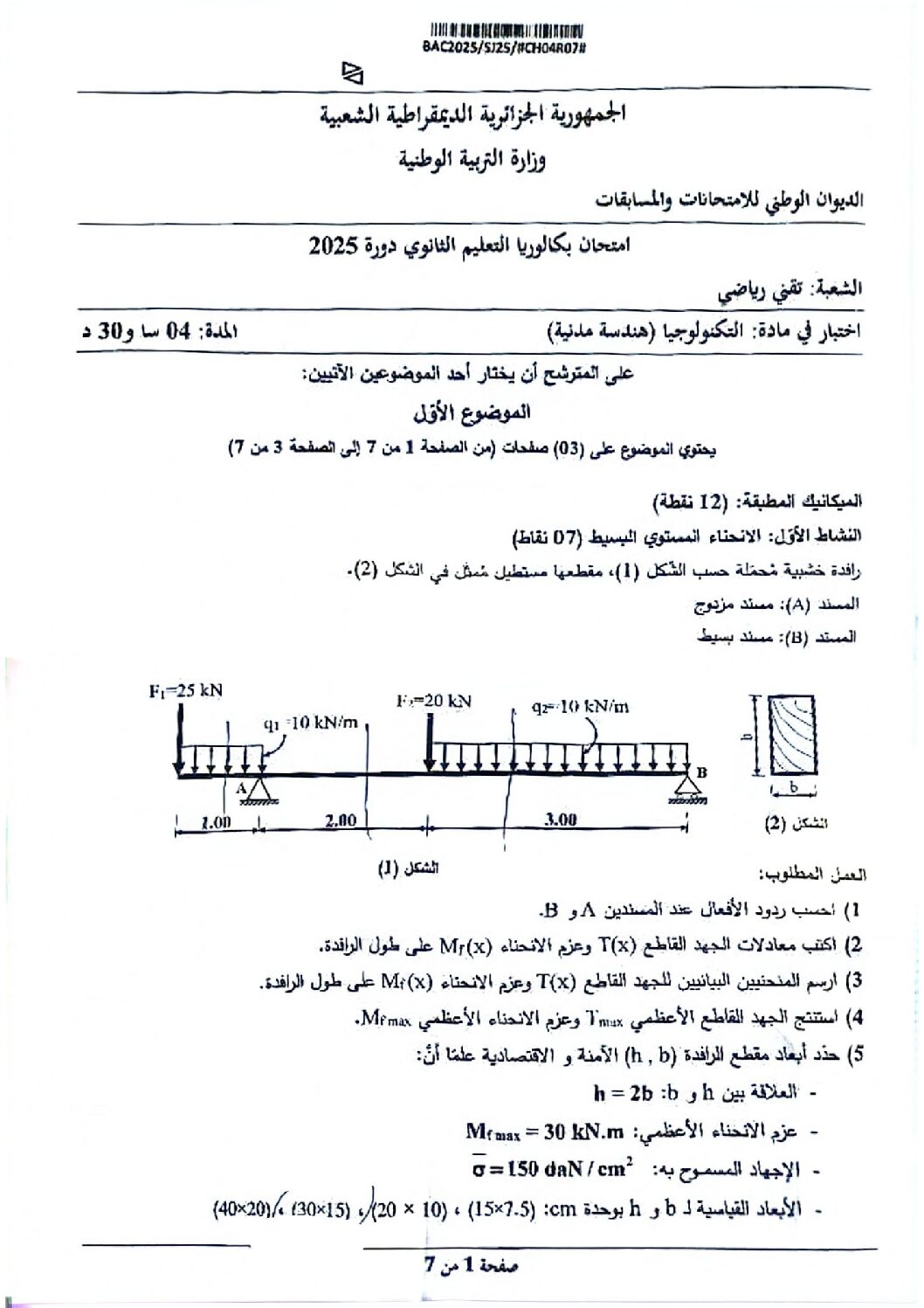 موضوع امتحان بكالوريا دورة جوان 2025 BAC : شعبة: تقني رياضي، موضوع اختبار مادة التكنولوجيا الهندسة المدنية لبكالوريا 2025: