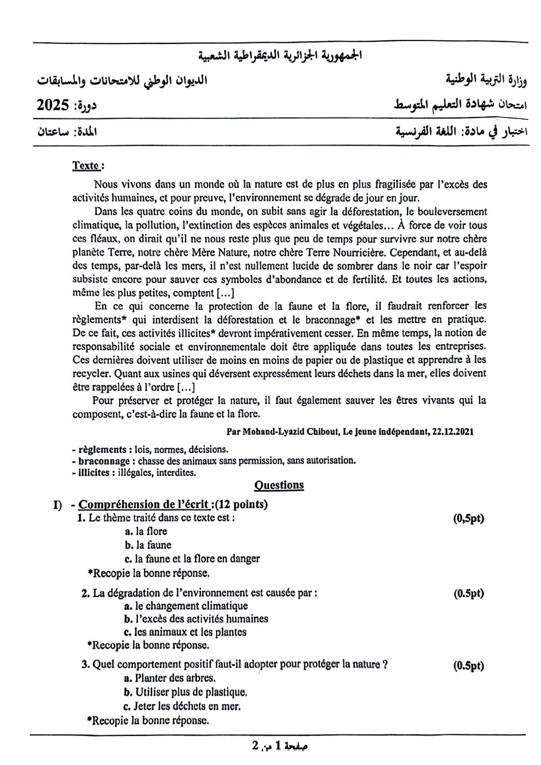 موضوع اللغة الفرنسية شهادة التعليم المتوسط 2025