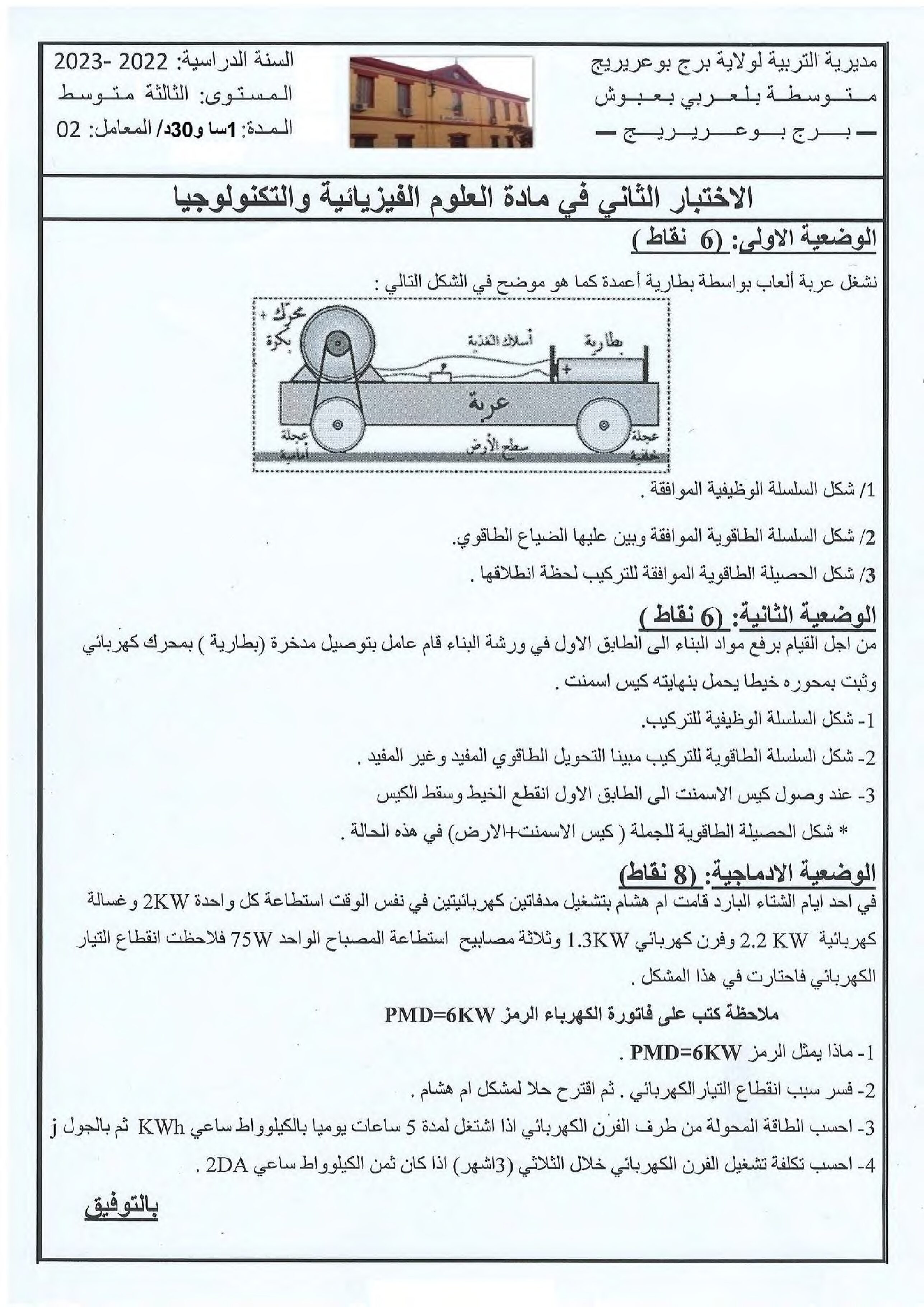فرض في العلوم الفيزيائية الفصل الثاني السنة الثالثة متوسط رقم 62