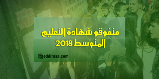 أعلن الديوان الوطني للإمتحانات و المسابقات يوم 18 جوان 2018 عن نتائج شهادة التعليم المتوسط لسنة 2018 و التي بلغت نسبة النجاح فيها 56,88 بالمئة حسب ما صرحت به وزيرة التربية الوطنية نورية بن غبريت. وقد جاءت في قائمة متفوقي شهادة التعليم المتوسط 2018 التلميذ ….. من متوسطة ….. و فيما يلي بعض متفوقي شهادة التعليم المتوسط لسنة 2018 الحاصلين على معدل …