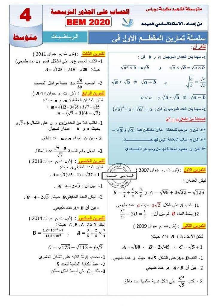 أكمل القراءة »سلسلة تمارين الحساب الحرفي في الرياضيات للاستاذ بوطبيبة 4 متوسط