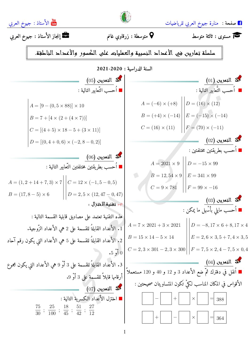 25 سؤال مرفق بالحل في الباب الأول الأعداد النسبية في الرياضيات 3 متوسط