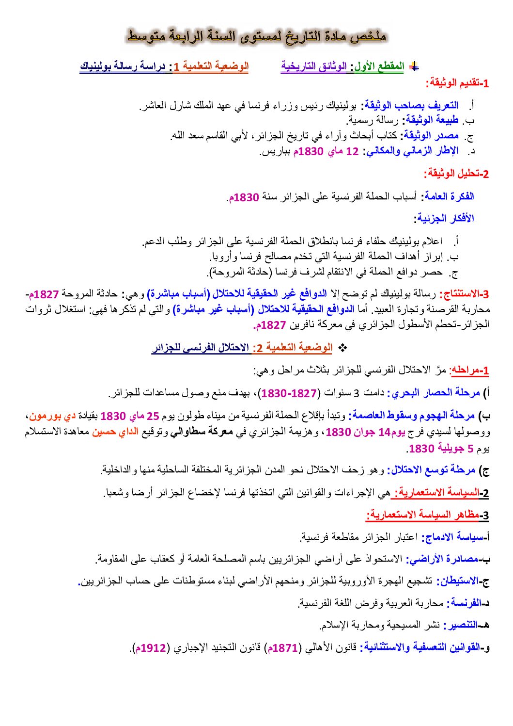 ملخص مادة التاريخ للأستاذ بولمداود هشام 4 متوسط